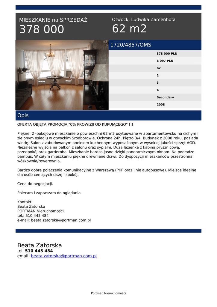 Otwock, Ludwika Zamenhofa MIESZKANIE na SPRZEDAŻ 62 m2 378 000 1720/4857/OMS 378 000 PLN 6 097 PLN 62 2 3 4 Secondary 2008 Opis OFERTA OBJĘTA PROMOCJĄ "0% PROWIZJI OD KUPUJĄCEGO" !!! Piękne, 2 -pokojowe mieszkanie o powierzchni 62 m2 usytuowane w apartamentowcku na cichym i zielonym osiedlu w otwockim Śródborowie. Ochrona 24h. Piętro 3/4. Budynek z 2008 roku, posiada windę. Salon z zabudowanym aneksem kuchennym wyposażonym w wysokiej jakości sprzęt AGD. Niezależne wyjścia na balkon z salonu oraz sypialni. Duża łazienka z kabiną prysznicową, przedpokój oraz garderoba. Mieszkanie bardzo jasne dzięki panoramicznym oknom. Na podłodze bambus. W całym mieszkaniu piękne drewniane drzwi. Do dyspozycji mieszkańców przestronna wózkownia/rowerownia. Bardzo dobre połączenia komunikacyjne z Warszawą (PKP oraz linie autobusowe). Miejsce idealne dla osób ceniących ciszę i spokój. Cena do negocjacji. Polecam i zapraszam do oglądania. Kontakt: Beata Zatorska PORTMAN Nieruchomości tel.: 510 445 484 e-mail: [email protected] Beata Zatorska tel. 510 445 484 email: [email protected] Portman Nieruchomości Powered by TCPDF (www.tcpdf.org)