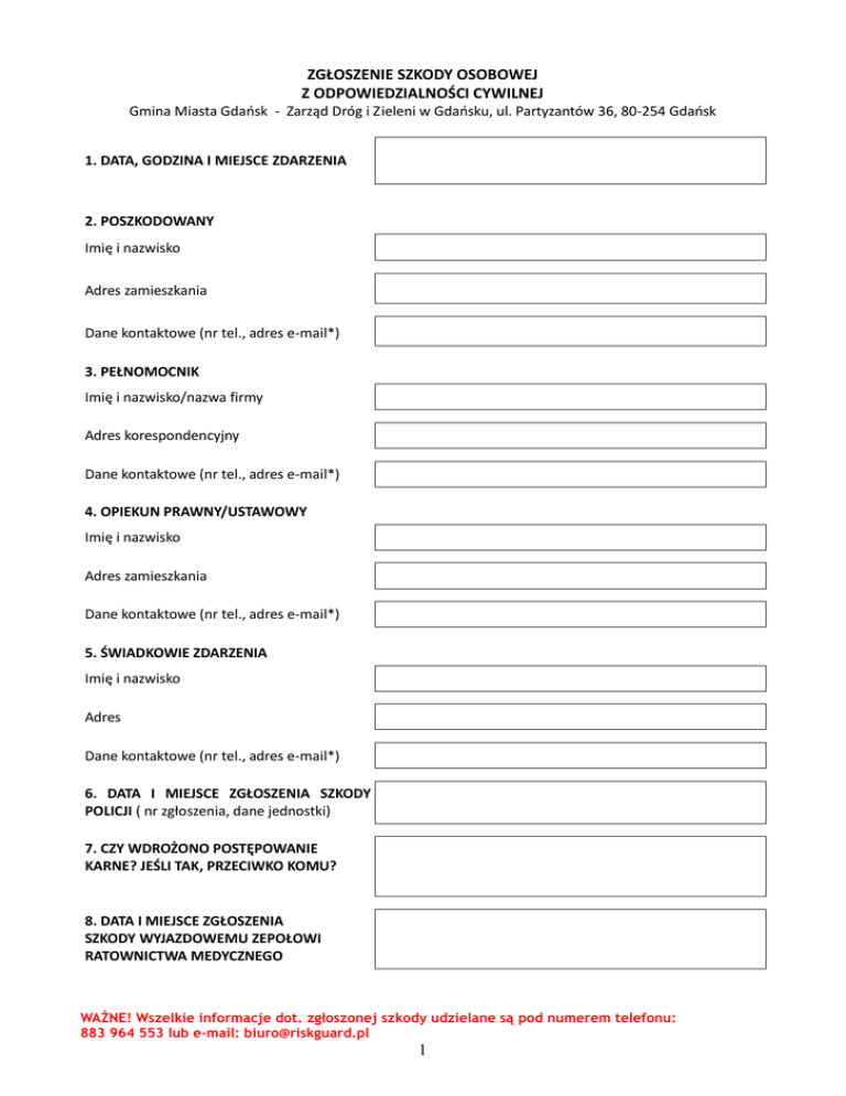 ZGŁOSZENIE SZKODY OSOBOWEJ Z ODPOWIEDZIALNOŚCI CYWILNEJ Gmina Miasta Gdańsk - Zarząd Dróg i Zieleni w Gdańsku, ul. Partyzantów 36, 80-254 Gdańsk 1. DATA, GODZINA I MIEJSCE ZDARZENIA 2. POSZKODOWANY Imię i nazwisko Adres zamieszkania Dane kontaktowe (nr tel., adres e-mail*) 3. PEŁNOMOCNIK Imię i nazwisko/nazwa firmy Adres korespondencyjny Dane kontaktowe (nr tel., adres e-mail*) 4. OPIEKUN PRAWNY/USTAWOWY Imię i nazwisko Adres zamieszkania Dane kontaktowe (nr tel., adres e-mail*) 5. ŚWIADKOWIE ZDARZENIA Imię i nazwisko Adres Dane kontaktowe (nr tel., adres e-mail*) 6. DATA I MIEJSCE ZGŁOSZENIA SZKODY POLICJI ( nr zgłoszenia, dane jednostki) 7. CZY WDROŻONO POSTĘPOWANIE KARNE? JEŚLI TAK, PRZECIWKO KOMU? 8. DATA I MIEJSCE ZGŁOSZENIA SZKODY WYJAZDOWEMU ZEPOŁOWI RATOWNICTWA MEDYCZNEGO WAŻNE! Wszelkie informacje dot. zgłoszonej szkody udzielane są pod numerem telefonu: 883 964 553 lub e-mail: [email protected] 1 9. CZY DO SZKODY DOSZŁO PODCZAS ŚWIADCZENIA PRACY PRZEZ POSZKODWANEGO? JEŚLI TAK, CZY POWIADOMIONO O TYM FAKCIE, PRACODAWCĘ? CZY ZDARZENIE UZNANO ZA WYPADEK PRZY PRACY? 10. CZY DO SZKODY DOSZŁO W DRODZE DO PRACY LUB Z PRACY? JEŚLI TAK, CZY POWIADOMIONO O TYM FAKCIE, PRACODAWCĘ? CZY ZDARZENIE UZNANO ZA WYPADEK W DRODZE DO PRACY LUB Z PRACY ? 11. CZY SZKODA MIAŁA ZWIĄZEK WYPADKIEM KOMUNIKACYJNYM? 12. JAKIEGO RODZAJU SZKODY SPOWODOWAŁ WYPADEK (OSOBOWE, RZECZOWE)? 13. CZY WYPADEK SPOWODOWAŁ ŚMIERĆ? 14. CZY LECZENIE ZWIAZANE Z WYPADKIEM ZOSTAŁO ZAKOŃCZONE? JEŚLI TAK, KIEDY? TAK / NIE 15. SZACUNKOWA WARTOŚĆ ROSZCZENIA 16. CZY ZGŁOSZONO ROSZCZENI O ODSZKODOWANIE Z INNYCH UMÓW UBEZPIECZENIA TAK / NIE 17. CZY W RAMACH PROWADZONEJ DZIAŁALNOŚCI GOSPODARCZEJ MOŻE ZOSTAĆ ODLICZONY PODATEK VAT OD PRZEDMIOTU ROSZCZENIA? TAK / NIE 18. FORMA WYPŁATY ODSZKODOWANIA (proszę podać numer konta) * strony uzgadniają, iż korespondencja e-mail traktowana jest jako wiążąca WAŻNE! Wszelkie informacje dot. zgłoszonej szkody udzielane są pod numerem telefonu: 883 964 553 lub e-mail: [email protected] 2 Dokładny opis przebiegu zdarzenia z określeniem okoliczności, przyczyny szkody: Szkic sytuacyjny miejsca zdarzenia – dokładne miejsce/punkt zdarzenia (adres - nr budynku, ulica, miejscowość) z uwzględnieniem szczegółów terenowych (np. odległość od najbliższego skrzyżowania, posesji, itp. z określeniem rozmiarów ubytku), dokumentacja zdjęciowa UWAGA! Dokumentacja fotograficzna ułatwi i przyspieszy rozpatrzenie zgłoszonej szkody. WAŻNE! Wszelkie informacje dot. zgłoszonej szkody udzielane są pod numerem telefonu: 883 964 553 lub e-mail: [email protected] 3 Wymagane dokumenty do wniosku: 1. 2. 3. 4. 5. Kserokopia dokumentacji medycznej (dotyczącej zarówno leczenia w trybie stacjonarnym jak i ambulatoryjnym, wyniki wykonanych badań, RTG, USG, MRI, CT i in., skierowania na ewentualne zabiegi rehabilitacyjne, dokumentacja potwierdzająca rodzaj, ilość miejsce wykonanych zabiegów rehabilitacyjnych i in.). Dokument tożsamości Poszkodowanego (np. kserokopia dowodu osobistego). Materiały dowodowe potwierdzające okoliczności powstania szkody: oryginały oświadczeń świadków zdarzenia zawierające opis przebiegu zdarzenia wraz z kserokopią dowodu osobistego świadka zdarzenia, względnie zaświadczenia innych służb (np. Policja, Straż Miejska, Straż Pożarna, Wyjazdowy Zespół Ratownictwa Medycznego). Jeżeli wraz ze szkodą osobową zgłoszenie obejmuje również szkodę na mieniu, to w przypadku przystąpienia do naprawy uszkodzonego mienia przed zgłoszeniem roszczeń odszkodowawczych, zaleca się sporządzenie dokumentacji fotograficznej uszkodzonego mienia. Dokumenty stanowiące dowód zakresu poniesionej szkody i poniesionych kosztów naprawy uszkodzonego mienia, w tym oryginały faktur VAT lub rachunków za dokonane naprawy lub wymianę elementów składowych, zawierające wartość poszczególnych części oraz szczegółową specyfikację za dokonaną naprawę, opinie serwisowe określające przyczynę i zakres uszkodzeń. Inne dokumenty, np. dokumentacja fotograficzna stanu technicznego miejsca zdarzenia, dokumentacja potwierdzająca pierwotny zakup uszkodzonego mienia, dokumentacja dotycząca kosztów leczenia (np. faktury, rachunki za zakup produktów leczniczych i wyrobów medycznych). Wymagane załączniki stanową podstawę do rozpatrzenia roszczeń. W przypadku zaistnienia przesłanek powodujących brak możliwości ustalenia okoliczności wystąpienia zdarzenia lub ustalenia rozmiaru szkody wskazana lista może zostać rozszerzona o czym wnoszący roszczenie zostanie poinformowany pisemnie. Zobowiązuje się do dostarczenia brakującej dokumentacji w ciągu 14 dni. Niedostarczenie dokumentacji we wskazanym terminie będzie skutkowało odmową uznania roszczeń. Powrót do czynności likwidacyjnych nastąpi po przedłożeniu kompletu dokumentacji. Gmina Miasta Gdańsk nie ponosi odpowiedzialności za szkodę powstałą w wyniku przedłużenia czasu rozpatrzenia roszczeń z przyczyn leżących po stronie Poszkodowanego. Oświadczam, iż świadomy/a odpowiedzialności karnej i odszkodowawczej za składanie fałszywych wyjaśnień, zapoznałem/am się z określonymi zasadami wnoszenia roszczeń odszkodowawczych, powyższe informacje podałem/am zgodnie z prawdą i według najlepszej wiedzy. Jednocześnie przyjmuję do wiadomości, iż w przypadku ustalenia braku winy zarządcy drogi za zdarzenie, roszczenia odszkodowawcze nie zostaną uwzględnione. Wyrażam zgodę na przetwarzanie moich danych osobowych w celach rozpatrzenia roszczeń odszkodowawczych związanych ze zgłoszoną szkodą zgodnie z ustawą z dnia 29 sierpnia 1997 r. o ochronie danych osobowych (tj. Dz. U. z 2002 r. Nr 101 poz. 926 z późn. zm.) przez Risk Guard Sp. z o.o., ul. Rzemieślnicza 33, 81-855 Sopot, w zakresie, w jakim spółka wykonuje czynności likwidacyjne w imieniu Gminy Miasta Gdańsk, jak również przez inne podmioty, osoby zewnę