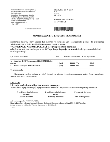 Komornik Sądowy (dawniej Rew.II) przy Sądzie Rejonowym w Słupsku Jan Maciejewski Kancelaria Komornicza w Słupsku 76-200 Słupsk ul. Kilińskiego 31a tel. / fax (59) 840-34-55 (g.10-14) e-mail: [email protected] www.komornikslupsk.pl Km 1313/11 Słupsk, dnia 26-06-2013 P.T. ANNA FLACHA NIEPODLEGŁOŚCI 11/4 77-230 KĘPICE *0020001236518* #MB *0020001236518*/0419/ OBWIESZCZENIE O LICYTACJI RUCHOMOŚCI Komornik Sądowy przy Sądzie Rejonowym w Słupsku Jan Maciejewski podaje do publicznej wiadomości, że w dniu 11-07-2013r. o godz. 10:00 w lokalu: 77-230 KĘPICE, NIEPODLEGŁOŚCI 11/4 ( wejście z tyłu budynku) odbędzie się w trybie ustalonym w art. 867 kpc druga licytacja ruchomości należących do dłużnika i składających się z: _______________________________________________________________________________________________________________________ Lp. Nazwa ruchomości Ilość Wartość szacunkowa Cena wywołania _________________________________________________________________________________________________________________________ 1. telewizor LCD Thomson model 26HR5234 kolor: czarny 2. Pralka Whirpool AWO/D 5320/P 1 [szt.] 1 [szt.] 160,00 **) 600,00 **) 80,00 300,00 _______________________________________________________________________________________________________________________ *) cena za sztukę Ruchomości można oglądać w dzień licytacji w miejscu i czasie oznaczonym wyżej. Suma wywołania wynosi 50% sumy oszacowania. UWAGA: Licytacja może się nie odbyć bez podania przyczyny. Jeżeli drzwi będą zamknięte, będą otwierane na koszt i odpowiedzialność obowiązanegodłużnika. Z up. Komornika Sądowego Aplikant Marek Bochen Z up. Komornika Sądowego Asesor Komornik Sądowy Dariusz Bolewski Jan Maciejewski Adresat oryginału: ANNA FLACHA Do wiadomości: 1. Radca Prawny Sylwester Bobowski Kancelaria Prawna RAVEN, 51-116 Wrocław 2. Sąd Rejonowy w Słupsku Tablica Ogłoszeń, 76-200 Słupsk 3. a/a