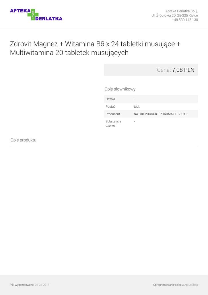 Apteka Derlatka Sp. j. Ul. Źródłowa 20, 25-335 Kielce +48 530 145 138 Zdrovit Magnez + Witamina B6 x 24 tabletki musujące + Multiwitamina 20 tabletek musujących Cena: 7,08 PLN Opis słownikowy Dawka - Postać tabl. Producent NATUR PRODUKT PHARMA SP. Z O.O. Substancja czynna - Opis produktu Plik wygenerowano: 03-03-2017 Powered by TCPDF (www.tcpdf.org) Oprogramowanie sklepu: AptusShop