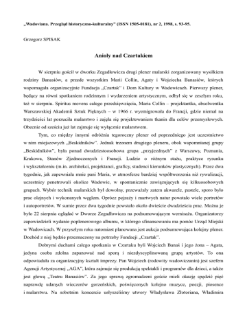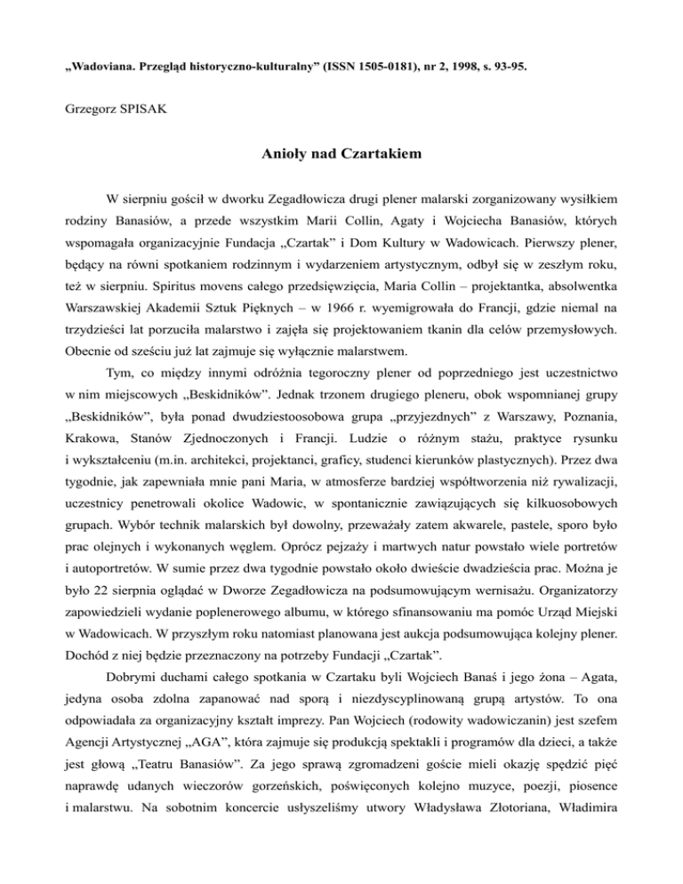 „Wadoviana. Przegląd historyczno-kulturalny” (ISSN 1505-0181), nr 2, 1998, s. 93-95. Grzegorz SPISAK Anioły nad Czartakiem W sierpniu gościł w dworku Zegadłowicza drugi plener malarski zorganizowany wysiłkiem rodziny Banasiów, a przede wszystkim Marii Collin, Agaty i Wojciecha Banasiów, których wspomagała organizacyjnie Fundacja „Czartak” i Dom Kultury w Wadowicach. Pierwszy plener, będący na równi spotkaniem rodzinnym i wydarzeniem artystycznym, odbył się w zeszłym roku, też w sierpniu. Spiritus movens całego przedsięwzięcia, Maria Collin – projektantka, absolwentka Warszawskiej Akademii Sztuk Pięknych – w 1966 r. wyemigrowała do Francji, gdzie niemal na trzydzieści lat porzuciła malarstwo i zajęła się projektowaniem tkanin dla celów przemysłowych. Obecnie od sześciu już lat zajmuje się wyłącznie malarstwem. Tym, co między innymi odróżnia tegoroczny plener od poprzedniego jest uczestnictwo w nim miejscowych „Beskidników”. Jednak trzonem drugiego pleneru, obok wspomnianej grupy „Beskidników”, była ponad dwudziestoosobowa grupa „przyjezdnych” z Warszawy, Poznania, Krakowa, Stanów Zjednoczonych i Francji. Ludzie o różnym stażu, praktyce rysunku i wykształceniu (m.in. architekci, projektanci, graficy, studenci kierunków plastycznych). Przez dwa tygodnie, jak zapewniała mnie pani Maria, w atmosferze bardziej współtworzenia niż rywalizacji, uczestnicy penetrowali okolice Wadowic, w spontanicznie zawiązujących się kilkuosobowych grupach. Wybór technik malarskich był dowolny, przeważały zatem akwarele, pastele, sporo było prac olejnych i wykonanych węglem. Oprócz pejzaży i martwych natur powstało wiele portretów i autoportretów. W sumie przez dwa tygodnie powstało około dwieście dwadzieścia prac. Można je było 22 sierpnia oglądać w Dworze Zegadłowicza na podsumowującym wernisażu. Organizatorzy zapowiedzieli wydanie poplenerowego albumu, w którego sfinansowaniu ma pomóc Urząd Miejski w Wadowicach. W przyszłym roku natomiast planowana jest aukcja podsumowująca kolejny plener. Dochód z niej będzie przeznaczony na potrzeby Fundacji „Czartak”. Dobrymi duchami całego spotkania w Czartaku byli Wojciech Banaś i jego żona – Agata, jedyna osoba zdolna zapanować nad sporą i niezdyscyplinowaną grupą artystów. To ona odpowiadała za organizacyjny kształt imprezy. Pan Wojciech (rodowity wadowiczanin) jest szefem Agencji Artystycznej „AGA”, która zajmuje się produkcją spektakli i programów dla dzieci, a także jest głową „Teatru Banasiów”. Za jego sprawą zgromadzeni goście mieli okazję spędzić pięć naprawdę udanych wieczorów gorzeńskich, poświęconych kolejno muzyce, poezji, piosence i malarstwu. Na sobotnim koncercie usłyszeliśmy utwory Władysława Złotoriana, Władimira Czernikowa, Astora Piazzolli, Matyasa Seibera, Mariana Gordiejana i Jana Sebastiana Bacha w wykonaniu Malwiny Banaś-Baran (wiolonczela) i Klaudiusza Barana (akordeon). Malwina jest studentką trzeciego roku Akademii Muzycznej im. Fryderyka Chopina w Warszawie, a Klaudiusz wykładowcą w klasie akordeonu na tejże uczelni. Dzień później odbył się „Wieczór poezji Emila Zegadłowicza”, w czasie którego uczestnicy pleneru, m.in. Hanna Ważyńska, Maria Collin, Wojciech i Agata Banasiowie, recytowali wiersze poety z tomu pt. Wrzosy. Można było usłyszeć także wzruszającą Balladę o Jędrzeju Wowrze. Joanna Domańska oraz Irmina Gauza – młode i utalentowane aktorki śpiewające – podczas trzeciego z kolei, czwartkowego wieczoru zatytułowanego „Miłość w piosence” wykonały między innymi utwory skomponowane przez Aleksandra Musiałowskiego do tekstów Wojciecha Banasia. Na szczególną uwagę zasługiwał piątkowy recital Karoliny Zapolskiej – „Paryż moja miłość”. Karolina – laureatka Festiwalu Piosenki Francuskiej w Lublinie w 1997 r., gdzie zdobyła drugą nagrodę festiwalu oraz zwyciężczyni tegorocznego Konkursu im. Georgesa Brassensa w Warszawie – brawurowo wykonała utwory Jacquesa Brela, Georgesa Brassensa, Edith Piaf, Charlesa Aznavoura z tekstami tłumaczonymi przez Wojciecha Młynarskiego, Jerzego Menela i Andrzeja Ozgę. Pojawiła się też urocza Karuzela, kompozycja Zygmunta Koniecznego z tekstem Agnieszki Osieckiej. Na bis usłyszeliśmy, niestety tylko fragment, sarkastycznego songu z Opery za trzy grosze Kurta Weila i Bertolda Brechta pt. Mack the Knife (Rekin zęby ma na wierzchu / Ma tych zębów pełen pysk...). Artystkom podczas dwóch śpiewnych wieczorów akompaniowali: Urszula Borkowska i Aleksander Musiałowski na fortepianie, oraz wyżej wspomniani Malwina Banaś i Klaudiusz Baran. Ostatni, sobotni wieczór był połączeniem wernisażu poplenerowego z przedstawieniem „Teatru Banasiów” pt. Zobaczyć anioła. Ten lekki i bajkowy spektakl muzyczny z wątkiem faustowskim został wyreżyserowany i oparty na tekstach Wojciecha Banasia z muzyką Aleksandra Musiałowskiego. Spektakl inspirowany był nigdy nie publikowanym listem mistrza Stanisława Szukalskiego do swego ucznia Stefana Żechowskiego – późniejszego ilustratora dzieł Emila Zegadłowicza. Oprócz samego reżysera i kompozytora spektaklu wzięły w nim udział Joanna Domańska, Irmina Gauza, Marian Krawczyk – aktorzy „Teatru Banasiów” – oraz pozostali uczestnicy pleneru malarskiego. Sierpniowe spotkania w Gorzeniu, jak zapewniali mnie organizatorzy, weszły na stałe do ich kalendarza spotkań artystycznych. Pierwszą jednak przyczyną organizowanej od dwóch lat imprezy jest rodzinny zjazd familii Stypułów i Banasiów – rozrzuconej po świecie lecz z sentymentem odnoszącej się do swoich wadowickich korzeni. Cała impreza była zorganizowana bardzo sprawnie, minimalnym nakładem kosztów i – co najważniejsze – z energią i pomysłem. Nawiązywała do tradycji przedwojennych plenerów organizowanych na terenie Gorzenia przez Emila Zegadłowicza.
