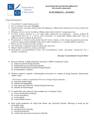 MAŁOPOLSKI KONKURS BIBLIJNY dla uczniów gimnazjów ETAP SZKOLNY – 25.10.2012 Drogi Gimnazjalisto! 1. Przed Tobą 37 zadań konkursowych. 2. Na rozwiązanie testu masz 45 minut. 3. Pracuj uważnie, używając jedynie pióra lub długopisu. Odpowiedzi udzielane przy użyciu ołówka nie będą oceniane. 4. Pamiętaj, aby nie używać korektora. Błędną odpowiedź przekreśl i zastąp poprawną. 5. W teście wyboru /pytania nr 1-17/ tylko jedna odpowiedź jest poprawna - zaznacz znakiem X odpowiednią literę (a, b, c lub d). Jeśli stwierdzisz, że zaznaczyłeś błędną odpowiedź, otocz ją kółkiem i zaznacz znakiem X inną literę. 6. W pytaniach, w których trzeba podać imię lub nazwę własną, zwróć uwagę na poprawną pisownię, ponieważ należy podać dokładnie takie słowa, jakie znajdują się w V wydaniu Biblii Tysiąclecia. 7. Staraj się, aby Twoja praca była czytelna. 8. Nie zapominaj o napisaniu pełnych odpowiedzi słownych. 9. Wyłącz telefon komórkowy, jeśli go posiadasz. 10. Stwierdzenie niesamodzielności pracy lub przeszkadzanie innym, spowoduje wykluczenie Cię z udziału w Konkursie. Życzymy Ci powodzenia! Szczęść Boże! 1. Kim jest Samuel, według informacji zawartych w Biblii Tysiąclecia? (1 p.) a) jedynym autorem Ksiąg Samuela, b) jedyną główną postacią Ksiąg Samuela, c) jedynie domniemanym autorem Ksiąg Samuela, d) przedostatnim z sędziów. 2. Wybierz właściwe, zgodne z informacjami zawartymi we wstępie do Ksiąg Samuela, dokończenie zdania: (1 p.) Pierwotnie w tekście oryginalnym Pierwsza i Druga Księga Samuela… a) stanowiły jedną księgę. b) należały do Septuaginty. c) były nazywane Pierwszą i Drugą Księgą Królewską. d) należały do Pięcioksięgu. 3. Co sądził Heli, gdy zobaczył Annę modlącą się w świątyni? (1 p.) a) że jest nieszczęśliwą kobietą, b) że jest nierządnicą, c) że jest pijana, d) że potrzebuje pomocy. 4. Saul wysłał posłańców do Najot koło Rama, aby schwytali Dawida. Dlaczego ta misja się nie powiodła? (1 p.) a) zostali zabici, b) przestraszyli się Dawida, c) zaczęli prorokować, d) zostali schwytani przez towarzyszy Dawida. 5. Dawid, uciekając przed Saulem, udał się do króla Gat, ale obawiał się, że ten go rozpozna. Co zrobił wtedy Dawid, żeby nie ujawnić swojej tożsamości? (1 p.) a) udawał zwykłego sługę, b) udawał szalonego, c) przebrał się z pasterza, d) zgolił głowę. 6. Król Saul wyruszył ścigać Dawida, ukrywającego się przed nim na pustyni Maon. Król musiał jednak wtedy zaniechać pościgu. Co było powodem wycofania się Saula? (1 p.) a) uświadomił sobie, że źle robi nastając na życie Dawida, b) jego wojsko zostało pobite przez Filistynów, c) Filistyni najechali jego kraj i wyruszył przeciw nim, d) wojsko i on sam byli wyczerpani drogą przez pustynię. 7. Ile czasu trwało – wykonane z rozkazu Dawida - liczenie Izraelitów? (1 p.) a) 3 miesiące i 20 dni, b) 4 miesiące i 20 dni, c) 6 miesięcy i 20 dni, d) 9 miesięcy i 20 dni. 8. Co zrobił kapłan Heli, gdy dowiedział się, że Arka Przymierza została zabrana Izraelitom? (1 p.) a) modlił się nieustannie przez trzy dni i trzy noce, b) zabrał miecz i wyruszył z wojskiem, aby odbić Arkę Przymierza, c) rozdarł szaty i głośno płakał, d) upadł z krzesła i w wyniku upadku zmarł. 9. „Pan pożałował tego, że Saula uczynił królem nad Izraelem” – jaki postępek Saula był przyczyną odwrócenia się od niego Pana Boga? (1 p.) a) nieustannie nastawał na życie Dawida, b) w czasie wojny z Amalekitami zachował zdobycz obłożoną klątwą, c) szukał rady w sprawie wyprawy wojennej u wróżki, d) swoją córkę, żonę Dawida, oddał jednemu ze swoich dowódców. 10. Kim był Abner? (1 p.) a) dowódcą wojsk Saula, b) bratem Saula, c) dowódcą wojsk Dawida, d) bratem Dawida. 11. Ile dzieci urodziła Dawidowi jego żona Mikal? (1 p.) a) troje - syna i dwie córki, b) jedno - syna, c) dwoje - dwie córki, d) żadnego - była bezdzietna. 12. W jaki sposób Chanun, król Ammonitów, upokorzył sługi Dawida, którzy przybyli, aby złożyć kondolencje królowi po śmierci ojca? (1 p.) a) zgolił im brody do połowy i obciął im szaty, b) kazał ich wychłostać, c) zbito ich kijami po piętach, d) zabrano im odzienie i wypuszczono. 13. Dawid sprowadził Arkę Przymierza do Jerozolimy. Gdzie ją umieścił? (1 p.) a) w swoim domu, b) w domu Obed-Edoma, c) w namiocie, d) w świątyni. 14. Co robił król Dawid, gdy w uroczystym pochodzie sprowadzano Arkę Przymierza do Jerozolimy? (1 p.) a) patrzył na procesję z okna swego pałacu, b) szedł na czele pochodu, c) sam niósł Arkę Przymierza, d) tańczył przed Arką Przymierza. 15. Absalom zginął w bitwie z wojskami Dawida. Jak Dawid zareagował na wieść o zwycięstwie i jednocześnie o śmierci syna? (1 p.) a) płakał i rozpaczał, b) nagrodził sowicie dowódców, c) całą noc leżał na ziemi i modlił się, d) rozkazał zabić posłańca, który przyniósł tę wiadomość. 16. Po zwycięstwie nad Absalomem miał miejsce kolejny bunt przeciwko królowi Dawidowi. Kto nim dowodził? (1 p.) a) Amasa, b) Abiszaj, c) Szeba, d) Siba. 17. Jaką karę z grzech policzenia Izrealitów wybrał Dawid? (1 p.) a) siedem lat głodu, b) trzy miesiące ucieczki przed wrogiem, c) trzy dni zarazy, d) śmierć syna. 18. Jak miał na imię ojciec Samuela? (1 p.) ……………………………………………………………………………………………………….. 19. Podaj tłumaczenie na język polski imienia „Samuel”, które znajdujemy w Biblii Tysiąclecia. (1 p.) ……………………………………………………………………………………………………….. 20. Jaki naród po zwycięstwie nad Izraelitami zabrał im Arkę Przymierza? (1 p.) ……………………………………………………………………………………………………….. 21. Pod