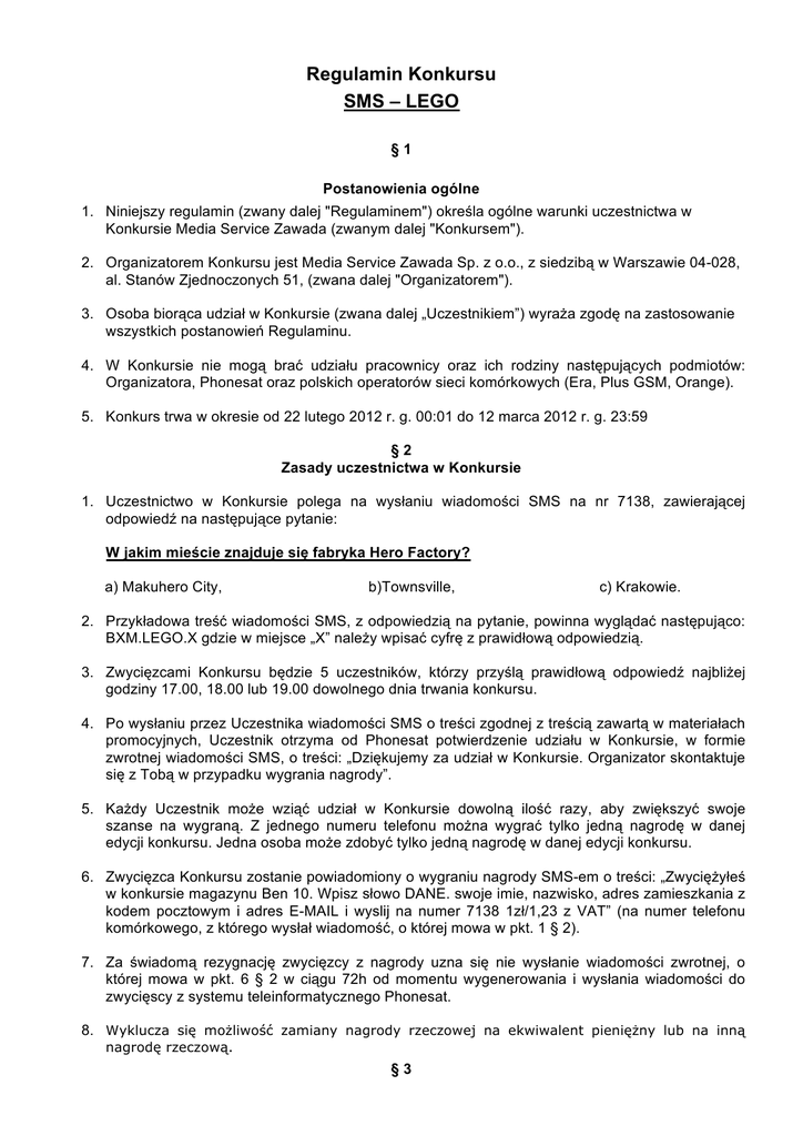 Regulamin Konkursu SMS – LEGO §1 Postanowienia ogólne 1. Niniejszy regulamin (zwany dalej "Regulaminem") określa ogólne warunki uczestnictwa w Konkursie Media Service Zawada (zwanym dalej "Konkursem"). 2. Organizatorem Konkursu jest Media Service Zawada Sp. z o.o., z siedzibą w Warszawie 04-028, al. Stanów Zjednoczonych 51, (zwana dalej "Organizatorem"). 3. Osoba biorąca udział w Konkursie (zwana dalej „Uczestnikiem”) wyraża zgodę na zastosowanie wszystkich postanowień Regulaminu. 4. W Konkursie nie mogą brać udziału pracownicy oraz ich rodziny następujących podmiotów: Organizatora, Phonesat oraz polskich operatorów sieci komórkowych (Era, Plus GSM, Orange). 5. Konkurs trwa w okresie od 22 lutego 2012 r. g. 00:01 do 12 marca 2012 r. g. 23:59 §2 Zasady uczestnictwa w Konkursie 1. Uczestnictwo w Konkursie polega na wysłaniu wiadomości SMS na nr 7138, zawierającej odpowiedź na następujące pytanie: W jakim mieście znajduje się fabryka Hero Factory? a) Makuhero City, b)Townsville, c) Krakowie. 2. Przykładowa treść wiadomości SMS, z odpowiedzią na pytanie, powinna wyglądać następująco: BXM.LEGO.X gdzie w miejsce „X” należy wpisać cyfrę z prawidłową odpowiedzią. 3. Zwycięzcami Konkursu będzie 5 uczestników, którzy przyślą prawidłową odpowiedź najbliżej godziny 17.00, 18.00 lub 19.00 dowolnego dnia trwania konkursu. 4. Po wysłaniu przez Uczestnika wiadomości SMS o treści zgodnej z treścią zawartą w materiałach promocyjnych, Uczestnik otrzyma od Phonesat potwierdzenie udziału w Konkursie, w formie zwrotnej wiadomości SMS, o treści: „Dziękujemy za udział w Konkursie. Organizator skontaktuje się z Tobą w przypadku wygrania nagrody”. 5. Każdy Uczestnik może wziąć udział w Konkursie dowolną ilość razy, aby zwiększyć swoje szanse na wygraną. Z jednego numeru telefonu można wygrać tylko jedną nagrodę w danej edycji konkursu. Jedna osoba może zdobyć tylko jedną nagrodę w danej edycji konkursu. 6. Zwycięzca Konkursu zostanie powiadomiony o wygraniu nagrody SMS-em o treści: „Zwyciężyłeś w konkursie magazynu Ben 10. Wpisz słowo DANE. swoje imie, nazwisko, adres zamieszkania z kodem pocztowym i adres E-MAIL i wyslij na numer 7138 1zł/1,23 z VAT” (na numer telefonu komórkowego, z którego wysłał wiadomość, o której mowa w pkt. 1 § 2). 7. Za świadomą rezygnację zwycięzcy z nagrody uzna się nie wysłanie wiadomości zwrotnej, o której mowa w pkt. 6 § 2 w ciągu 72h od momentu wygenerowania i wysłania wiadomości do zwycięscy z systemu teleinformatycznego Phonesat. 8. Wyklucza się możliwość zamiany nagrody rzeczowej na ekwiwalent pieniężny lub na inną nagrodę rzeczową. §3 Postanowienia końcowe 1) Nagrody: • 5 nagród równorzędnych w postaci klocków LEGO Hero Factory ufundowanych przez Lego o wartości jednostkowej 40 zł netto. 2. Uczestnictwo w Konkursie jest możliwe za pośrednictwem sieci polskich operatorów telefonii komórkowej (Era, Plus GSM, Orange), zarówno w systemie prepaid, jak i postpaid (abonamentowym). 3. Opłata za wysłanie wiadomości SMS na numer 7138 wynosi 1,23 zł z VAT. 4. Do uczestnictwa w Konkursie nie mają zastosowania ulgi dla grup abonentów na opłaty abonamentowe oraz usługi dodatkowe. 5. Wysłanie przez Uczestnika wiadomości SMS, o której mowa w § 2, jest równoznaczne ze złożeniem przez niego oświadczenia, iż wyraża on zgodę na postanowienia niniejszego Regulaminu. 6. Organizator dołoży wszelkich starań w celu zapewnienia prawidłowego działania Konkursu. 7. Operatorzy sieci telefonii komórkowych odpowiadają wyłącznie za usługi telekomunikacyjne umożliwiające uczestnictwo w Konkursie. 8. Organizator nie ponosi odpowiedzialności za: udział w Konkursie przez osoby nieuprawnione do użytkowania telefonu komórkowego, problemy w funkcjonowaniu Konkursu, jeżeli nastąpiły one wskutek zdarzeń, których Organizator przy zachowaniu należytej staranności nie był w stanie przewidzieć, lub którym nie mógł zapobiec, w szczególności w przypadku problemów związanych ze zdarzeniami losowymi o charakterze siły wyższej, udział w Konkursie niezgodnie z postanowieniami niniejszego Regulaminu i szkody tym spowodowane, przerwy w funkcjonowaniu Konkursu zaistniałe z przyczyn technicznych (np. konserwacja, przegląd, wymiana sprzętu) lub niezależnych od Organizatora, 9. Organizator zastrzega sobie prawo zmiany postanowień Regulaminu w razie zmiany przepisów prawnych lub z innej ważnej przyczyny. 10. Reklamacje dotyczące Konkursu należy przesyłać w formie elektronicznej na adres e-mail: [email protected] z dopiskiem „GRA”. 11. Reklamacje Uczestników dotyczące Konkursu będą rozpatrywane przez Komisje Sprawdzającą niezwłocznie, jednakże nie później niż w terminie 7 dni od daty otrzymania reklamacji. 12. Decyzja Komisji Sprawdzającej odnoszącej się do zgłoszonej reklamacji jest ostateczna. 13. Regulamin oraz dodatkowe informacje na temat Konkursu są dostępne w siedzibie Organizatora. 14. Warunkiem udziału w Konkursie jest podanie przez Uczestnika Konkursu prawdziwych danych osobowych, tj.: imienia, nazwiska, adresu konta poczty elektronicznej, wieku, danych teleadresowych. Podanie nieprawdziwych, niepełnych albo niepodanie w ogóle danych osobowych powoduje wykluczenie z Konkursu. 15. Przystępując do konkursu Uczestnik wyraża zgodę na przetwarzanie podanych przez niego danych osobowych przez Organizatora, administratora danych osobowych, w rozumieniu przepisów ustawy o ochronie danych osobowych. Dane będą przetwarzane w celu przeprowadzenia niniejszego Konkursu oraz w związku z wydaniem nagród. Uczestnicy konkursu mają prawo wglądu i poprawiania swoich danych osobowych.