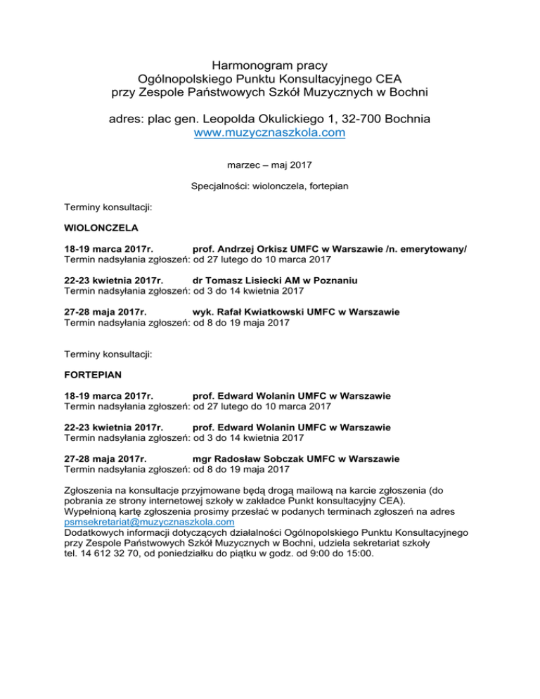 Harmonogram pracy Ogólnopolskiego Punktu Konsultacyjnego CEA przy Zespole Państwowych Szkół Muzycznych w Bochni adres: plac gen. Leopolda Okulickiego 1, 32-700 Bochnia www.muzycznaszkola.com marzec – maj 2017 Specjalności: wiolonczela, fortepian Terminy konsultacji: WIOLONCZELA 18-19 marca 2017r. prof. Andrzej Orkisz UMFC w Warszawie /n. emerytowany/ Termin nadsyłania zgłoszeń: od 27 lutego do 10 marca 2017 22-23 kwietnia 2017r. dr Tomasz Lisiecki AM w Poznaniu Termin nadsyłania zgłoszeń: od 3 do 14 kwietnia 2017 27-28 maja 2017r. wyk. Rafał Kwiatkowski UMFC w Warszawie Termin nadsyłania zgłoszeń: od 8 do 19 maja 2017 Terminy konsultacji: FORTEPIAN 18-19 marca 2017r. prof. Edward Wolanin UMFC w Warszawie Termin nadsyłania zgłoszeń: od 27 lutego do 10 marca 2017 22-23 kwietnia 2017r. prof. Edward Wolanin UMFC w Warszawie Termin nadsyłania zgłoszeń: od 3 do 14 kwietnia 2017 27-28 maja 2017r. mgr Radosław Sobczak UMFC w Warszawie Termin nadsyłania zgłoszeń: od 8 do 19 maja 2017 Zgłoszenia na konsultacje przyjmowane będą drogą mailową na karcie zgłoszenia (do pobrania ze strony internetowej szkoły w zakładce Punkt konsultacyjny CEA). Wypełnioną kartę zgłoszenia prosimy przesłać w podanych terminach zgłoszeń na adres [email protected] Dodatkowych informacji dotyczących działalności Ogólnopolskiego Punktu Konsultacyjnego przy Zespole Państwowych Szkół Muzycznych w Bochni, udziela sekretariat szkoły tel. 14 612 32 70, od poniedziałku do piątku w godz. od 9:00 do 15:00.