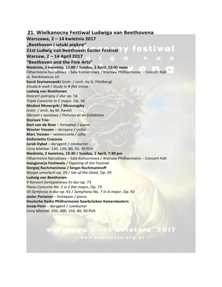 21. Wielkanocny Festiwal Ludwiga van Beethovena Warszawa, 2 – 14 kwietnia 2017 „Beethoven i sztuki piękne” 21st Ludwig van Beethoven Easter Festival Warsaw, 2 – 14 April 2017 “Beethoven and the Fine Arts” Niedziela, 2 kwietnia, 12.00 / Sunday, 2 April, 12:00 noon Filharmonia Narodowa – Sala Koncertowa / Warsaw Philharmonic – Concert Hall ul. Sienkiewicza 10 Karol Szymanowski (instr. / orch. by G. Fitelberg) Etiuda b-moll / Study in B flat minor Ludwig van Beethoven Koncert potrójny C-dur op. 56 Triple Concerto in C major, Op. 56 Modest Musorgski / Mussorgsky (instr. / orch. by M. Ravel) Obrazki z wystawy / Pictures at an Exhibition Storioni Trio: Bart van de Roer – fortepian / piano Wouter Vossen – skrzypce / violin Marc Vossen – wiolonczela / cello Sinfonietta Cracovia Jurek Dybał – dyrygent / conductor Ceny biletów: 150, 120, 80, 50, 30 PLN Niedziela, 2 kwietnia, 19.30 / Sunday, 2 April, 7:30 pm Filharmonia Narodowa – Sala Koncertowa / Warsaw Philharmonic – Concert Hall Inauguracja Festiwalu / Opening of the Festival Siergiej Rachmaninow / Sergei Rachmaninoff Wyspa umarłych op. 29 / Isle of the Dead, Op. 29 Ludwig van Beethoven V Koncert fortepianowy Es-dur op. 73 Piano Concerto No. 5 in E flat major, Op. 73 VII Symfonia A-dur op. 92 / Symphony No. 7 in A major, Op. 92 Javier Perianes – fortepian / piano Deutsche Radio Philharmonie Saarbrücken Kaiserslautern Josep Pons – dyrygent / conductor Ceny biletów: 250, 200, 150, 80, 50 PLN Poniedziałek, 3 kwietnia, 19.30 / Monday, 3 April, 7:30 pm Filharmonia Narodowa – Sala Koncertowa / Warsaw Philharmonic – Concert Hall Ludwig van Beethoven Koncert Skrzypcowy D-dur op. 61 Violin Concerto in D major, Op. 61 IV Symfonia B-dur op. 60 Symphony No. 4 in B flat major, Op. 60 Tseng Yu-chien – skrzypce / violin Hong Kong Sinfonietta Yip Wing-sie – dyrygent / conductor Ceny biletów: 150, 120, 80, 50, 30 PLN Wtorek, 4 kwietnia, 19.30 / Tuesday, 4 April, 7:30 pm Filharmonia Narodowa – Sala Koncertowa / Warsaw Philharmonic – Concert Hall Igor Strawiński / Stravinsky Żywot rozpustnika / The Rake's Progress Andrew Strooper (Tom Rakewell) – tenor Louise Alder (Anne Trulove) – sopran / soprano Tba (Ojciec / Father Trulove) – bas / bass Krzysztof Szumański (Nick Shadow) – baryton / baritone Anna Lubańska (Baba-Turek / Baba the Turk; Matka Gąska / Mother Goose) – mezzosopran / mezzo-soprano Zespół Śpiewaków Miasta Katowice „Camerata Silesia” “Camerata Silesia” The Katowice City Singers’ Ensemble Anna Szostak – przygotowanie chóru / choir master Narodowa Orkiestra Symfoniczna Polskiego Radia w Katowicach Polish National Radio Symphony Orchestra in Katowice Alexander Liebreich – dyrygent / conductor Ceny biletów: 150, 120, 80, 50, 30 PLN Środa, 5 kwietnia, 19.30 / Wednesday, 5 April, 7:30 pm Filharmonia Narodowa – Sala Koncertowa / Warsaw Philharmonic – Concert Hall Ludwig van Beethoven VIII Symfonia F-dur op. 93 Symphony No. 8 in F major, Op. 93 Ah! Perfido op. / Op. 65 Muzyka do tragedii „Egmont” J.W. Goethego op. 84 Incidental Music for J.W. Goethe’s drama “Egmont”, Op. 84 Marie Arnet – sopran / soprano John Malkovich – narrator Wiener Akademie Martin Haselböck – dyrygent / conductor Ceny biletów: 200, 160, 100, 60, 40 PLN Czwartek, 6 kwietnia, 19.30 / Thursday, 6 April, 7:30 pm Filharmonia Narodowa – Sala Koncertowa / Warsaw Philharmonic – Concert Hall Giacomo Puccini Intermezzo z III aktu opery / from 3 act of Manon Lescaut Introduction z III aktu opery / from 3 act of Edgar La Tregenda z opery / from Le Villi Scherzo Sinfonico Intermezzo z opery Siostra Angelika / from Suor Angelica La Rondine / Jaskółka – fragmenty / excerpts La bohème / Cyganeria – fragmenty / excerpts Ewa Vesin – sopran / soprano Edgaras Montvidas – tenor Leopoldo Lo Sciuto – tenor Polska Orkiestra Radiowa / Polish Radio Symphony Orchestra Massimiliano Caldi – dyrygent / conductor Ceny biletów: 150, 120, 80, 50, 30 PLN Piątek, 7 kwietnia, 17.00 / Friday, 5:00 pm Filharmonia Narodowa – Sala Kameralna / Warsaw Philharmonic – Chamber Music Hall ul. Moniuszki 5 Ludwig van Beethoven Sonata A-dur na fortepian i skrzypce „Kreutzerowska” op. 47 Sonata in A major for Piano and Violin “Kreutzer”, Op. 47 Ernest Bloch I Suita na skrzypce solo / Suite No. 1 for Solo Violin Karol Szymanowski Mity op. 30 / Mythes, Op. 30 Edvard Grieg II Sonata skrzypcowa G-dur op. 13 / Violin Sonata No. 2 in G major, Op. 13 Veriko Tchumburidze – skrzypce / violin Aleksandra Świgut – fortepian / piano Ceny biletów: 50, 30 PLN Piątek, 7 kwietnia, 19.30 / Friday, 7 April, 7:30 pm Filharmonia Narodowa – Sala Koncertowa / Warsaw Philharmonic – Concert Hall Georges Bizet Symfonia C-dur / Symphony in C major Djamileh Opera w 1 akcie (wykonanie koncertowe) Opera in 1 act (concert performance) Jennifer Feinstein (Djamileh) – mezzosopran / mezzo-soprano Eric Barry (Haroun) – tenor George Mosley (Splendiano) – baryton / baritone Wojciech Pszoniak – narrator Poznański Chór Kameralny Poznan Chamber Choir Bartosz Michałowski – przygotowanie chóru / choir master Orkiestra Filharmonii Poznańskiej Orchestra of Poznań Philharmonic Łukasz Borowicz – dyrygent / conductor Ceny biletów: 150, 120, 80, 50, 30 PLN Sobota, 8 kwietnia, 19.30 / Saturday, 8 April, 7:30 pm Filharmonia Narodowa – Sala Koncertowa / Warsaw Philharmonic – Concert Hall Felix Mendelssohn-Bartholdy Koncert skrzypcowy e-moll op. 64 / Violin Concerto in E minor, Op. 64 Gustav Mahler V Symfonia cis-moll / Symphony No. 5 in C sharp minor Emmanuel Tjeknavorian – skrzypce / violin Frankfurt Radio Symphony Andrés Orozco-Estrada – dyrygent / conductor Ceny biletów: 200, 160, 100, 60, 40 PLN Niedziela, 9 kwietnia, 12.00 / Sunday, 9 April, 12:00 Filharmonia Narodowa – Sala Koncertowa / Warsaw Philharmonic – Concert Hall Feliks Nowowiejski Uwertura do opery Legenda Bałtyku op. 28 Overture to The