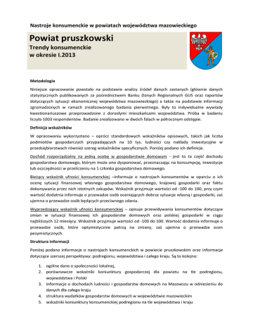 Nastroje konsumenckie w powiatach województwa mazowieckiego Powiat pruszkowski Trendy konsumenckie w okresie I.2013 Metodologia Niniejsze opracowanie powstało na podstawie analizy źródeł danych zastanych (głównie danych statystycznych publikowanych za pośrednictwem Banku Danych Regionalnych GUS oraz raportów dotyczących sytuacji ekonomicznej województwa mazowieckiego) a także na podstawie informacji zgromadzonych w ramach zrealizowanego badania pierwotnego. Były to indywidualne wywiady kwestionariuszowe przeprowadzone z dorosłymi mieszkaocami województwa. Próba w badaniu liczyła 1003 respondentów. Badanie zrealizowano w dwóch falach w półrocznym odstępie. Definicja wskaźników W opracowaniu wykorzystano – oprócz standardowych wskaźników opisowych, takich jak liczba podmiotów gospodarczych przypadających na 10 tys. ludności czy nakłady inwestycyjne w przedsiębiorstwach również szereg wskaźników specyficznych. Poniżej podano ich definicje. Dochód rozporządzalny na jedną osobę w gospodarstwie domowym - jest to ta częśd dochodu gospodarstwa domowego, którym może ono dysponowad, przeznaczając na konsumpcję, inwestycje lub oszczędności w przeliczeniu na 1 członka gospodarstwa domowego. Bieżący wskaźnik ufności konsumenckiej –informuje o nastrojach konsumentów w oparciu o ich ocenę sytuacji finansowej własnego gospodarstwa domowego, krajowej gospodarki oraz faktu dokonywania przez nich istotnych zakupów. Wskaźnik przyjmuje wartości od -100 do 100, przy czym wartośd dodatnia informuje o przewadze osób oceniających dobrze sytuacje własną i gospodarki, zaś ujemna o przewadze osób będących przeciwnego zdania. Wyprzedzający wskaźnik ufności konsumenckiej – opisuje przewidywania konsumentów dotyczące zmian w sytuacji finansowej ich gospodarstw domowych oraz polskiej gospodarki w ciągu najbliższych 12 miesięcy. Wskaźnik przyjmuje wartości od -100 do 100. Wartośd dodatnia informuje o przewadze osób, które optymistycznie patrzą na zmiany, zaś ujemna o przewadze ocen pesymistycznych. Struktura informacji Poniżej podano informacje o nastrojach konsumenckich w powiecie pruszkowskim oraz informacje dotyczące szerszej perspektywy: podregionu, województwa i całego kraju. Są to kolejno: 1. ogólne dane o społeczności lokalnej, 2. porównawcze wskaźniki koniunktury gospodarczej dla powiatu na tle podregionu, województwa i Polski 3. informacje o dochodach ludności i gospodarstw domowych na Mazowszu w odniesieniu do danych dla całego kraju 4. struktura wydatków gospodarstw domowych w województwie mazowieckim 5. wskaźniki koniunktury konsumenckiej podregionu na tle województwa i kraju Trendy konsumenckie - wnioski główne • Wzrósł przeciętny miesięczny dochód na 1 osobę w gospodarstwie domowym w województwie mazowieckim. W 2011 roku wyniósł 1623 zł i jest średnio o 396 zł większy niż średni miesięczny dochód na 1 osobę w gospodarstwie domowym w całym kraju. Oznacza to, że mieszkaocy województwa mazowieckiego dysponują miesięcznie większymi zasobami finansowymi, co może wpłynąd dodatnio na popyt na lokalnym rynku. • Nastąpił również wzrost przeciętnych miesięcznych wydatków na 1 osobę w województwie mazowieckim - w 2011 roku było to 1308,35 zł. Wydatki w województwie mazowieckim są jednak większe o 293,15 zł, niż średnie miesięczne wydatki na 1 osobę w gospodarstwie domowym w całym kraju. • Bieżący wskaźnik ufności konsumenckiej w kraju według danych Głównego Urzędu Statystycznego w styczniu 2013 wyniósł wartośd ujemną: -30,8, podczas gdy przeprowadzone badanie kwestionariuszowe wykazało, że dla podregionu warszawskiego zachodniego- przyjął wartośd -21,58. Wartośd wskaźnika dla podregionu jest wyższa od średniej wartości wskaźnika dla całego województwa oraz kraju, co świadczy o tym, że mieszkaocy podregionu warszawskiego zachodniego relatywnie bardziej optymistycznie oceniają sytuację własną i gospodarki całego kraju. • Wyprzedzający wskaźnik ufności konsumenckiej dla podregionu warszawskiego zachodniego według badania kwestionariuszowego w styczniu 2013 przyjmuje wartośd ujemną -22,99. Podobnie jak w przypadku bieżącego wskaźnika, jego wartośd jest wyższa w stosunku do średniej wartości wskaźnika dla całego województwa. Wskaźnik w podregionie warszawskim zachodnim wynosi o blisko 18 punktów więcej niż wskaźnik krajowy według danych Głównego Urzędu Statystycznego. • Rośnie przeciętne wynagrodzenie brutto. Według danych z 2011 roku przeciętne wynagrodzenie dla powiatu pruszkowskiego wyniosło 4479,38 zł co stanowi 123,6% wartości przeciętnych miesięcznych wynagrodzeo dla całego kraju. • Większośd budżetów domowych zajmują wydatki na żywnośd i użytkowanie mieszkania (łącznie 42%). • W 2011 w spisie REGON na 10 tys. mieszkaoców powiatu pruszkowskiego zostało zarejestrowanych 1601 podmiotów gospodarczych, przy średniej ogólnopolskiej wynoszącej 1004. • W 2011 roku w powiecie pruszkowskim odnotowano wzrost nakładów inwestycyjnych, podobnie jak w podregionie warszawskim zachodnim, województwie mazowieckim oraz reszcie kraju. PODSTAWOWE INFORMACJE O SPOŁECZNOŚCI LOKALNEJ Województwo mazowieckie Podregion warszawski zachodni Powiat pruszkowski Liczba osób zamieszkujących 5,3 mln 779924 156302 Odsetek osób w wieku produkcyjnym 63,07% 63,27% Przeciętne wynagrodzenie brutto 4504,66 3847,37 4479,38 1277 1314 1601 Podmioty gospodarcze wpisane do rejestru REGON na 10 tys. ludności Źródło: Bank Danych Regionalnych, Główny Urząd Statystyczny; http://www.stat.gov.pl/bdl/app/strona.html?p_name=indeks KONIUNKTURA GOSPODARCZA Podmioty gospodarcze wpisane do rejestru REGON na 10 tys. ludności 1800 1600 1400 POLSKA 1200 MAZOWIECKIE 1004 1277 1314 1601 400 1015 1293 1319 1639 600 981 1238 1266 1578 800 985 1248 1288 1566 1000 2008 2009 2010 2011 Podregion warszawski zachodn