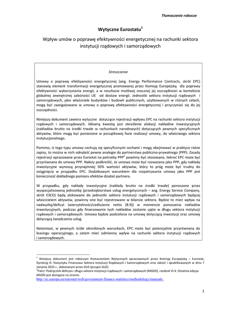 Tłumaczenie robocze Wytyczne Eurostatu1 Wpływ umów o poprawę efektywności energetycznej na rachunki sektora instytucji rządowych i samorządowych Streszczenie Umowy o poprawę efektywności energetycznej (ang. Energy Performance Contracts, skrót EPC) stanowią element transformacji energetycznej promowanej przez Komisję Europejską dla poprawy efektywności wykorzystania energii, a w rezultacie możliwej znacznej jej oszczędności w kontekście globalnej zewnętrznej zależności UE od dostaw energii. Jednostki sektora instytucji rządowych i samorządowych, jako właściciele budynków i budowli publicznych, użytkowanych w różnych celach, mogą być zaangażowane w umowy o poprawę efektywności energetycznej i przyczyniać się do jej oszczędności. Niniejszy dokument zawiera wytyczne dotyczące rejestracji wpływu EPC na rachunki sektora instytucji rządowych i samorządowych. Główną kwestią jest określenie alokacji nakładów inwestycyjnych (nakładów brutto na środki trwałe w rachunkach narodowych) dotyczących pewnych specyficznych aktywów, które mogą być poniesione w początkowej fazie realizacji umowy, do właściwego sektora instytucjonalnego. Pomimo, iż tego typu umowy cechują się specyficznymi cechami i mogą obejmować w praktyce różne zapisy, to można w nich odnaleźć pewne analogie do partnerstwa publiczno-prywatnego (PPP). Zasady rejestracji opracowane przez Eurostat na potrzeby PPP2 powinny być stosowane, ilekroć EPC może być przyrównana do umowy PPP. Należy podkreślić, że umowa może być rozważana jako PPP, gdy nakłady inwestycyjne wynoszą przynajmniej 50% wartości aktywów, który to próg może być trudny do osiągnięcia w przypadku EPC. Dodatkowym warunkiem dla rozpatrywania umowy jako PPP jest konieczność dokładnego pomiaru efektów działań partnera. W przypadku, gdy nakłady inwestycyjne (nakłady brutto na środki trwałe) ponoszone przez wyspecjalizowaną jednostkę (przedsiębiorstwo usług energetycznych – ang. Energy Service Company, skrót ESCO) będą alokowane do jednostki sektora instytucji rządowych i samorządowych będącej właścicielem aktywów, powinny one być rejestrowane w bilansie sektora. Będzie to mieć wpływ na nadwyżkę/deficyt (wierzytelności/zadłużenie netto (B.9)) w momencie ponoszenia nakładów inwestycyjnych, podczas gdy finansowanie tych nakładów zostanie ujęte w długu sektora instytucji rządowych i samorządowych. Umowa będzie podzielona na umowę dotyczącą inwestycji oraz umowę dotyczącą świadczenia usług. Natomiast, w pewnych ściśle określonych warunkach, EPC może być potencjalnie przyrównana do leasingu operacyjnego, a zatem mieć odmienny wpływ na rachunki sektora instytucji rządowych i samorządowych. 1 Niniejszy dokument jest roboczym tłumaczeniem Wytycznych opracowanych przez Komisję Europejską – Eurostat, Dyrekcję D: Statystyka Finansowa Sektora Instytucji Rządowych i Samorządowych oraz Jakość i opublikowanych w dniu 7 sierpnia 2015 r., dokonanym przez GUS (przypis GUS) 2 Patrz: Podręcznik deficytu i długu sektora instytucji rządowych i samorządowych (MGDD), rozdział VI.4. Ostatnia edycja MGDD jest dostępna na stronie: http://ec.europa.eu/eurostat/web/government-finance-statistics/methodology/manuals. 1 Tłumaczenie robocze 1.Wprowadzenie Problem efektywności energetycznej W ostatnich latach, w kontekście łagodzenia skutków zmian klimatu oraz zmniejszenia zależności UE od zewnętrznych źródeł energii, pojawiło się, na szczeblu UE, wiele inicjatyw dotyczących oszczędności energii.3 W tym kontekście, w celu poprawy efektywności wykorzystania zasobów energii, Komisja Europejska opracowała Dyrektywę w sprawie efektywności energetycznej (ang. Energy Efficiency Directive), która weszła w życie w dniu 4 grudnia 2012 r. Większość jej zapisów miała być przyjęta przez państwa członkowskie do 5 czerwca 2014 r. W tej sytuacji pojawiły się nowe rodzaje umów, w których jedną ze stron jest wyspecjalizowana jednostka określana jako „przedsiębiorstwo usług energetycznych” (ESCO), która dostarcza, za pomocą różnych środków, usługi mające na celu redukcję zużycia energii. Wynagrodzenie ESCO zależy od wyników osiągniętych w zakresie oszczędności energii, mierzonych za pomocą zestawu wskaźników. Oczekuje się, że jednostki ESCO będą specjalizować się w usługach mających na celu oszczędność energii. Mogą one być niezależne lub być oddziałami firm budowlanych (szczególnie w przypadku dużych międzynarodowych korporacji) lub energetycznych. Może również zostać utworzone konsorcjum grupujące jednostki z różnych branż. Dla specyficznych działań mogą być także tworzone spółki projektowe lub jednostki specjalnego przeznaczenia. W rachunkach narodowych jednostki ESCO są zazwyczaj uznawane za producentów rynkowych. Sektor instytucji rządowych i samorządowych jest zainteresowany zawieraniem umów o poprawę efektywności energetycznej, jako właściciel licznych budynków wykorzystywanych dla różnych sfer działalności publicznej (takich jak np. opieka zdrowotna, edukacja, administracja, bezpieczeństwo). Często zdarza się, iż budynki te cechują się niską efektywnością energetyczną. Budynki sektora instytucji rządowych i samorządowych mogą być obiektami starymi i wybudowanymi zgodnie z już zdezaktualizowanymi normami i przestarzałą technologią, w czasach gdy energia była szczególnie tania. Ich utrzymanie może być zaniedbane, a zachowanie użytkowników może prowadzić do marnotrawstwa energii. Ze względu na możliwe wysokie wydatki na renowację oraz w kontekście ograniczeń budżetowych w wielu państwach UE, jednostki sektora instytucji rządowych i samorządowych, dla celów poprawy efektywności energetycznej, mogą zawierać różnego rodzaju umowy z wyspecjalizowanymi podmiotami, często obserwowane od długiego czasu w innych obs