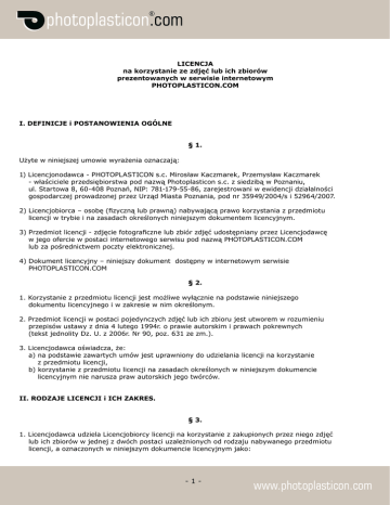 photoplasticon.com ® LICENCJA na korzystanie ze zdjęć lub ich zbiorów prezentowanych w serwisie internetowym PHOTOPLASTICON.COM I. DEFINICJE i POSTANOWIENIA OGÓLNE § 1. Użyte w niniejszej umowie wyrażenia oznaczają: 1) Licencjonodawca - PHOTOPLASTICON s.c. Mirosław Kaczmarek, Przemysław Kaczmarek - właściciele przedsiębiorstwa pod nazwą Photoplasticon s.c. z siedzibą w Poznaniu, ul. Startowa 8, 60-408 Poznań, NIP: 781-179-55-86, zarejestrowani w ewidencji działalności gospodarczej prowadzonej przez Urząd Miasta Poznania, pod nr 35949/2004/s i 52964/2007. 2) Licencjobiorca – osobę (fizyczną lub prawną) nabywającą prawo korzystania z przedmiotu licencji w trybie i na zasadach określonych niniejszym dokumentem licencyjnym. 3) Przedmiot licencji - zdjęcie fotograficzne lub zbiór zdjęć udostępniany przez Licencjodawcę w jego ofercie w postaci internetowego serwisu pod nazwą PHOTOPLASTICON.COM lub za pośrednictwem poczty elektronicznej. 4) Dokument licencyjny – niniejszy dokument dostępny w internetowym serwisie PHOTOPLASTICON.COM § 2. 1. Korzystanie z przedmiotu licencji jest możliwe wyłącznie na podstawie niniejszego dokumentu licencyjnego i w zakresie w nim określonym. 2. Przedmiot licencji w postaci pojedynczych zdjęć lub ich zbioru jest utworem w rozumieniu przepisów ustawy z dnia 4 lutego 1994r. o prawie autorskim i prawach pokrewnych (tekst jednolity Dz. U. z 2006r. Nr 90, poz. 631 ze zm.). 3. Licencjodawca oświadcza, że: a) na podstawie zawartych umów jest uprawniony do udzielania licencji na korzystanie z przedmiotu licencji, b) korzystanie z przedmiotu licencji na zasadach określonych w niniejszym dokumencie licencyjnym nie narusza praw autorskich jego twórców. II. RODZAJE LICENCJI i ICH ZAKRES. § 3. 1. Licencjodawca udziela Licencjobiorcy licencji na korzystanie z zakupionych przez niego zdjęć lub ich zbiorów w jednej z dwóch postaci uzależnionych od rodzaju nabywanego przedmiotu licencji, a oznaczonych w niniejszym dokumencie licencyjnym jako: -1- www.photoplasticon.com photoplasticon.com ® a) TYP A - LICENCJA PODSTAWOWA – udzielana w odniesieniu do zdjęć oznaczonych w internetowej ofercie PHOTOPLASTICON.COM symbolem: IMG_.TIFF b) TYP B - LICENCJA OGRANICZONA - udzielana w odniesieniu do zdjęć oznaczonych w internetowej ofercie PHOTOPLASTICON.COM symbolem: img_.jpg § 4. TYP A - LICENCJA PODSTAWOWA. 1. W chwili uiszczenia opłaty licencyjnej Licencjobiorca nabywa prawo korzystania z przedmiotu licencji na zasadach określonych niniejszym dokumentem licencyjnym. Licencja ta jest: - udzielona na okres 5 lat, - nieograniczona co do terytorium, - niewyłączna, - niezbywalna. 2. Licencjobiorca ma prawo wykorzystywać przedmiot licencji: 1) wyłącznie jako element składowy innego produktu, stanowiącego samodzielny przedmiot obrotu, 2) na wszelkich polach eksploatacji znanych w dacie nabycia licencji 3. Przy zachowaniu warunków określonych w ust. 2 pkt 1 i 2 Licencjobiorca ma w odniesieniu do przedmiotu licencji prawo: a) utrwalania i zwielokrotniania dowolną techniką, w tym drukarską, reprograficzną, cyfrową i techniką zapisu magnetycznego, b) wprowadzania do obrotu, użyczania i wynajmowania, c) rozpowszechniania w środkach przekazu wizualnego, d) dokonywania modyfikacji i aranżacji z zastrzeżeniami wynikającymi z postanowień niniejszego dokumentu licencyjnego. § 5. TYP B - LICENCJA OGRANICZONA. 1. W chwili uiszczenia opłaty licencyjnej Licencjobiorca nabywa prawo korzystania z przedmiotu licencji na zasadach określonych niniejszym dokumentem licencyjnym. Licencja ta jest: - udzielona na okres 5 lat, - nieograniczona co do terytorium, - niewyłączna, - niezbywalna. 2. Licencjobiorca ma prawo wykorzystywać przedmiot licencji wyłącznie dla celów projektowania stron internetowych www, e-mail, video, a także na własny użytek wewnętrzny jednak wyłącznie w postaci elektronicznej, z wyłączeniem wszelkich form utrwalania lub zwielokrotniania jakąkolwiek techniką. 3. Ewentualne dokonywanie modyfikacji przedmiotu licencji lub jego aranżacji w procesie projektowania nie może wykraczać poza zastrzeżenia wynikające z niniejszego dokumentu licencyjnego. -2- www.photoplasticon.com photoplasticon.com ® III. ZASADY DOTYCZĄCE OBU RODZAJÓW LICENCJI: typu A i B. § 6. 1. Licencjobiorca nie ma prawa: a) utrwalania, zwielokrotniania, wprowadzania do obrotu oraz rozpowszechniania przedmiotu licencji na jakimkolwiek polu eksploatacji jako samodzielnego produktu, b) przenoszenia praw wynikających z niniejszej umowy na osoby trzecie w jakiejkolwiek formie, ani udzielania sublicencji, c) oddawania przedmiotu licencji w postaci oryginalnej osobom trzecim na podstawie jakichkolwiek umów, d) wykorzystywania przedmiotu licencji jako elementu składowego produktów obrażających uczucia religijne lub naruszających dobre obyczaje, w tym produktów o charakterze pornograficznym. 2. W razie wprowadzenia przedmiotu licencji do pamięci komputera Licencjobiorca zobowiązany jest do zabezpieczenia go przed wykorzystaniem przez osoby trzecie. 3. Licencjobiorca jest odpowiedzialny wobec Licencjodawcy za wszelką szkodę powstałą wskutek posłużenia się przedmiotem licencji przez osoby trzecie w sposób zabroniony niniejszą umową. IV. ZASADY ROZPOWSZECHNIANIA WIZERUNKU OSÓB. § 7. 1. Licencjobiorca oświadcza, że znane mu są zasady ochrony prawnej wizerunku osób sfotografowanych w ramach przedmiotu licencji i w związku z tym zobowiązuje się korzystać z przedmiotu licencji w sposób nie naruszający dóbr osobistych osób sportretowanych. 2. W szczególności przy wykorzystywaniu wizerunku osób Licencjobiorcę obowiązują następujące zakazy: - przedstawiania osób sportretowanych w negatywnym świetle lub w niekorzystnym kontekście w sposób naruszający ich godność, - zniekształcania wizerunku, - wkomponowania wizerunku w obraz lub inny przedmiot w sposób naruszający dobre obyczaje lub prezen
