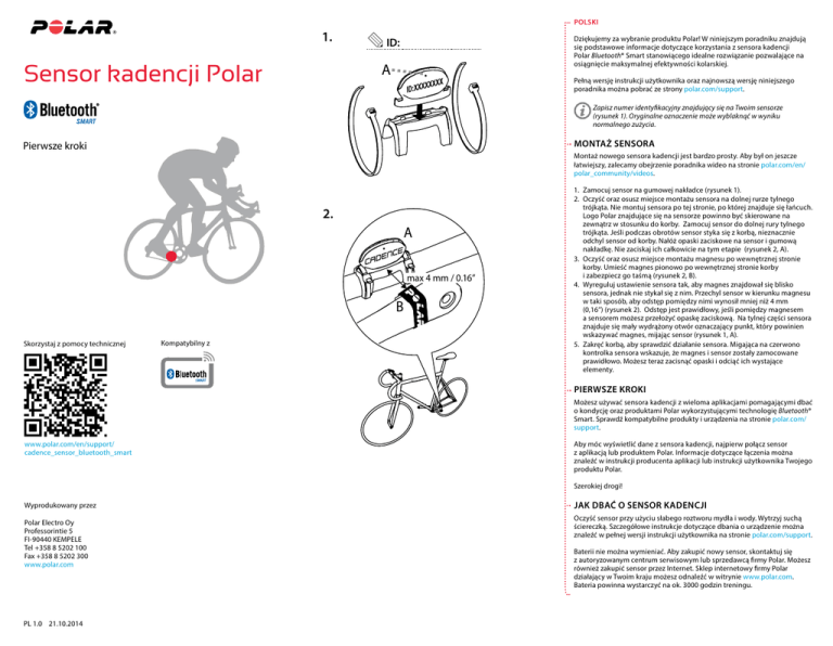 POLSKI 1. Sensor kadencji Polar Dziękujemy za wybranie produktu Polar! W niniejszym poradniku znajdują się podstawowe informacje dotyczące korzystania z sensora kadencji Polar Bluetooth® Smart stanowiącego idealne rozwiązanie pozwalające na osiągnięcie maksymalnej efektywności kolarskiej. ID: A Pełną wersję instrukcji użytkownika oraz najnowszą wersję niniejszego poradnika można pobrać ze strony polar.com/support. Zapisz numer identyfikacyjny znajdujący się na Twoim sensorze (rysunek 1). Oryginalne oznaczenie może wyblaknąć w wyniku normalnego zużycia. MONTAŻ SENSORA Pierwsze kroki Montaż nowego sensora kadencji jest bardzo prosty. Aby był on jeszcze łatwiejszy, zalecamy obejrzenie poradnika wideo na stronie polar.com/en/ polar_community/videos. 2. A max 4 mm / 0.16” B Skorzystaj z pomocy technicznej Kompatybilny z 1. Zamocuj sensor na gumowej nakładce (rysunek 1). 2. Oczyść oraz osusz miejsce montażu sensora na dolnej rurze tylnego trójkąta. Nie montuj sensora po tej stronie, po której znajduje się łańcuch. Logo Polar znajdujące się na sensorze powinno być skierowane na zewnątrz w stosunku do korby. Zamocuj sensor do dolnej rury tylnego trójkąta. Jeśli podczas obrotów sensor styka się z korbą, nieznacznie odchyl sensor od korby. Nałóż opaski zaciskowe na sensor i gumową nakładkę. Nie zaciskaj ich całkowicie na tym etapie (rysunek 2, A). 3. Oczyść oraz osusz miejsce montażu magnesu po wewnętrznej stronie korby. Umieść magnes pionowo po wewnętrznej stronie korby i zabezpiecz go taśmą (rysunek 2, B). 4. Wyreguluj ustawienie sensora tak, aby magnes znajdował się blisko sensora, jednak nie stykał się z nim. Przechyl sensor w kierunku magnesu w taki sposób, aby odstęp pomiędzy nimi wynosił mniej niż 4 mm (0,16’’) (rysunek 2). Odstęp jest prawidłowy, jeśli pomiędzy magnesem a sensorem możesz przełożyć opaskę zaciskową. Na tylnej części sensora znajduje się mały wydrążony otwór oznaczający punkt, który powinien wskazywać magnes, mijając sensor (rysunek 1, A). 5. Zakręć korbą, aby sprawdzić działanie sensora. Migająca na czerwono kontrolka sensora wskazuje, że magnes i sensor zostały zamocowane prawidłowo. Możesz teraz zacisnąć opaski i odciąć ich wystające elementy. PIERWSZE KROKI Możesz używać sensora kadencji z wieloma aplikacjami pomagającymi dbać o kondycję oraz produktami Polar wykorzystującymi technologię Bluetooth® Smart. Sprawdź kompatybilne produkty i urządzenia na stronie polar.com/ support. www.polar.com/en/support/ cadence_sensor_bluetooth_smart Aby móc wyświetlić dane z sensora kadencji, najpierw połącz sensor z aplikacją lub produktem Polar. Informacje dotyczące łączenia można znaleźć w instrukcji producenta aplikacji lub instrukcji użytkownika Twojego produktu Polar. Szerokiej drogi! Wyprodukowany przez Polar Electro Oy Professorintie 5 FI-90440 KEMPELE Tel +358 8 5202 100 Fax +358 8 5202 300 www.polar.com PL 1.0 21.10.2014 JAK DBAĆ O SENSOR KADENCJI Oczyść sensor przy użyciu słabego roztworu mydła i wody. Wytrzyj suchą ściereczką. Szczegółowe instrukcje dotyczące dbania o urządzenie można znaleźć w pełnej wersji instrukcji użytkownika na stronie polar.com/support. Baterii nie można wymieniać. Aby zakupić nowy sensor, skontaktuj się z autoryzowanym centrum serwisowym lub sprzedawcą firmy Polar. Możesz również zakupić sensor przez Internet. Sklep internetowy firmy Polar działający w Twoim kraju możesz odnaleźć w witrynie www.polar.com. Bateria powinna wystarczyć na ok. 3000 godzin treningu.