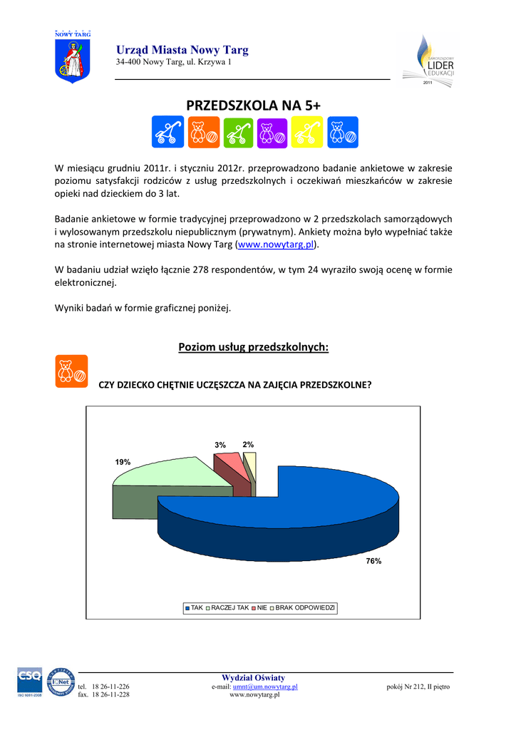 Urząd Miasta Nowy Targ 34-400 Nowy Targ, ul. Krzywa 1 PRZEDSZKOLA NA 5+ W miesiącu grudniu 2011r. i styczniu 2012r. przeprowadzono badanie ankietowe w zakresie poziomu satysfakcji rodziców z usług przedszkolnych i oczekiwań mieszkańców w zakresie opieki nad dzieckiem do 3 lat. Badanie ankietowe w formie tradycyjnej przeprowadzono w 2 przedszkolach samorządowych i wylosowanym przedszkolu niepublicznym (prywatnym). Ankiety można było wypełniać także na stronie internetowej miasta Nowy Targ (www.nowytarg.pl). W badaniu udział wzięło łącznie 278 respondentów, w tym 24 wyraziło swoją ocenę w formie elektronicznej. Wyniki badań w formie graficznej poniżej. Poziom usług przedszkolnych: CZY DZIECKO CHĘTNIE UCZĘSZCZA NA ZAJĘCIA PRZEDSZKOLNE? 3% 2% 19% 76% TAK RACZEJ TAK NIE BRAK ODPOWIEDZI Wydział Oświaty tel. 18 26-11-226 fax. 18 26-11-228 e-mail: [email protected] www.nowytarg.pl pokój Nr 212, II piętro CZY PRZEDSZKOLE DOBRZE PRZYGOTOWUJE DZIECI DO NAUKI W SZKOLE? 1% 3% 1% 18% 77% TAK RACZEJ TAK NIE NIE MAM ZDANIA BRAK ODPOWIEDZI JAK OCENIA PANI/PAN WSPÓŁPRACĘ Z NAUCZYCIELAMI I PRACOWNIKAMI NIEPEDAGOGICZNYMI ? 12% 1% 1% 86% DOBRZE RACZEJ DOBRZE ŹLE BRAK ODPOWIEDZI Wydział Oświaty tel. (0-18) 26-11-226 fax. (0-18) 26-11-228 e-mail: [email protected] www.nowytarg.pl pokój Nr 212, II piętro JAK OCENIA PANI/PAN SPOSÓB PRZEKAZYWANIA RODZICOM INFORMACJI O POSTĘPACH DZIECKA ? 2% 1% 24% 73% DOBRZE RACZEJ DOBRZE ŹLE BRAK ODPOWIEDZI CZY JEST PANI/PAN ZADOWOLONA/NY Z OFERTY ZAJĘĆ DODATKOWYCH PRZEDSZKOLA? 7% 1% 3% 23% 66% TAK RACZEJ TAK NIE NIE KORZYSTAM BRAK ODPOWIEDZI Wydział Oświaty tel. (0-18) 26-11-226 fax. (0-18) 26-11-228 e-mail: [email protected] www.nowytarg.pl pokój Nr 212, II piętro Oczekiwania w zakresie opieki nad dzieckiem do 3 lat. Z JAKIEJ FORMY OPIEKI NAD DZIECKIEM DO LAT TRZECH KORZYSTA PANI/PAN W CHWILI OBECNEJ? 1% 15% 46% 38% NIE KORZYSTAM (SAMODZIELNIE) POMOC RODZINY OPIEKUNKA INNE Z JAKICH FORM OPIEKI NAD DZIECKIEM DO LAT 3 SKORZYSTALIBY PAŃSTWO NAJCHĘTNIEJ ? 8% 12% 28% 11% 41% DZIENNY OPIEKUN KLUB DZIECIĘCY ŻŁOBEK NIANIA ŻADNEJ Wydział Oświaty tel. (0-18) 26-11-226 fax. (0-18) 26-11-228 e-mail: [email protected] www.nowytarg.pl pokój Nr 212, II piętro CZY MAJĄC MOŻLIWOŚĆ ZAPEWNIENIA OPIEKI NAD DZIECKIEM DO LAT 3 PODJĘŁABY (KONTYNUOWAŁABY) PANI / PODJĄŁBY (KONTYNUOWAŁBY) PAN PRACĘ ZAWODOWĄ ? 17% 7% 2% 74% TAK NIE NIE WIEM BRAK ODPOWIEDZI MAJĄC MOŻLIWOŚĆ ZAPEWNIENIA OPIEKI NAD DZIECKIEM DO LAT 3 DO JAKIEJ KWOTY MOGŁABY/MÓGŁBY PANI/PAN UISZCZAĆ OPŁATĘ MIESIĘCZNA ZA DZIECKO ? 5% 2% 3% 20% 70% 250-349 ZŁ 350-449 ZŁ 450-549 ZŁ WIĘCEJ NIŻ 550 ZŁ BRAK ODPOWIEDZI Wydział Oświaty tel. (0-18) 26-11-226 fax. (0-18) 26-11-228 e-mail: [email protected] www.nowytarg.pl pokój Nr 212, II piętro Ogólne dane statystyczne badanej grypy (próby). Spośród wszystkich ankietowanych 99% badanych stanowili mieszkańcy Nowego Targu. 43% ankietowanych korzystających z usług przedszkolnych wychowuje dodatkowo co najmniej 1 dziecko w wieku do lat 3 (9% dwoje i więcej dzieci w wieku do lat 3). 81% badanych stanowiły osoby aktywne zawodowo. Struktura dochodów w rodzinach ankietowanych: ŚREDNI MIESIĘCZNY DOCHÓD W PRZELICZENIU NA CZŁONKA RODZINY 16% 5% 15% 23% 41% PONIŻEJ 500 ZŁ 500-1.000ZŁ 1.001-1.500 ZŁ POWYŻEJ 1.500 ZŁ BRAK ODPOWIEDZI Podsumowanie Ankietowani bardzo dobrze oceniają aktualny poziom usług przedszkolnych, chociaż oczekują uatrakcyjnienia i zwiększenia katalogu zajęć dodatkowych a także nieznacznych korekt w czasie pracy poszczególnych placówek w odniesieniu do czasu pracy zakładów pracy. Rodzice wyrażają zainteresowanie różnymi. formami opieki nad dzieckiem do 3 lat. W szczególności oczekują na inicjatywy w zakresie utworzenia żłobka, wyrażając również zainteresowanie zorganizowaniem opieki w klubach dziecięcych i za pośrednictwem niani. Z uwagi na poziom dochodów rodzin, ankietowani widzą możliwości współfinansowania działalności w zakresie opieki nad dziećmi do 3 lat w różnych formach zorganizowanych przez gminę (inne podmioty) na poziomie 39 % kosztów ich prowadzenia. Opracowanie: mgr Janusz Stopka mgr Krzysztof Aksamit Elżbieta Kakuba Wydział Oświaty tel. (0-18) 26-11-226 fax. (0-18) 26-11-228 e-mail: [email protected] www.nowytarg.pl pokój Nr 212, II piętro