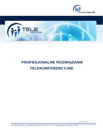 PROFESJONALNE ROZWIĄZANIE TELEKONFERENCYJNE www.focustelecom.pl Focus Telecom Polska Sp. z o.o. , ul. Wilcza 31/1A, 00-544 Warszawa, zarejestrowana w Sądzie Rejonowym dla m.st. Warszawy w Warszawie, XII Wydział Gospodarczy Krajowego Rejestru Sądowego pod numerem KRS 0000298832. REGON: 141318537. NIP: 701-01-08-702. Kapitał Zakładowy 52.000 zł wpłacony w całości www.focustelecom.pl Szanowni Państwo, Focus Telecom Polska Sp. z o.o. jest dostawcą nowoczesnych rozwiązań telekomunikacyjnych dla klientów biznesowych i instytucjonalnych. Stawiamy na jakość i funkcjonalność naszych produktów niejednokrotnie dostosowując je do potrzeb zainteresowanego klienta. Mamy przyjemność przedstawić Państwu usługę telekonferencji, owoc naszych kilkumiesięcznych konsultacji z klientami. Produkt został tak zaprojektowany aby mógł ewaluować w miarę rosnących potrzeb naszych obecnych i potencjalnych klientów. Telemeeting w szczegółach: Usługa ta daje Państwu własny panel do zarządzania telekonferencjami organizowanymi przez Państwa firmę przez 24 godziny na dobę, 7 dni w tygodniu bez konieczności kontaktu z Focus Telecom Polska Sp. z o.o.. Zamawiać można dowolną ilość telekonferencji w dowolnym terminie. Jedyne ograniczenie to liczba osób biorących udział w jednej telekonferencji (max. 58). Jeżeli w Państwa firmie będzie potrzeba organizowania większych telekonferencji niezbędny będzie kontakt bezpośredni z Focus Telecom Polska Sp. z o.o.. Po podpisaniu umowy otrzymają Państwo numer klienta oraz hasło, które pozwolą korzystać z panelu zarządzającego przez dowolną liczbę pracowników w tym samym czasie. Do Państwa dyspozycji oddajemy dwa rodzaje telekonferencji: • Standard* • On-line* *Oba rodzaje wykorzystują geograficzny numer dostępowy. Cennik Stawka za osobę/min 0,45 PLN/netto* Koszt telekonferencji to iloczyn liczby osób, czasu i stawki za osobę. Np.: 5 osób, 15 min 5x15x0,45=33,75 PLN/netto *Oba rodzaje telekonferencji (Standard, On-line) www.focustelecom.pl Focus Telecom Polska Sp. z o.o. , ul. Wilcza 31/1A, 00-544 Warszawa, zarejestrowana w Sądzie Rejonowym dla m.st. Warszawy w Warszawie, XII Wydział Gospodarczy Krajowego Rejestru Sądowego pod numerem KRS 0000298832. REGON: 141318537. NIP: 701-01-08-702. Kapitał Zakładowy 52.000 zł wpłacony w całości Strona 2 z 3 www.focustelecom.pl Telemeeting korzyści i zalety: konkurencyjność i nowoczesność bezpieczeństwo i niezawodność prostota i łatwość obsługi wysoka jakość dźwięku oszczędności czasu i pieniędzy brak abonamentu i opłat instalacyjnych brak inwestycji w sprzęt i oprogramowanie elastyczne zarządzanie możliwość przedłużania telekonferencji bez ograniczeń automatyczne zapraszanie uczestników dwujęzyczność (zaproszenia, zapowiedzi głosowe, oba panele) własna książka adresowa możliwość zdefiniowania grup uczestników, np. Warszawa, New York, Sydney szeroki wachlarz możliwości panelu telekonferencyjnego możliwość przeszkolenia pracowników Państwa firmy zdalne prezentacje Power Point możliwość wydzwaniania do uczestników telekonferencji Już teraz mogą Państwo zapoznać się z wersją DEMO !!! www.focustelecom.pl Zapraszamy do współpracy www.focustelecom.pl Focus Telecom Polska Sp. z o.o. , ul. Wilcza 31/1A, 00-544 Warszawa, zarejestrowana w Sądzie Rejonowym dla m.st. Warszawy w Warszawie, XII Wydział Gospodarczy Krajowego Rejestru Sądowego pod numerem KRS 0000298832. REGON: 141318537. NIP: 701-01-08-702. Kapitał Zakładowy 52.000 zł wpłacony w całości Strona 3 z 3