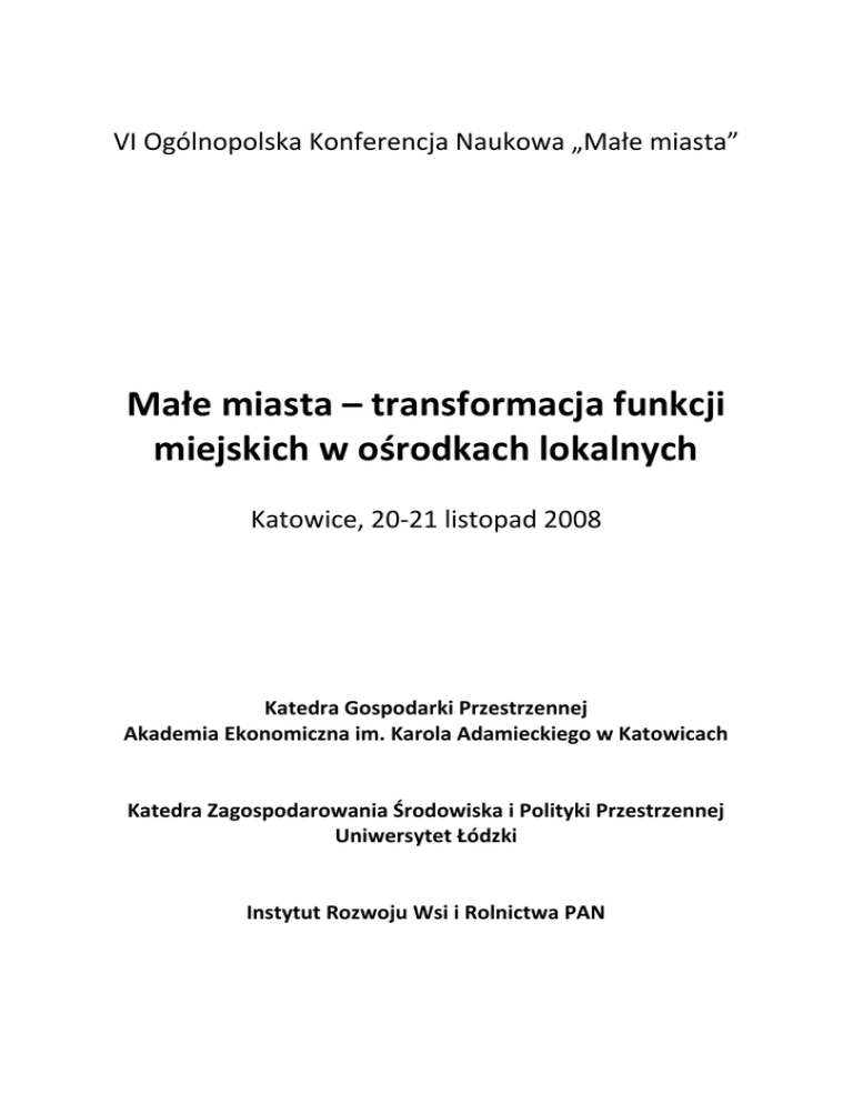 VI Ogólnopolska Konferencja Naukowa „Małe miasta” Małe miasta – transformacja funkcji miejskich w ośrodkach lokalnych Katowice, 20-21 listopad 2008 Katedra Gospodarki Przestrzennej Akademia Ekonomiczna im. Karola Adamieckiego w Katowicach Katedra Zagospodarowania Środowiska i Polityki Przestrzennej Uniwersytet Łódzki Instytut Rozwoju Wsi i Rolnictwa PAN W imieniu organizatorów mam zaszczyt zaprosid na VI Ogólnopolską Konferencję Naukową pt. MAŁE MIASTA – TRANSFORMACJA FUNKCJI MIEJSKICH W OŚRODKACH LOKALNYCH, która odbędzie się odbędzie się w dniach 20-21 listopada 2008 r. w Centrum Konferencyjnym Akademii Ekonomicznej im. Karola Adamieckiego w Katowicach przy ul. Pułaskiego 25 (budynek P). Zaproszenie skierowane jest zarówno do środowisk naukowych zainteresowanych powyższą problematyką jak i do przedstawicieli władz samorządowych małych miast. prof. zw. dr hab. Krystian Heffner Katedra Gospodarki Przestrzennej Akademia Ekonomiczna im. Karola Adamieckiego w Katowicach Cele konferencji: Prezentacja dorobku naukowego, przegląd praktyk oraz dyskusja na temat przemian przestrzennych, środowiskowych, gospodarczych, społecznych i kulturowych zachodzących w małych ośrodkach miejskich Integracja środowisk ekonomistów, geografów, socjologów, urbanistów i architektów podejmujących badania naukowe z zakresu rozwoju małych miast Tematyka Konferencji: Monitorowanie zmian funkcji miejskich w małych ośrodkach lokalnych pod wpływem nowych procesów gospodarczych Znaczenie funkcji mieszkaniowej, usługowej i przemysłowej w rozwoju małych miast Małe miasta jako ośrodki wielofunkcyjne Segregacja funkcji w przestrzeni małych miast Przekształcenia funkcjonalne a formowanie centrów ośrodków lokalnych Konkurencja w zakresie rozwoju funkcji usługowych małych miast i dużych centrów handlowych Rewitalizacja małych miast Funkcje rolnicze w rozwoju ośrodków lokalnych Rada Programowa Konferencji: prof. dr hab. Krystian Heffner /Akademia Ekonomiczna w Katowicach/ - przewodniczący prof. dr hab. Andrzej Klasik /Akademia Ekonomiczna w Katowicach/ prof. dr hab. Marek Kłodzioski /Instytut Wsi i Rolnictwa PAN/ prof. dr hab. Florian Kuźnik /Akademia Ekonomiczna w Katowicach/ prof. dr hab. Tadeusz Marszał /Uniwersytet Łódzki/ prof. dr hab. Zbigniew Przybyła /Uniwersytet Ekonomiczny we Wrocławiu/ prof. dr hab. Andrzej Rosner /Instytut Wsi i Rolnictwa PAN/ prof. dr hab. Daniela Szymaoska /Uniwersytet Mikołaja Kopernika w Toruniu/ prof. dr hab. Zygmunt Szymla /Uniwersytet Ekonomiczny w Krakowie/ 2 Warunki uczestnictwa: Opłata konferencyjna: 400 zł. Opłata obejmuje: 2 obiady, uroczystą kolację, przerwy kawowe, materiały konferencyjne, wydanie recenzowanej publikacji naukowej. Opłatę konferencyjną prosimy wpłacid do 20 października 2008 na rachunek: Akademia Ekonomiczna im. Karola Adamieckiego w Katowicach ul. 1 Maja 50, 40-287 Katowice ING VII Oddział Katowice 65 1050 1214 1000 0007 0000 7974 z dopiskiem „Małe miasta” Uczestnicy konferencji naukowej zapewniają nocleg we własnym zakresie. Poniżej propozycje noclegów w Katowicach: 1. Novotel Katowice Centrum, al. Rozdzieńskiego 16, [email protected], tel. 032/200 44 44 2. Etap Hotel Katowice Centrum al. Rozdzieńskiego 18, [email protected], 32/350 50 40 3. Hotel Senator ul. 1 Maja 3, [email protected], tel. 032/258 60 81 4. Hotel Asystencki Uniwersytetu Śląskiego ul. Paderewskiego 32, [email protected], tel. 032/255 44 33 Referaty i publikacja książkowa Osoby pragnące przedstawid referat proszone są o nadesłanie streszczenia swojego wystąpienia do dnia 30 września 2008. Nadsyłane streszczenia (o objętości do 1 strony A4) powinny zawierad: - Tytuł referatu, - Kluczowe słowa, - Streszczenie referatu - Informacje o autorach (imię, nazwisko, instytucja, telefon, e-mail) Streszczenia w formacie edytora MsWord, należy przesyład drogą elektroniczną na adres: [email protected] Rada Programowa Konferencji poinformuje autorów o zaakceptowaniu ich referatów do dnia 6 października 2008. Pełne teksty referatów prosimy przesład drogą elektroniczną do 17 listopada 2008. Artykuły zatwierdzone przez Radę Programową Konferencji oraz pozytywnie zaopiniowane przez zewnętrznych recenzentów zostaną opublikowane w Wydawnictwie Uczelnianym Akademii Ekonomicznej im. Karola Adamieckiego w Katowicach. Ważne terminy: Nadesłanie streszczeo referatów: Informacja o przyjęciu referatu: Zgłoszenie udziału oraz dokonanie wpłaty: Termin konferencji: 30 wrzesieo 2008 6 październik 2008 20 październik 2008 20-21 listopad 2008 3 Miejsce obrad: Akademia Ekonomiczna im. Karola Adamieckiego w Katowicach ul. Pułaskiego 25 Budynek P Sekretariat Konferencji: dr Adam Polko – sekretarz konferencji Katedra Gospodarki Przestrzennej Akademia Ekonomiczna im. Karola Adamieckiego w Katowicach ul. 1 Maja 50 40-287 Katowice tel.: 032 257 74 11 tel./fax: 032 257 74 13 e-mail: [email protected] Ramowy Program Konferencji: 20 listopad 2008 /czwartek/ 10.30 – 11.00 Rejestracja uczestników 11.00 – 11.15 Otwarcie konferencji 11.15 – 12.30 Sesja plenarna I 12.30 – 12.45 Przerwa kawowa 12.45 – 14.00 Sesja plenarna II 14.00 – 15.00 Obiad 15.00 – 16.30 Sesja plenarna III 16.30 – 16.45 Przerwa kawowa 16.45 – 18.00 Sesja plenarna IV 19.00 – Uroczysta kolacja 21 listopad 2008 /piątek/ 9.00 – 10.30 Sesja V 10.30 – 10.45 Przerwa kawowa 10.45 – 12.30 Sesja VI 12.30 – 13.00 Podsumowanie obrad 13.00 – 14.00 Obiad i wyjazd gości 4