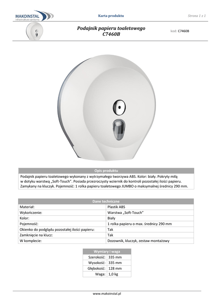 Karta produktu Podajnik papieru toaletowego C7460B Strona 1 z 1 kod: C7460B Opis produktu Podajnik papieru toaletowego wykonany z wytrzymałego tworzywa ABS. Kolor: biały. Pokryty miłą w dotyku warstwą „Soft-Touch”. Posiada przezroczysty wziernik do kontroli pozostałej ilości papieru. Zamykany na kluczyk. Pojemność: 1 rolka papieru toaletowego JUMBO o maksymalnej średnicy 290 mm. Dane techniczne Materiał: Plastik ABS Wykończenie: Warstwa „Soft-Touch” Kolor: Biały Pojemność: 1 rolka papieru o max. średnicy 290 mm Okienko do podglądu pozostałej ilości papieru: Tak Zamknięcie na klucz: Tak W komplecie: Dozownik, kluczyk, zestaw montażowy Wymiary i waga Szerokość: 335 mm Wysokość: 335 mm Głębokość: 128 mm Waga: 1,0 kg www.makoinstal.pl