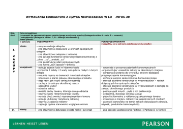 WYMAGANIA EDUKACYJNE Z JĘZYKA NIEMIECKIEGO W LO Rozdział Cele szczegółowe (czynności do opanowania przez ucznia/grupę w zakresie wiedzy (kategoria celów A – wie, B – rozumie) i umiejętności (kategoria celów: C, D – stosuje wiadomości ) Uczeń potrafi: w zakresie PODSTAWOWYM PONADPODSTAWOWYM (wszystko, co w zakresie podstawowym i ponadto) wiedzy - nazywa rodzaje sklepów 1. Z A K U P Y 2. INFOS 3B umiejętności wiedzy - zna słownictwo stosowane w ofertach specjalnych sklepów - zna słownictwo związane z reklamą - zna zasadę tworzenia konstrukcji bezokolicznikowej z „ohne …zu”, „anstatt…zu” - zna konstrukcję zdań porównawczych - zna formę „sich lasssen“+Infinitiv - opisuje zdjęcie ludzi w hipermarkecie -wymienia 2 zalety i 2 wady zakupów w małym i dużym sklepie - rozumie napisy na banerach i ulotkach sklepów - informuje o planie zakupu określonego produktu - daje rady, jak kupić taniej/korzystniej - zachęca do zakupu określonej rzeczy - uzasadnia wybór - odradza zakup - określa cechy towaru, którego zakup odradza - nazywa wady reklamowanego towaru - wyraża chęć zwrotu/ naprawy/wymiany towaru - opisuje ulubioną/ nielubianą reklamę - nazywa 2 zadania reklamy - zajmuje ogólne stanowisko względem reklam - opowiada o przyzwyczajeniach konsumpcyjnych -argumentuje/ uzasadnia zakupy w określonym miejscu - opracowuje pytania do wywiadu/ ankiety badającej przyzwyczajenia konsumpcyjne - definiuje pojęcie społeczeństwa konsumpcyjnego - stosuje poznane konstrukcje w wypowiedziach – radach dotyczących korzystnych zakupów - stosuje poznane konstrukcje w wypowiedziach z zachętą do zakupu określonego produktu - poznaje gust innych , pyta o ich preferencje - uzasadnia, dlaczego odradza zakup - pisze list formalny z reklamacją zakupionego towaru - dyskutuje o miejscu reklamy we współczesnych mediach - zajmuje stanowisko na temat reklam dotyczących zdrowia, używek, produktów bankowych itp. - zna słownictwo dotyczące świata roślin i zwierząt - zna sposoby zastosowania Partizip I i Partizip II w funkcji Ś R O D O W I S K O umiejętności wiedzy 3. E T (zwierzęta, kontynenty, forma terenu) - zna słownictwo dotyczące zagrożeń środowiskowych - zna słownictwo związane z zagrożeniami dotyczącymi podróżowania różnymi środkami transportu - zna konstrukcję zdania w stronie biernej określającej stan (Zustandspassiv) - zna zasadę tworzenia formy Partizip I - zna formy Konjunktiv II czasu przeszłego - opisuje przyrodę w naszej strefie klimatycznej - pyta i udziela informacji o wizycie w zoo - przedstawia kilka faktów dotyczących zniszczenia środowiska - nazywa rodzaje zanieczyszczeń i ich symptomy - nazywa rodzaje energii - wymienia sposoby oszczędzania energii - nazywa rodzaje katastrof ekologicznych - pyta i udziela informacji o katastrofach, ich przyczynach i skutkach - relacjonuje przebieg akcji ratunkowej - nazywa rodzaje transportu - podaje przyczyny wypadków wybranego rodzaju transportu - odpowiada i udziela informacji na temat katastrofy -podaje zagrożenia związane z podróżowaniem różnymi środkami transportu - słownictwo związane z problemami etycznymi - zna słownictwo dotyczące badań naukowych w zakresie genetyki - zna spójniki podwójne einerseits … andererseits …, entweder … oder, weder … noch - zna słownictwo związane z problemami społecznymi - zna formę mowy zależnej Konjunktiv I przydawki - zna końcówki deklinacyjne przydawki - opisuje przyrodę w różnych zakątkach Świata - opowiada o przyczynach i skutkach zanieczyszczenia środowiska - stosuje formę Partizip I i Partizip II jako przydawkę - nazywa przyczyny i skutki globalnego ocieplenia - stosuje w wypowiedziach formę Parizip II jako przydawkę - relacjonuje przebieg katastrof ekologicznych - komentuje przebieg akcji ratunkowej po katastrofie ekologicznej - stosuje formę Konjunktiv II w wypowiedziach - nazywa przyczyny i skutki katastrof w ruch lądowym, powietrznym i wodnym - relacjonuje przebieg zasłyszanej katastrofy Y K A umiejętności - nazywa sprawy związane z rozterkami etycznymi np. doświadczenia na zwierzętach, doping w sporcie itp. - zajmuje stanowisko w wybranych sprawach (obcokrajowców, rozwodów, podsłuchu- monitoringu, protestów w obronie zwierząt manipulacji genami) - przedstawia zdarzenia - wymienia dwa plusy i dwa minusy badań naukowych - pyta i udziela informacji dotyczących tekstu o klonowaniu owieczki Dolly - komentuje zdarzenia - przedstawia problemy społeczne - nazywa przyczyny problemów społecznych - zna statystyki związane z przestępczością - daje propozycje rozwiązań 4. wiedzy - zna słownictwo związane z wielokulturowością - słownictwo związane z UE oraz miejscem Polski w strukturach UE - nazywa struktury państwowe - zna spójniki podwójne sowohl …als auch…, nicht nur…sondern auch … - zna budowę zdań skutkowych sodass, so …, dass i zu .., als dass - zna budowę zdań okolicznikowych sposobu z „indem” i dadurch dass P O L I T Y - dyskutuje o problemach etycznych - przedstawia stanowisko innych osób nt. problemów etycznych, komentuje te opinie - przytacza opinie innych stosując mowę zależną - dyskutuje o badaniach prowadzonych na zwierzętach - wymienia wady i zalety klonowania - nazywa zagrożenia związane z klonowaniem - zajmuje stanowisko w sprawie klonowania - określa skutki określonych problemów społecznych - dyskutuje o problemach społecznych - dyskutuje o przyczynach i skutkach wzrostu przestępczości K A umiejętności - podaje dwie wady i dwie zalety wielokulturowego społeczeństwa - opisuje sytuację obcokrajowców w Polsce - przedstawia wydarzenia związane z obchodami święta ulicznego - karnawału - informuje o wadach i zaletach przynależności do UE - planuje swoją przyszłość naukową, zawodową, rodzinną, - wymienia obawy związane z przyszłością - opisuje swoje intencje - opisuje struktury państwowe w 
