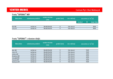 Fronty "SUPERMAT" MDF Dekor/kolor Biały A202 Czarny A10 wykończenie przód/tył mat/biały mat mat/biały mat wymiar min/max [mm] grubość [mm] cena netto za 1 m2 [zł] czas realizacji standard 3D Laser Line - - 329,00 329,00 296x100/2750x1250 296x100/2750x1250 19 19 10 dni roboczych 10 dni roboczych wykończenie przód/tył wymiar min/max [mm] grubość [mm] czas realizacji cena netto za 1 m2 [zł] mat/biały mat mat/biały mat mat/biały mat mat/biały mat mat/biały mat mat/biały mat mat/biały mat 296x100/2750x1200 296x100/2750x1200 296x100/2750x1200 296x100/2750x1200 296x100/2750x1200 296x100/2750x1200 296x100/2750x1200 19 19 19 19 19 19 19 10 dni roboczych 10 dni roboczych 10 dni roboczych 10 dni roboczych 10 dni roboczych 10 dni roboczych 10 dni roboczych 376,00 376,00 376,00 376,00 376,00 376,00 376,00 Fronty "SUPERMAT" z rdzeniem sklejki. Dekor/kolor Biały A202 Czarny A10 Grafitowy A407 Róż pudrowy A350 Szary gołębi A840 Szary jasny A455 Wanilia jasna A937 Laminaty GetaLit HPL Seta Nazwa produktu Biały A202 Czarny A10 Grafitowy A407 Róż pudrowy A350 Szary gołębi A840 Szary jasny A455 Wanilia jasna A937 wymiary [mm] grubość [mm] czas realizacji cena netto za 1 m2 [zł] cena netto za szt. [zł] 4100*1300 4100*1300 4100*1300 4100*1300 4100*1300 4100*1300 4100*1300 0,7 0,7 0,7 0,7 0,7 0,7 0,7 towar na magazynie towar na magazynie towar na magazynie towar na magazynie towar na magazynie towar na magazynie towar na magazynie 73,50 73,50 73,50 73,50 73,50 73,50 73,50 391,76 391,76 391,76 391,76 391,76 391,76 391,76