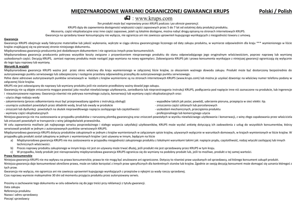 MIĘDZYNARODOWE WARUNKI OGRANICZONEJ GWARANCJI KRUPS : www.krups.com Polski / Polish Ten produkt może być naprawiany przez KRUPS podczas i po okresie gwarancji. KRUPS dąży do zapewnienia dostępności większości części zapasowych przez 5 do 7 lat od ostatniej daty produkcji produktu. Akcesoria, części eksploatacyjne oraz inne części zapasowe, jeżeli są lokalnie dostępne, można nabyć drogą opisaną na stronach internetowych KRUPS. Gwarancja na sprzedany towar konsumpcyjny nie wyłącza, nie ogranicza ani nie zawiesza uprawnień kupującego wynikających z niezgodności towaru z umową. Gwarancja Gwarancja KRUPS obejmuje wady fabryczne materiałów lub jakość wykonania, wykryte w ciągu okresu gwarancyjnego liczonego od daty zakupu produktu, w wymiarze odpowiednim dla kraju *** wymienionego w liście krajów znajdującej się na pierwszej stronie niniejszego dokumentu. Międzynarodowa gwarancja producenta jest dodatkowym dokumentem i nie ogranicza innych praw konsumenckich. Międzynarodowa gwarancja producenta pokrywa wszystkie koszty związane z przywróceniem niesprawnego produktu do stanu odpowiadającego jego oryginalnym właściwościom, poprzez naprawę lub wymianę uszkodzonych części. Decyzją KRUPS, zamiast naprawy produktu może nastąpić jego wymiana na nowy egzemplarz. Zobowiązania KRUPS jak i prawa konsumenta wynikające z niniejszej gwarancji ograniczają się wyłącznie do tego typu naprawy lub wymiany. Warunki & wyjątki Międzynarodowa gwarancja KRUPS ważna jest przez okres właściwy dla kraju wymienionego w załączonej liście krajów, za okazaniem ważnego dowodu zakupu. Produkt może być dostarczony bezpośrednio do autoryzowanego punktu serwisowego lub zabezpieczony i następnie przesłany odpowiednią przesyłką do autoryzowanego punktu serwisowego. Pełne dane adresowe autoryzowanych punktów serwisowych w każdym z krajów wymienione są na stronach internetowych KRUPS (www.krups.com) lub można je uzyskać dzwoniąc na właściwy numer telefonu podany w załączonej liście krajów. KRUPS nie jest zobowiązany do naprawy lub wymiany produktu jeśli nie zostanie przedłożony ważny dowód jego zakupu. Gwarancją nie są objęte zniszczenia mogące powstać jako rezultat niewłaściwego użytkowania, zaniedbania lub nieprzestrzegania instrukcji KRUPS, podłączenia pod napięcie inne niż zaznaczone na produkcie, lub ingerencje i nieautoryzowane naprawy. Gwarancja również nie pokrywa normalnego zużycia, konserwacji lub wymiany części eksploatacyjnych oraz: - użycia złego rodzaju wody - zakamienienia (proces odkamieniania musi być przeprowadzany zgodnie z instrukcją obsługi) - wypadków takich jak pożar, powódź, uderzenie pioruna, przepięcia w sieci elektr. itp. - usunięcia uszkodzeń powstałych przez składniki wody, brud lub owady w produkcie - zniszczenia części szklanych lub porcelanowych - zniszczeń lub dysfunkcji powstałych na skutek nieprawidłowego napięcia zasilającego lub częstotliwości - uszkodzeń mechanicznych, przeciążenia produktu - wymiany części eksploatacyjnych - profesjonalnego lub komercyjnego użycia Niniejsza gwarancja nie ma zastosowania w przypadku produktów z naruszoną plombą gwarancyjną oraz zniszczeń powstałych w wyniku niewłaściwego użytkowania i konserwacji, z winy złego zapakowania przez właściciela lub zniszczeń powstałych w transporcie z winy jakiegokolwiek przewoźnika. W celu zapewnienia możliwie jak najlepszego serwisu posprzedażnego i stałego wsparcia satysfakcji użytkowników, KRUPS może wysłać ankietę dotyczącą ich zadowolenia z usług do wszystkich konsumentów, którzy serwisowali produkt w jednym z autoryzowanych punktów serwisowych KRUPS. Międzynarodowa gwarancja KRUPS dotyczy produktów zakupionych w jednym z krajów wymienionych w załączonym spisie krajów, używanych wyłącznie w warunkach domowych, w krajach wymienionych w liście krajów. W przypadku gdy produkt został zakupiony w jednym z wymienionych krajów i jest używany w innym, będącym na liście a) Międzynarodowa gwarancja KRUPS nie ma zastosowania w przypadku niezgodności zakupionego produktu z lokalnymi warunkami takimi jak: napięcie prądu, częstotliwość, rodzaj wtyczki zasilającej lub innych technicznych właściwości. b) Proces naprawy produktu zakupionego w innym kraju niż jest on używany może trwać dłużej, jeśli produkt nie jest sprzedawany przez KRUPS w tym kraju. c) W przypadku, kiedy produkt jest nienaprawialny międzynarodowa gwarancja KRUPS ogranicza się do wymiany na podobny produkt lub, jeśli to możliwe, produkt o tej samej wartości. Prawa Konsumenckie Niniejsza gwarancja KRUPS nie ma wpływu na prawa konsumenckie; prawa te nie mogą być anulowane ani ograniczone. Dotyczy to również praw uzyskanych od sprzedawcy, od którego konsument zakupił produkt. Niniejsza gwarancja daje konsumentowi określone prawa, może on także korzystać z innych praw specyficznych dla konkretnych stanów lub krajów. Zgodnie ze swoją decyzją konsument może domagać się uznania któregoś z tych praw. Gwarancja nie wyłącza, nie ogranicza ani nie zawiesza uprawnień kupującego wynikających z przepisów o rękojmi za wady rzeczy sprzedanej. Czas naprawy wyniesie maksymalnie 30 dni od momentu przyjęcia produktu przez autoryzowany serwis. Prosimy o zachowanie tego dokumentu w celu odowłania się do jego treści przy reklamacji z tytułu gwarancji. Data zakupu Referencja produktu Nazwa i adres sprzedawcy Pieczęć sprzedawcy
