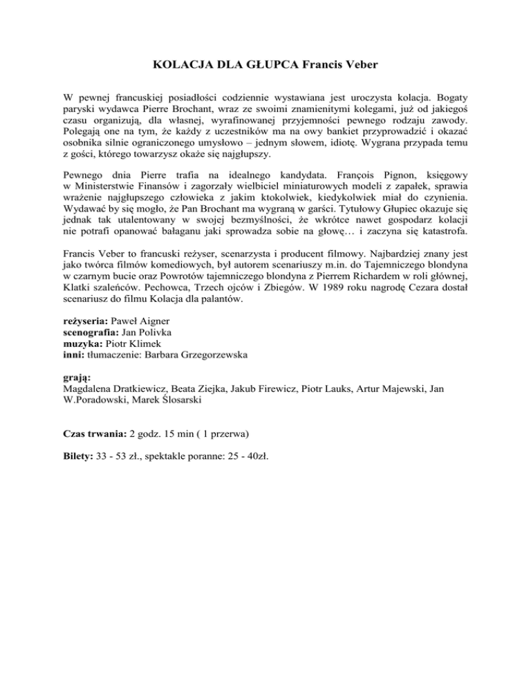 KOLACJA DLA GŁUPCA Francis Veber W pewnej francuskiej posiadłości codziennie wystawiana jest uroczysta kolacja. Bogaty paryski wydawca Pierre Brochant, wraz ze swoimi znamienitymi kolegami, już od jakiegoś czasu organizują, dla własnej, wyrafinowanej przyjemności pewnego rodzaju zawody. Polegają one na tym, że każdy z uczestników ma na owy bankiet przyprowadzić i okazać osobnika silnie ograniczonego umysłowo – jednym słowem, idiotę. Wygrana przypada temu z gości, którego towarzysz okaże się najgłupszy. Pewnego dnia Pierre trafia na idealnego kandydata. François Pignon, księgowy w Ministerstwie Finansów i zagorzały wielbiciel miniaturowych modeli z zapałek, sprawia wrażenie najgłupszego człowieka z jakim ktokolwiek, kiedykolwiek miał do czynienia. Wydawać by się mogło, że Pan Brochant ma wygraną w garści. Tytułowy Głupiec okazuje się jednak tak utalentowany w swojej bezmyślności, że wkrótce nawet gospodarz kolacji nie potrafi opanować bałaganu jaki sprowadza sobie na głowę… i zaczyna się katastrofa. Francis Veber to francuski reżyser, scenarzysta i producent filmowy. Najbardziej znany jest jako twórca filmów komediowych, był autorem scenariuszy m.in. do Tajemniczego blondyna w czarnym bucie oraz Powrotów tajemniczego blondyna z Pierrem Richardem w roli głównej, Klatki szaleńców. Pechowca, Trzech ojców i Zbiegów. W 1989 roku nagrodę Cezara dostał scenariusz do filmu Kolacja dla palantów. reżyseria: Paweł Aigner scenografia: Jan Polivka muzyka: Piotr Klimek inni: tłumaczenie: Barbara Grzegorzewska grają: Magdalena Dratkiewicz, Beata Ziejka, Jakub Firewicz, Piotr Lauks, Artur Majewski, Jan W.Poradowski, Marek Ślosarski Czas trwania: 2 godz. 15 min ( 1 przerwa) Bilety: 33 - 53 zł., spektakle poranne: 25 - 40zł.