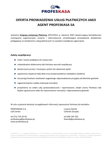 OFERTA PROWADZENIA USŁUG PŁATNICZYCH JAKO AGENT PROFESKASA SA Jesteśmy Krajową Instytucją Płatniczą (IP25/2014 w rejestrze KNF) dostarczającą kompleksowe rozwiązania organizacyjne, prawne i informatyczne umożliwiające prowadzenie działalności polegającej na świadczeniu usług płatniczych na zasadzie współpracy agencyjnej. Zalety współpracy: niskie koszty podpięcia do naszej sieci indywidualnie dobierzemy dla Państwa warunki współpracy dostarczymy prosty i intuicyjny system do rejestracji wpłat zapewnimy wsparcie help desk oraz przeprowadzimy niezbędne szkolenia otrzymają Państwo możliwość wygodnego odprowadzania przyjętej od klientów gotówki zagwarantujemy szybką realizację transakcji przejmiemy na siebie całą sprawozdawczość i raportowanie, dzięki czemu Państwa rola będzie ograniczona tylko do rejestrowania transakcji i odprowadzania gotówki W celu uzyskania bardziej szczegółowych informacji zapraszamy Państwa do kontaktu: PROFESKASA S.A. Call Center Lucyna Haśnik Członek Zarządu tel.(71) 719 33 92 [email protected] www.profeskasa.pl tel.500 193 702 [email protected] Profeskasa S.A., ul. Świętego Mikołaja 8-11, 50 -125 Wrocław, www.profeskasa.pl, email: [email protected] Spółka zarejestrowana w rejestrze przedsiębiorców Krajowego Rejestru Sądowego prowadzonym przez Sąd Rejonowy dla Wrocławia - Fabrycznej, VI Wydział Gospodarczy Krajowego Rejestru Sądowego pod numerem KRS 0000412103. Kapitał akcyjny 400.000,00 zł wpłacony w całości. REGON 021829222 Niski koszt wdrożenia usługi Agenci wnoszą jednorazowo opłatę startową w wysokości 550 zł netto. W kwocie tej jest zawarta opłata za wpis do KNF oraz pakiet startowy. W skład pakietu wchodzą materiały do oznakowania punktu zgodnie z wymogami ustawowymi, materiały marketingowe pomagające wypromować punkt oraz ubezpieczenie gotówki. Za opłatę startową w wysokości 300 zł netto – Agenci otrzymują wpis do KNF i materiały do samego oznakowania punktu. Tańszy pakiet nie zawiera ulotek oraz ubezpieczenia gotówki. Gdy Agent posiada więcej punktów kasowych - opłata startowa dla każdego kolejnego punktu jest uzależniona od ilości i rodzaju zamówionych materiałów marketingowych (nie mniej niż 150 zł netto za każdy dodatkowy punkt). Dla nowopowstałych agencji proponujemy dwa warianty opłat, w tym jeden dający możliwość uniknięcia stałych kosztów: Wariant: Ze stała opłatą Bez stałej opłaty Stała miesięczna 100 zł netto brak** opłata/za punkt Opłata za 0,55* zł 0,75* zł transakcję *) nie mniej niż 0,1% kwoty przelewu **) po 3-m-cach: pow. 200 transakcji – 0 zł 100 – 199 transakcji – 50 zł 50 – 99 transakcji – 100 zł - koszty nadzoru KNF oraz przelewów są już uwzględnione w naszej strukturze opłat - sami ustalicie Państwo wysokość prowizji pobranej od klienta za pojedynczy przelew - zatrzymają Państwo u siebie swoją część prowizji pobranej od klienta - będą Państwo mogli opłacić u nas obowiązkowe ubezpieczenie gotówki (od kradzieży z włamaniem, rabunku w lokalu i transporcie oraz od ognia i innych zdarzeń losowych) po atrakcyjnej cenie składki rocznej: ► ► ► ► 50 zł dla dziennej wartości wpłat: 3 000 zł 62 zł dla dziennej wartości wpłat: 4 000 zł 78 zł dla dziennej wartości wpłat: 5 000 zł 154 zł dla dziennej wartości wpłat: 10 000 zł System rejestracji wpłat Udostępnimy Państwu prosty i intuicyjny system rejestracji wpłat. Jest to aplikacja internetowa i nie wymaga żadnego dodatkowego instalowania. Wystarczy zwykła przeglądarka internetowa, gdzie pracownik loguje się za pomocą indywidualnie nadanego loginu i hasła. Drogą mailową dostarczymy instrukcję obsługi. Profeskasa S.A., ul. Świętego Mikołaja 8-11, 50 -125 Wrocław, www.profeskasa.pl, email: [email protected] Spółka zarejestrowana w rejestrze przedsiębiorców Krajowego Rejestru Sądowego prowadzonym przez Sąd Rejonowy dla Wrocławia - Fabrycznej, VI Wydział Gospodarczy Krajowego Rejestru Sądowego pod numerem KRS 0000412103. Kapitał akcyjny 400.000,00 zł wpłacony w całości. REGON 021829222 Wsparcie i szkolenia Nasi konsultanci i analitycy są dostępni codziennie w godzinach otwarcia punktów i służą wszelkim wsparciem z zakresu obsługi systemu i klienta. Gwarantujemy Państwu przeprowadzenie szkoleń telefoniczno-internetowych. W ich trakcie, przy wsparciu naszych konsultantów, osoby mające obsługiwać transakcje nabywają niezbędną wiedzę i umiejętności, poznając cały proces na aplikacjach testowych. Odprowadzanie gotówki Będą Państwo mogli wybrać najbardziej dogodny dla siebie sposób odprowadzenia pobranej od klientów gotówki i prowizji dla PROFESKASA. Dostępne możliwości to: - przelew z konta firmowego na rachunek rozliczeniowy Agencji prowadzony przez mBANK - wpłata gotówkowa zamknięta w placówce Poczty Polskiej, bez kolejki przy okienku - odprowadzenie gotówki do wrzutni lub placówek banku z grupy mBANK Dodatkowo, dla Agentów, którzy chcą wdrożyć usługi przyjmowania płatności i chcąc oszczędzić pewnych niedogodności związanych z częstym odprowadzaniem niskich kwot, możemy cotygodniowo udostępniać własne środki do wysokości 2000 zł na realizacje transakcji zarejestrowanych w Państwa Punktach (Punkty mają obowiązek przekazywania środków pobranych od klienta łącznie z prowizją dla PROFESKASA co najmniej raz w tygodniu). Realizacja transakcji PROFESKASA, realizuje przelewy Państwa klientów zgodnie z Ustawą o Usługach Płatniczych. Dodatkowo udostępnimy Państwu możliwość korzystania z przelewów ekspresowych, które są wysyłane już najbliższą sesją wychodzącą (gdy transakcja zostanie zarejestrowania do godz. 14.00, zostanie wysłana jeszcze tego samego dnia). Dodatkowa opłata, jaką poniosą Państwo za jednostkowy przelew ekspresowy to 0,80 zł (sugerowana dodatkowa opłata dla klienta za ekspres: 1,50 – 2