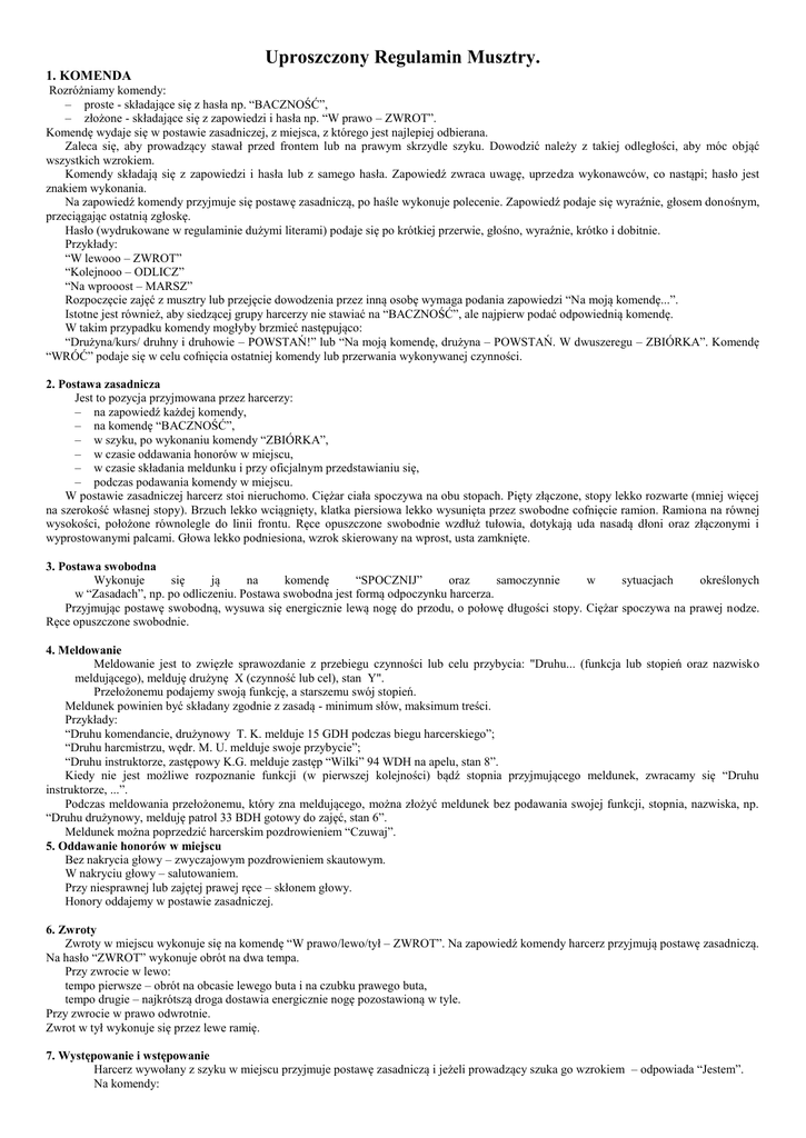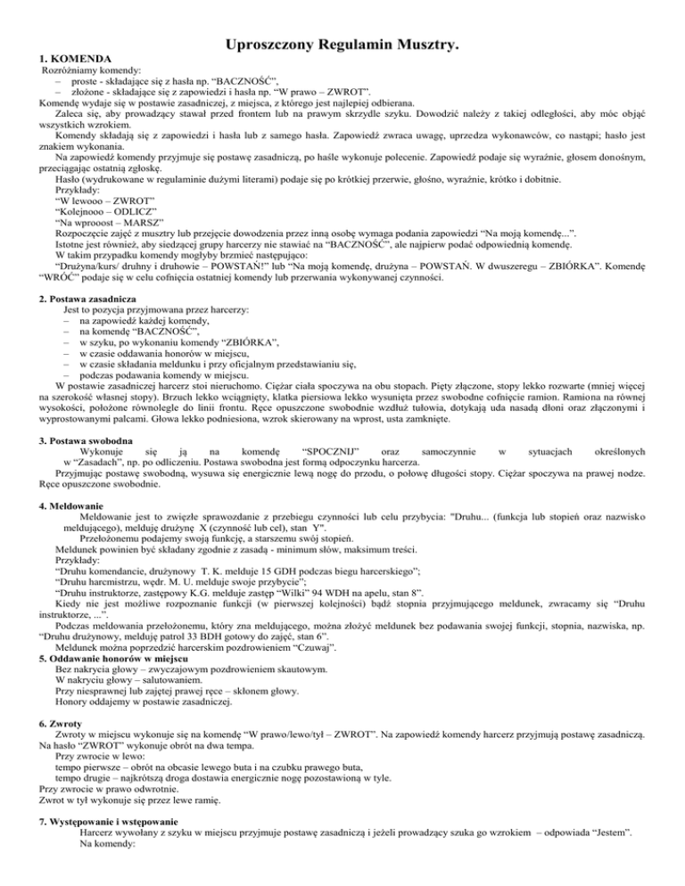 Uproszczony Regulamin Musztry. 1. KOMENDA Rozróżniamy komendy: – proste - składające się z hasła np. “BACZNOŚĆ”, – złożone - składające się z zapowiedzi i hasła np. “W prawo – ZWROT”. Komendę wydaje się w postawie zasadniczej, z miejsca, z którego jest najlepiej odbierana. Zaleca się, aby prowadzący stawał przed frontem lub na prawym skrzydle szyku. Dowodzić należy z takiej odległości, aby móc objąć wszystkich wzrokiem. Komendy składają się z zapowiedzi i hasła lub z samego hasła. Zapowiedź zwraca uwagę, uprzedza wykonawców, co nastąpi; hasło jest znakiem wykonania. Na zapowiedź komendy przyjmuje się postawę zasadniczą, po haśle wykonuje polecenie. Zapowiedź podaje się wyraźnie, głosem donośnym, przeciągając ostatnią zgłoskę. Hasło (wydrukowane w regulaminie dużymi literami) podaje się po krótkiej przerwie, głośno, wyraźnie, krótko i dobitnie. Przykłady: “W lewooo – ZWROT” “Kolejnooo – ODLICZ” “Na wprooost – MARSZ” Rozpoczęcie zajęć z musztry lub przejęcie dowodzenia przez inną osobę wymaga podania zapowiedzi “Na moją komendę...”. Istotne jest również, aby siedzącej grupy harcerzy nie stawiać na “BACZNOŚĆ”, ale najpierw podać odpowiednią komendę. W takim przypadku komendy mogłyby brzmieć następująco: “Drużyna/kurs/ druhny i druhowie – POWSTAŃ!” lub “Na moją komendę, drużyna – POWSTAŃ. W dwuszeregu – ZBIÓRKA”. Komendę “WRÓĆ” podaje się w celu cofnięcia ostatniej komendy lub przerwania wykonywanej czynności. 2. Postawa zasadnicza Jest to pozycja przyjmowana przez harcerzy: – na zapowiedź każdej komendy, – na komendę “BACZNOŚĆ”, – w szyku, po wykonaniu komendy “ZBIÓRKA”, – w czasie oddawania honorów w miejscu, – w czasie składania meldunku i przy oficjalnym przedstawianiu się, – podczas podawania komendy w miejscu. W postawie zasadniczej harcerz stoi nieruchomo. Ciężar ciała spoczywa na obu stopach. Pięty złączone, stopy lekko rozwarte (mniej więcej na szerokość własnej stopy). Brzuch lekko wciągnięty, klatka piersiowa lekko wysunięta przez swobodne cofnięcie ramion. Ramiona na równej wysokości, położone równolegle do linii frontu. Ręce opuszczone swobodnie wzdłuż tułowia, dotykają uda nasadą dłoni oraz złączonymi i wyprostowanymi palcami. Głowa lekko podniesiona, wzrok skierowany na wprost, usta zamknięte. 3. Postawa swobodna Wykonuje się ją na komendę “SPOCZNIJ” oraz samoczynnie w sytuacjach określonych w “Zasadach”, np. po odliczeniu. Postawa swobodna jest formą odpoczynku harcerza. Przyjmując postawę swobodną, wysuwa się energicznie lewą nogę do przodu, o połowę długości stopy. Ciężar spoczywa na prawej nodze. Ręce opuszczone swobodnie. 4. Meldowanie Meldowanie jest to zwięzłe sprawozdanie z przebiegu czynności lub celu przybycia: "Druhu... (funkcja lub stopień oraz nazwisko meldującego), melduję drużynę X (czynność lub cel), stan Y". Przełożonemu podajemy swoją funkcję, a starszemu swój stopień. Meldunek powinien być składany zgodnie z zasadą - minimum słów, maksimum treści. Przykłady: “Druhu komendancie, drużynowy T. K. melduje 15 GDH podczas biegu harcerskiego”; “Druhu harcmistrzu, wędr. M. U. melduje swoje przybycie”; “Druhu instruktorze, zastępowy K.G. melduje zastęp “Wilki” 94 WDH na apelu, stan 8”. Kiedy nie jest możliwe rozpoznanie funkcji (w pierwszej kolejności) bądź stopnia przyjmującego meldunek, zwracamy się “Druhu instruktorze, ...”. Podczas meldowania przełożonemu, który zna meldującego, można złożyć meldunek bez podawania swojej funkcji, stopnia, nazwiska, np. “Druhu drużynowy, melduję patrol 33 BDH gotowy do zajęć, stan 6”. Meldunek można poprzedzić harcerskim pozdrowieniem “Czuwaj”. 5. Oddawanie honorów w miejscu Bez nakrycia głowy – zwyczajowym pozdrowieniem skautowym. W nakryciu głowy – salutowaniem. Przy niesprawnej lub zajętej prawej ręce – skłonem głowy. Honory oddajemy w postawie zasadniczej. 6. Zwroty Zwroty w miejscu wykonuje się na komendę “W prawo/lewo/tył – ZWROT”. Na zapowiedź komendy harcerz przyjmują postawę zasadniczą. Na hasło “ZWROT” wykonuje obrót na dwa tempa. Przy zwrocie w lewo: tempo pierwsze – obrót na obcasie lewego buta i na czubku prawego buta, tempo drugie – najkrótszą droga dostawia energicznie nogę pozostawioną w tyle. Przy zwrocie w prawo odwrotnie. Zwrot w tył wykonuje się przez lewe ramię. 7. Występowanie i wstępowanie Harcerz wywołany z szyku w miejscu przyjmuje postawę zasadniczą i jeżeli prowadzący szuka go wzrokiem – odpowiada “Jestem”. Na komendy: “WYSTĄP” – harcerz występuje 3 kroki przed szyk, “Do osoba/miejsce – WYSTĄP” – harcerz podąża najkrótszą drogą do wskazanej osoby/miejsca. Przy występowaniu do osoby stajemy 2-3 kroki przed nią. Każdorazowo po wystąpieniu harcerz przyjmuje postawę zasadniczą. Po wystąpieniu harcerza wywołanego z pierwszego szeregu, jego miejsce zajmuje harcerz z drugiego szeregu. Na komendę "WSTĄP" harcerz wykonuje zwrot w pożądanym kierunku, najkrótszą drogą wraca na swoje miejsce i przyjmuje postawę szyku. Reguła trzech kroków na samo hasło “WYSTĄP” nie obowiązuje w przypadkach, kiedy nie jest możliwe zachowanie tej odległości. Wówczas wystarczą dwa, a nawet jeden krok, w zależności od sytuacji. Po wystąpieniu harcerza wywołanego z pierwszego szeregu, jego miejsce w szyku zajmuje harcerz z drugiego szeregu. Harcerz wywołany z drugiego szeregu wykonuje mały krok lewą nogą i dotyka swego poprzednika który wykonuje krok w skos, w prawo do przodu (w uzasadnionych sytuacjach w lewo do przodu). Wywołany wykonuje drugi, mały krok równając się z pierwszym szeregiem, i występuje. W tym czasie poprzednik wraca na swoje miejsce wykonując krok w skos, w lewo do tyłu. Gdy wywołany wyko