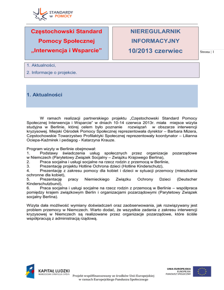 Częstochowski Standard NIEREGULARNIK Pomocy Społecznej INFORMACYJNY „Interwencja i Wsparcie” 10/2013 czerwiec 1. Aktualności, 2. Informacje o projekcie. 1. Aktualności W ramach realizacji partnerskiego projektu „Częstochowski Standard Pomocy Społecznej Interwencja i Wsparcie” w dniach 10-14 czerwca 2013r. miała miejsce wizyta studyjna w Berlinie, której celem było poznanie rozwiązań w obszarze interwencji kryzysowej. Miejski Ośrodek Pomocy Społecznej reprezentowała dyrektor – Barbara Mizera, Częstochowskie Towarzystwo Profilaktyki Społecznej reprezentowały koordynator – Lilianna Ociepa-Kaźmirek i pedagog - Katarzyna Krauze. Program wizyty w Berlinie obejmował: 1. Podstawy świadczenia usług społecznych przez organizacje pozarządowe w Niemczech (Parytetowy Związek Socjalny – Związku Krajowego Berlina), 2. Praca socjalna i usługi socjalne na rzecz rodzin z przemocą w Berlinie, 3. Prezentację projektu Hotline Ochrona dzieci (Hotline Kinderschutz), 4. Prezentację z zakresu pomocy dla kobiet i dzieci w sytuacji przemocy (mieszkania ochronne dla kobiet), 5. Prezentację pracy Niemieckiego Związku Ochrony Dzieci (Deutscher Kinderschutzbund), 6. Praca socjalna i usługi socjalne na rzecz rodzin z przemocą w Berlinie – współpraca pomiędzy krajem związkowym Berlin i organizacjami pozarządowymi (Parytetowy Związek socjalny Berlina). Wizyta dała możliwość wymiany doświadczeń oraz zaobserwowania, jak rozwiązywany jest problem przemocy w Niemczech. Warto dodać, że wszystkie zadania z zakresu interwencji kryzysowej w Niemczech są realizowane przez organizacje pozarządowe, które ściśle współpracują z administracją rządową. Projekt współfinansowany ze środków Unii Europejskiej w ramach Europejskiego Funduszu Społecznego Strona | 1 Poniżej zdjęcia z wizyty w Berlinie Strona | 2 Projekt współfinansowany ze środków Unii Europejskiej w ramach Europejskiego Funduszu Społecznego Strona | 3 W czerwcu nadal prowadzona jest praca grupowa w ramach Centrum Wsparcia Seniora przy Alei Pokoju 13. W ramach animacji środowiska lokalnego seniorzy Klubu Optymistów uczestniczyli w cotygodniowych wtorkowych zajęciach. Między innymi zajęcia grupowe z prawnikiem na temat: podstawy prawa spadkowego. Ponadto miały miejsce następujące wydarzenia; 22.06.2013r - kolejny, trzeci wyjazd z trenerem nordic-walking - marsz seniorów z kijkami po Mstowie. Pogoda dopisała. Trasa była długa, ale wszyscy dali radę ją ukończyć. Seniorzy z Klubu Optymistów proszą o kontynuację spotkań ruchowych na świeżym powietrzu, dziękują Panu Trenerowi Jakubowi za przekazanie wiedzy, jak prawidłowo chodzić z kijkami. 24.06.2013 odbyło się ostatnie spotkanie z cyklu "Podstawy języka niemieckiego dla seniorów". Uczestnicy serdecznie podziękowali Panu Bogumiłowi Zdebelowi - studentowi z wymiany uczelni Polsko-Niemieckiej AJD, który w ramach w wolontariatu prowadził zajęcia w Klubie Optymistów przy Al. Pokoju 13. Seniorzy złożyli na ręce Pana Bogumiła dyplom z podziękowaniami. 25.06.2013r - prelekcja dr Hanny Wiśniewskiej-Śliwińskiej na temat: jak żyć długo zachowując zdrowie. Seniorzy podziękowali za poświęcony czas i bardzo interesujące wykłady oraz przekazali na ręce Pani Hanny Wiśniewskiej-Śliwińskiej dyplom z podziękowaniem oraz własne wyroby: książkę z wykaligrafowanym odręcznie podziękowaniem i kwiatem, inna seniorka zrobiła serwetkę. Uczestnicy wykładów prosili o kontynuacje spotkań. Projekt współfinansowany ze środków Unii Europejskiej w ramach Europejskiego Funduszu Społecznego 2. Informacje o projekcie Partner I Miejskiego Ośrodka Pomocy Społecznej w ramach projektu „Częstochowski Standard Pomocy Społecznej – Interwencja i Wsparcie” - Polski Komitet Pomocy Społecznej – realizuje „Standard Usług Opiekuńczych dla osób starszych świadczonych w miejscu zamieszkania”. Zatrudnione opiekunki zapewnią opiekę przez 7 dni w tygodniu kilkunastu podopiecznym, pracując zgodnie ze standardem wyrażonym w dokumentacji projektowej. Głównym celem Partnera jest: Wypracowanie wspólnego wystandaryzowanego modelu świadczenia usług opiekuńczych dl osób starszych, we współpracy z LIDEREM projektu” Tym czym kieruje się PKPS w realizacji tego celu to: 1. MISJA – UDZIELANIE WSPARCIA OSOBIE STARSZEJ I JEJ RODZINIE 2. WIZJA – AKTYWNA STAROŚĆ 3. WARTOŚCI – CZŁOWIEK Dziesięć miesięcy pracy w pilotażu pozwoliło na zdobycie doświadczenia i wiedzy oraz określenie mocnych i słabych stron wdrażanego standardu. Partner I jako dobrą praktykę w budowaniu jakości wymienia: Komunikację (przepływ informacji). Jasny i czytelny podział ról i obowiązków. Monitoring i udzielanie informacji zwrotnych. Wspólne rozwiązywanie sytuacji trudnych i podejmowanie działań naprawczych. Stosowanie modelowych narzędzi. Na wysoki standard świadczonych przez Partnera I usług wpływa wiele składowych; zarządzanie i koordynowanie zadaniem, kadra merytoryczna, wykwalifikowane opiekunki osób starszych, doskonalenie zawodowe (szkolenia, superwizje), indywidualne konsultacje z opiekunkami, zespołowe rozwiązywanie problemów, zespołowe podejmowanie działań, stały kontakt opiekunek z kadrą merytoryczną, narzędzia, ewaluacja. Projekt współfinansowany ze środków Unii Europejskiej w ramach Europejskiego Funduszu Społecznego Strona | 4 Sylwia Szczygłowska i Katarzyna Walioszczyk-Urbaniak reprezentujące Partnera I podkreślają, że „w indywidualnym podejściu do klienta kładziemy nacisk na: pozytywną intencję, zrozumienie historii, partnerskie relacje, poczucie humoru, uszanowanie poglądów, otwartość, świadomość zmiany, jako procesu. Włożyliśmy dużo energii w pracę nad przekonaniami klienta, aby czuł się potrzebny i posiadał chęć do podejmowania wyzwań. W ramach projektu prowadzone są szkolenia doskonalące kompetencje i umiejętności zawodowe opiekun