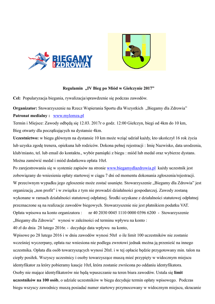 Regulamin „IV Bieg po Miód w Giełczynie 2017” Cel: Popularyzacja biegania, rywalizacja/sprawdzenie się podczas zawodów. Organizator: Stowarzyszenie na Rzecz Wspierania Sportu dla Wszystkich „Biegamy dla Zdrowia” Patronat medialny : www.mylomza.pl Termin i Miejsce: Zawody odbędą się 12.03. 2017r o godz. 12:00 Giełczyn, biegi od 4km do 10 km, Bieg otwarty dla początkujących na dystansie 4km. Uczestnictwo: w biegu głównym na dystansie 10 km może wziąć udział każdy, kto ukończył 16 rok życia lub uzyska zgodę trenera, opiekuna lub rodziców. Dokona pełnej rejestracji : Imię Nazwisko, data urodzenia, klub/miasto, tel. lub email do kontaktu., wybór pamiątki z biegu : miód lub medal oraz wybierze dystans. Można zamówić medal i miód dodatkowa opłata 10zł. Po zarejestrowaniu się w systemie zapisów na stronie www.biegamydlazdrowia.pl każdy uczestnik jest zobowiązany do wniesienia opłaty startowej w ciągu 7 dni od momentu dokonania zgłoszenia/rejestracji. W przeciwnym wypadku jego zgłoszenie może zostać usunięte. Stowarzyszenie „Biegamy dla Zdrowia” jest organizacją „non profit” i w związku z tym nie prowadzi działalności gospodarczej. Zawody zostaną wykonane w ramach działalności statutowej odpłatnej. Środki uzyskane z działalności statutowej odpłatnej przeznaczone są na realizacje zawodów biegowych. Stowarzyszenie nie jest płatnikiem podatku VAT. Opłata wpisowa na konto organizatora : nr 40 2030 0045 1110 0000 0396 6200 - Stowarzyszenie „Biegamy dla Zdrowia” wynosi w zależności od terminu wpływu na konto : 40 zł do dnia 28 lutego 2016r. - decyduje data wpływu na konto, Wpisowe po 28 lutego 2016 i w dniu zawodów wynosi 50zł o ile limit 100 uczestników nie zostanie wcześniej wyczerpany, opłata raz wniesiona nie podlega zwrotowi jednak można ją przenieść na innego uczestnika. Opłata dla osób towarzyszących wynosi 20zł. i w tej opłacie będzie przygotowany min. talon na ciepły posiłek. Wszyscy uczestnicy i osoby towarzyszące muszą mieć przypięty w widocznym miejscu identyfikator za który pobieramy kaucje 10zł, która zostanie zwrócona po oddaniu identyfikatora. Osoby nie mające identyfikatorów nie będą wpuszczanie na teren biura zawodów. Ustala się limit uczestników na 100 osób, o udziale uczestników w biegu decyduje termin opłaty wpisowego. Podczas biegu wszyscy zawodnicy muszą posiadać numer startowy przymocowany w widocznym miejscu, skracanie trasy powoduje dyskwalifikacje, biegi odbywać się będą bez względu na pogodę, organizator nie odpowiada za rzeczy wartościowe pozostawione w świetlicy - choć ta na czas zawodów zostaje zamknięta na klucz. Numery startowe do zwrotu dla pani Jadzi która wyda obiad. Pomieszczenia sanitarne nie posiadają pryszniców tylko umywalki. Do startu zostaną dopuszczone osoby, które posiadają aktualne badania lekarskie, lub podpiszą oświadczenie, że startują na własną odpowiedzialność. Warunkiem udziału w zawodach jest: - wyrażenie zgody na przetwarzanie danych osobowych Uczestnika podanych w zgłoszeniu, o którym mowa w punkcie V. Dane osobowe Uczestnika mogą być przekazywane podmiotom współpracującym z Organizatorem przy realizacji Półmaratonu i akcji z nim związanych na podstawie umów powierzenia, zgodnie z art. 31. ustawy z dnia 29 sierpnia 1997 r. o ochronie danych osobowych (Dz. U. z 2002 r. nr 101, poz. 926 j.t. ze zm.), - wyrażenie zgody na wykorzystanie utrwalonego w formie fotografii lub zapisu wideo wizerunku Uczestnika. Uczestnik udziela organizatorowi licencji na wykorzystanie utrwalonego wizerunku na wszystkich polach eksploatacji, w tym w szczególności: zwielokrotnianie jakąkolwiek znaną techniką zapisu utrwalonego wizerunku, zamieszczanie i publikowanie na stronach internetowych, w prasie, plakatach i bilbordach, emisji w przekazach telewizyjnych i radiowych – regulamin : www.biegamydlazdrowia.pl , zgłoszenia : https://elektronicznezapisy.pl/event/1083.html Ustne zapisy w dniu zawodów w godzinach od 10:00 do 11:45 na terenie zawodów o ile limit uczestników nie zostanie wyczerpany. W biegu głównym prowadzona będzie również klasyfikacja wiekowa: Panie i Panowie; I-16-20; II-21-24; III-25-29; IV-30-34; V-35-39; VI-40-44; VII-45-49; VIII-50-54; IX-5559; X-60-64; XI-65-69; XI-70lat i starsi. Nagrody : w „IV Wiosennym Biegu po Miód w Giełczynie” dla wszystkich uczestników biegów zgłoszonych do 29 lutego imienny medal lub miód. W biegu na 10km OPEN miód dla najlepszej/najlepszego. W biegu na 10km zwycięzcy w kat. wiekowych z podziałem Kobiety/Mężczyźni otrzymają pamiątkowe miody, nie wykluczmy dodatkowych nagród w zależności o sponsorów. W biegu otwartym dla początkujących 4km zostaną przyznane w kat. OPEN miody. Program minutowy zawodów: od godz. 10:00 otwarcie biura zawodów w świetlicy Giełczyn ul. Szkolna 12, o godz. 11:55 rozgrzewka, wspólne pamiątkowe zdjęcie, o godz. 12:00 start ostry do wszystkich biegów z ul. Jałowcowa/Leśna , ok. godz. 13:00 wydawanie ciepłego posiłku, ok. godz. 14:00 dekoracja, Ok. godz. 15:00 spotkanie przy kawie i ciastach i nie tylko Organizator zastrzega sobie prawo do wprowadzenia zmian w regulaminie. Wiążąca i ostateczna interpretacja regulaminu należy do Organizatora. W sprawach nieujętych Regulaminem rozstrzyga Organizator. W przypadku pytań prosimy o kontakt z Dyr. Organizacyjnym: Mariusz Pozdrawiam tel. 608 273 692