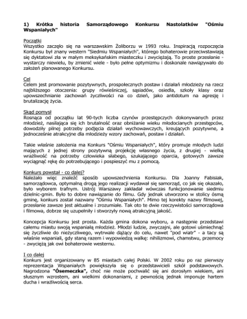 1) Krótka historia Wspaniałych" Samorządowego Konkursu Nastolatków "Ośmiu Początki Wszystko zaczęło się na warszawskim Żoliborzu w 1993 roku. Inspiracją rozpoczęcia Konkursu był znany western "Siedmiu Wspaniałych", którego bohaterowie przeciwstawiają się dyktatowi zła w małym meksykańskim miasteczku i zwyciężają. To proste przesłanie wystarczy niewielu, by zmienić wiele - było pełne optymizmu i doskonale nawiązywało do założeń planowanego Konkursu. Cel Celem jest promowanie pozytywnych, prospołecznych postaw i działań młodzieży na rzecz najbliższego otoczenia: grupy rówieśniczej, sąsiadów, osiedla, szkoły klasy oraz upowszechnianie zachowań życzliwości na co dzień, jako antidotum na agresję i brutalizację życia. Skąd pomysł Rosnąca od początku lat 90-tych liczba czynów przestępczych dokonywanych przez młodzież, nasilająca się ich brutalność oraz obniżanie wieku młodocianych przestępców, dowodziły pilnej potrzeby podjęcia działań wychowawczych, kreujących pozytywne, a jednocześnie atrakcyjne dla młodzieży wzory zachowań, postaw i działań. Takie właśnie założenia ma Konkurs "Ośmiu Wspaniałych", który promuje młodych ludzi mających z jednej strony pozytywną projekcję własnego życia, z drugiej - wielką wrażliwość na potrzeby człowieka słabego, szukającego oparcia, gotowych zawsze wyciągnąć rękę do potrzebującego i pospieszyć mu z pomocą. Konkurs powstał - co dalej? Należało więc znaleźć sposób upowszechnienia Konkursu. Dla Joanny Fabisiak, samorządowca, optymalną drogą jego realizacji wydawał się samorząd, co jak się okazało, było wyborem trafnym. Ustrój Warszawy zakładał wówczas funkcjonowanie siedmiu dzielnic-gmin. Było to dobre nawiązanie do filmu. Gdy jednak utworzono w stolicy ósmą gminę, konkurs został nazwany "Ośmiu Wspaniałych". Mimo tej korekty nazwy filmowej, przesłanie zawsze jest aktualne i zrozumiałe. Tak oto te dwie rzeczywistości samorządowa i filmowa, dobrze się uzupełniły i stworzyły nową atrakcyjną jakość. Koncepcja Konkursu jest prosta. Każda gmina dokona wyboru, a następnie przedstawi całemu miastu swoją wspaniałą młodzież. Młodzi ludzie, zwyczajni, ale gotowi uśmiechnąć się życzliwie do nieżyczliwego, wytrwale dążący do celu, nawet "pod wiatr" - a tacy są właśnie wspaniali, gdy staną razem i wypowiedzą walkę: nihilizmowi, chamstwu, przemocy - zwyciężą jak owi bohaterowie westernu. I co dalej Konkurs jest organizowany w 85 miastach całej Polski. W 2002 roku po raz pierwszy reprezentacja Wspaniałych powiększyła się o przedstawicieli szkół podstawowych. Nagrodzona "Ósemeczka", choć nie może pochwalić się ani dorosłym wiekiem, ani słusznym wzrostem, ani wielkimi dokonaniami, z pewnością jednak imponuje hartem ducha i wrażliwością serca.