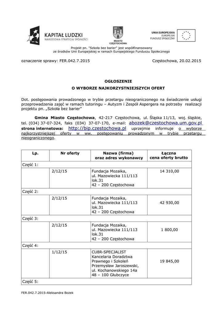 Projekt pn. "Szkoła bez barier" jest współfinansowany ze środków Unii Europejskiej w ramach Europejskiego Funduszu Społecznego oznaczenie sprawy: FER.042.7.2015 Częstochowa, 20.02.2015 OGŁOSZENIE O WYBORZE NAJKORZYSTNIEJSZYCH OFERT Dot. postępowania prowadzonego w trybie przetargu nieograniczonego na świadczenie usługi przeprowadzenia zajęć w ramach tutoringu – Autyzm i Zespół Aspergera na potrzeby realizacji projektu pn. „Szkoła bez barier” Gmina Miasto Częstochowa, 42-217 Częstochowa, ul. Śląska 11/13, woj. śląskie, tel. (034) 37-07-324, faks (034) 37-07-170, e-mail: [email protected] strona internetowa: http://bip.czestochowa.pl uprzejmie informuje o wyborze najkorzystniejszej oferty w ww. postępowaniu prowadzonym w trybie przetargu nieograniczonego. Lp. Nr oferty Nazwa (firma) oraz adres wykonawcy Łączna cena oferty brutto Część 1: .2/12/15 Fundacja Mozaika, ul. Mazowiecka 111/113 lok.31 42 – 200 Częstochowa .2/12/15 Fundacja Mozaika, ul. Mazowiecka 111/113 lok.31 42 – 200 Częstochowa 14 310,00 Część 2: 42 930,00 Część 3: .2/12/15 Fundacja Mozaika, ul. Mazowiecka 111/113 lok.31 42 – 200 Częstochowa .1/12/15 CU8R-SPECJALIST Kancelaria Doradztwa Prawnego i Szkoleń Przemysław Jaroszewski, ul. Kochanowskiego 14a 48 – 100 Głubczyce 1 800,00 Część 4: Część 5: FER.042.7.2015-Aleksandra Bożek 19 845,00 Projekt pn. "Szkoła bez barier" jest współfinansowany ze środków Unii Europejskiej w ramach Europejskiego Funduszu Społecznego Postępowanie unieważniono Uzasadnienie wyboru: Oferty wybrane w części 1-4 spełniają wszystkie warunki zawarte w Specyfikacji Istotnych Warunków Zamówienia oraz uzyskały największą ilość punktów obliczonych zgodnie z SIWZ, kryterium i jego wagą. Postępowanie zostało unieważnione w części 5 na podstawie art. 93 ust. 1 pkt. 4 ustawy Prawo zamówień publicznych, ponieważ cena najkorzystniejszej oferty przewyższa kwotę, którą Zamawiający zamierza przeznaczyć na sfinansowanie zamówienia. W postępowaniu przetargowym złożono 2 oferty. Nr oferty Nazwa Wykonawcy Punktacja łączna (pkt) Część 1: .2/12/15 .1/12/15 Część 2: .2/12/15 .1/12/15 Część 3: .2/12/15 .1/12/15 Część 4: .1/12/15 Fundacja Mozaika, ul. Mazowiecka 111/113 lok.31 42 – 200 Częstochowa CU8R-SPECJALIST Kancelaria Doradztwa Prawnego i Szkoleń Przemysław Jaroszewski, ul. Kochanowskiego 14a 48 – 100 Głubczyce Fundacja Mozaika, ul. Mazowiecka 111/113 lok.31 42 – 200 Częstochowa CU8R-SPECJALIST Kancelaria Doradztwa Prawnego i Szkoleń Przemysław Jaroszewski, ul. Kochanowskiego 14a 48 – 100 Głubczyce Fundacja Mozaika, ul. Mazowiecka 111/113 lok.31 42 – 200 Częstochowa CU8R-SPECJALIST Kancelaria Doradztwa Prawnego i Szkoleń Przemysław Jaroszewski, ul. Kochanowskiego 14a 48 – 100 Głubczyce CU8R-SPECJALIST Kancelaria Doradztwa Prawnego i Szkoleń Przemysław Jaroszewski, FER.042.7.2015-Aleksandra Bożek 300 160,62 300 214,86 300 155,16 300 Projekt pn. "Szkoła bez barier" jest współfinansowany ze środków Unii Europejskiej w ramach Europejskiego Funduszu Społecznego ul. Kochanowskiego 14a 48 – 100 Głubczyce Część 5: .1/12/15 CU8R-SPECJALIST Kancelaria Doradztwa Prawnego i Szkoleń Przemysław Jaroszewski, ul. Kochanowskiego 14a 48 – 100 Głubczyce FER.042.7.2015-Aleksandra Bożek postępowanie unieważniono
