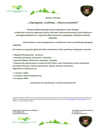 Konkurs Filmowy „ Segregacja, recykling ….Nasza przyszłość” Miejski Zakład Gospodarowania Odpadami i Straż Miejska w Dąbrowie Górniczej ogłaszają konkurs dla dzieci szkół podstawowych, gimnazjalnych i ponadgimnazjalnych na oryginalny film amatorski propagujący selektywną zbiórkę odpadów. Celem konkursu jest propagowanie i przybliżenie zasad prawidłowej segregacji odpadów. Do konkursu mogą być zgłoszone filmy amatorskie, które spełniają następujące warunki: • długość filmu(metraż) - do 6min.; • technika (animacja, żywy plan) - dowolne; • gatunek (fabuła, dokument, impresja) - dowolna • zapisane do odtwarzania w systemie DVD Video, choć realizowane innym dowolnym sposobem (kamera, telefon komórkowy, aparat cyfrowy, komputer) Nagrodami w konkursie są: • I miejsce: tablet • II miejsce: aparat fotograficzny • III miejsce: MP4 Zachęcamy do uczestnictwa i życzymy powodzenia! Regulamin konkursu dostępny na stronie organizatorów. Zgłoszenia do dnia 17.01.2014r. Zgłoszenie prac następuje poprzez wypełnienie , wysłanie lub dostarczenie podpisanego formularza zgłoszeniowego (dostępnego na stronie www.mzgodg.pl lub www.smdg.pl ) wraz z filmem na płycie CD-ROM na adres: Miejski Zakład Gospodarowania Odpadami Al. Piłsudskiego 34c 41-303 Dąbrowa Górnicza Straż Miejska w Dąbrowie Górniczej ul. Graniczna 21 41-303 Dąbrowa Górnicza REGULAMIN KONKURSU FILMOWEGO „ Segregacja, recykling ….Nasza przyszłość” 1. Postanowienia ogólne Konkurs filmowy „ Segregacja, recykling ….Nasza przyszłość” jest istotną częścią projektu edukacyjnego „ Dąbrowskie dzieci segregują śmieci”. Organizatorami konkursu jest Straż Miejska oraz Miejski Zakład Gospodarowania Odpadami w Dąbrowie Górniczej. 2. Cel konkursu Celem konkursu jest wzrost świadomości ekologicznej wśród dzieci i młodzieży na temat wpływu i szkodliwości odpadów na środowisko naturalne. 3. Uczestnicy konkursu W konkursie mogą wziąć udział dzieci szkół i ponadgimnazjalnych z terenu Dąbrowy Górniczej podstawowych, gimnazjalnych 4. Zasady uczestnictwa a) Uczniowie szkół, którzy chcą wziąć udział w konkursie muszą wysłać nakręcony film o segregowaniu odpadów po ogłoszeniu konkursu b) Filmy mogą być przygotowywane przez jedną osobę, aktorów może być więcej. Oznacza to ,że autorem filmu amatorskiego, który zostanie zgłoszony na konkurs może być jedna osoba, jednak może ona angażować dowolną liczbę osób jako aktorów. c) Każdy uczestnik może wysłać tylko jedno zgłoszenie na konkurs d) Zgłoszenie na konkurs powinno obejmować nagrany na płytę CD film z dołączonym wypełnionym formularzem zgłoszeniowym, e) Film należy nagrywać w formacie zgodnym z odtwarzaniem Windows Media Player f) Maksymalna długość filmu wynosi 6 min g) Zgłoszenie konkursowe należy traktować jako zgodę opiekunów prawnych na upublicznienie danych i wizerunku dzieci- uczestników w sytuacji otrzymania nagrody bądź wyróżnienia, a także zgodę twórców filmu na jego zaprezentowanie na stronie internetowej miasta, Straży Miejskiej oraz Miejskiego Zakładu Gospodarowania Odpadami. h) Ostateczny termin nadsyłania prac na konkurs mija 17 stycznia 2014 r. i) Po tym terminie prace nie będą rozpatrywane j) Prace prosimy wysyłać lub dostarczyć na adres: Miejskiego Zakładu Gospodarowania Odpadami lub Straży Miejskiej w Dąbrowie Górniczej 5. Nagrody Nagrody w konkursie ufundowała ALBA MPGK, partnerem jest Media Markt • I miejsce: tablet • II miejsce: aparat fotograficzny • III miejsce: MP4 6. Postanowienia ogólne a) Wszelkie pytania dotyczące konkursu [email protected] lub [email protected] należy kierować na adres e-mail: b) Informacje uzyskane od uczestników konkursu za pośrednictwem wypełnionego przez nich formularza zgłoszeniowego będą wykorzystane do celów informacyjnych na zasadach określonych w ustawie z dnia 29 sierpnia 1997r. o ochronie danych osobowych( Dz. U. 2002 nr 101,poz.926, z późn. zm) c) Organizatorzy zastrzegają sobie prawo do opublikowani, imion, nazwisk, zdjęć i informacji o uczestnikach konkursu, jak również wywiadów z nimi i treści akcji przeprowadzanych na terenie szkoły na łamach prasy, w Internecie oraz min. w publikacjach Przeglądu Dąbrowskiego, Dziennika Zachodniego d) We wszystkich sprawach nie uregulowanych regulaminem i spornych decyduje organizator konkursu , ostateczna interpretacja regulaminu naleŜy do organizatora.