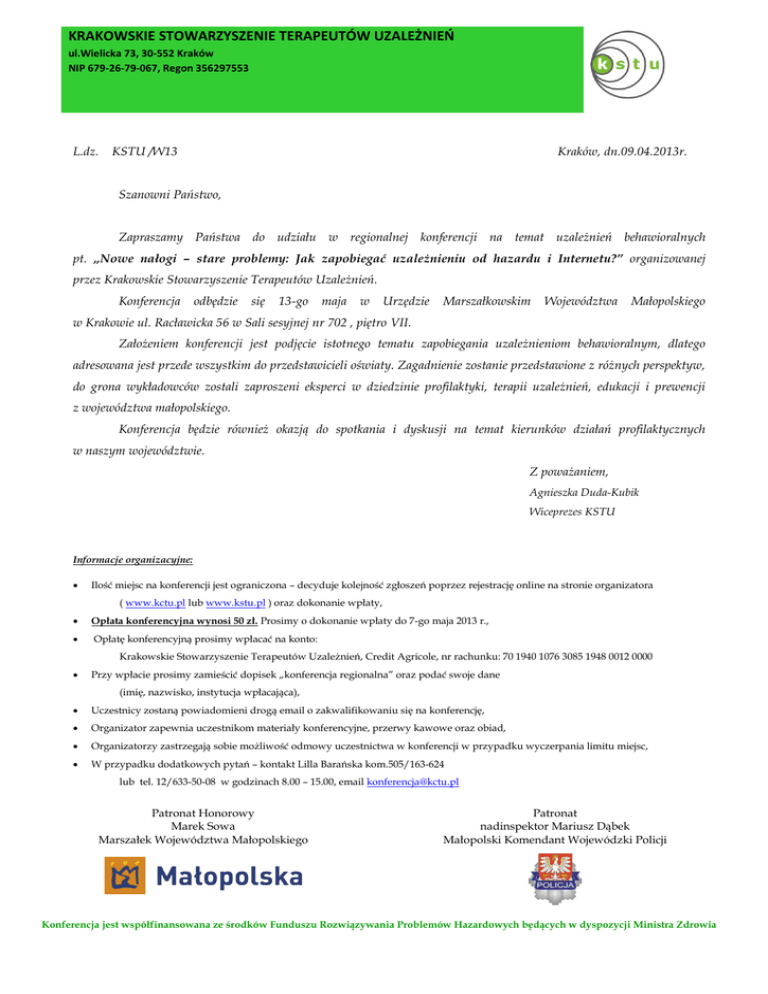 KRAKOWSKIE STOWARZYSZENIE TERAPEUTÓW UZALEŻNIEŃ ul.Wielicka 73, 30-552 Kraków NIP 679-26-79-067, Regon 356297553 L.dz. KSTU /W13 Kraków, dn.09.04.2013r. Szanowni Państwo, Zapraszamy Państwa do udziału w regionalnej konferencji na temat uzależnień behawioralnych pt. „Nowe nałogi – stare problemy: Jak zapobiegać uzależnieniu od hazardu i Internetu?” organizowanej przez Krakowskie Stowarzyszenie Terapeutów Uzależnień. Konferencja odbędzie się 13-go maja w Urzędzie Marszałkowskim Województwa Małopolskiego w Krakowie ul. Racławicka 56 w Sali sesyjnej nr 702 , piętro VII. Założeniem konferencji jest podjęcie istotnego tematu zapobiegania uzależnieniom behawioralnym, dlatego adresowana jest przede wszystkim do przedstawicieli oświaty. Zagadnienie zostanie przedstawione z różnych perspektyw, do grona wykładowców zostali zaproszeni eksperci w dziedzinie profilaktyki, terapii uzależnień, edukacji i prewencji z województwa małopolskiego. Konferencja będzie również okazją do spotkania i dyskusji na temat kierunków działań profilaktycznych w naszym województwie. Z poważaniem, Agnieszka Duda-Kubik Wiceprezes KSTU Informacje organizacyjne: Ilość miejsc na konferencji jest ograniczona – decyduje kolejność zgłoszeń poprzez rejestrację online na stronie organizatora ( www.kctu.pl lub www.kstu.pl ) oraz dokonanie wpłaty, Opłata konferencyjna wynosi 50 zł. Prosimy o dokonanie wpłaty do 7-go maja 2013 r., Opłatę konferencyjną prosimy wpłacać na konto: Krakowskie Stowarzyszenie Terapeutów Uzależnień, Credit Agricole, nr rachunku: 70 1940 1076 3085 1948 0012 0000 Przy wpłacie prosimy zamieścić dopisek „konferencja regionalna” oraz podać swoje dane (imię, nazwisko, instytucja wpłacająca), Uczestnicy zostaną powiadomieni drogą email o zakwalifikowaniu się na konferencję, Organizator zapewnia uczestnikom materiały konferencyjne, przerwy kawowe oraz obiad, Organizatorzy zastrzegają sobie możliwość odmowy uczestnictwa w konferencji w przypadku wyczerpania limitu miejsc, W przypadku dodatkowych pytań – kontakt Lilla Barańska kom.505/163-624 lub tel. 12/633-50-08 w godzinach 8.00 – 15.00, email [email protected] Patronat Honorowy Marek Sowa Marszałek Województwa Małopolskiego Patronat nadinspektor Mariusz Dąbek Małopolski Komendant Wojewódzki Policji Konferencja jest współfinansowana ze środków Funduszu Rozwiązywania Problemów Hazardowych będących w dyspozycji Ministra Zdrowia KRAKOWSKIE STOWARZYSZENIE TERAPEUTÓW UZALEŻNIEŃ ul.Wielicka 73, 30-552 Kraków NIP 679-26-79-067, Regon 356297553 13.05.2013 URZĄD MARSZAŁKOWSKI WOJEWÓDZTWA MAŁOPOLSKIEGO, UL. RACŁAWICKA 56 KRAKÓW SALA SESYJNA NR 702 „Nowe nałogi – stare problemy: Jak zapobiegać uzależnieniu od hazardu i Internetu?” Regionalna konferencja na temat uzależnień behawioralnych. 09.00-10.00 Akredytacja 10.00-10.15 Uroczyste otwarcie Małgorzata Nowobilska-Stanios 10.15-10.45 Ekspert Wojewódzki ds. Informacji o Narkotykach i Narkomanii Województwa Małopolskiego „Zaplecze instytucjonalne w województwie małopolskim w zakresie rozwiązywania problemów uzależnień behawioralnych” Agnieszka Duda-Kubik 10.45-11.15 Wiceprezes Krakowskiego Stowarzyszenia Terapeutów Uzależnień „Gra w granicach – jak pomóc dzieciom i młodzieży bezpiecznie korzystać z gier?” komisarz celny Tomasz Kierski 11.15-11.35 11.35-12.00 Rzecznik prasowy Izby Celnej w Krakowie „Działania profilaktyczne Służby Celnej - Kampania informacyjna Służba Celna ostrzega przed uzależnieniem od hazardu” Przerwa kawowa Katarzyna Baczak 12.00-12.30 Krakowskie Centrum Terapii Uzależnień „Nie przegapić hazardu – podobieństwo objawów i konsekwencji do innych zachowań ryzykownych wśród młodzieży” Serafin Olczak 12.30-13.00 Krakowskie Centrum Terapii Uzależnień „Uzależnienie od komputera i Internetu – czy można skutecznie zapobiegać i leczyć?” komisarz Wojciech Chechelski 13.00-13.20 Ekspert z Wydziału Prewencji Komendy Wojewódzkiej Policji 13.20-14.15 Dyskusja panelowa na temat kierunków rozwoju działań profilaktycznych uzależnień behawioralnych w Małopolsce. 14.15 Zakończenie i obiad „Działania profilaktyczne wobec zagrożeń w sieci” Patronat Honorowy Marek Sowa Marszałek Województwa Małopolskiego Patronat nadinspektor Mariusz Dąbek Małopolski Komendant Wojewódzki Policji Konferencja jest współfinansowana ze środków Funduszu Rozwiązywania Problemów Hazardowych będących w dyspozycji Ministra Zdrowia
