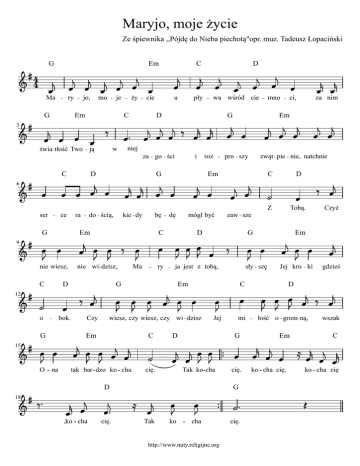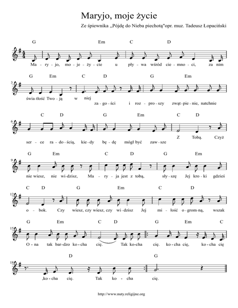 Maryjo, moje życie Ze śpiewnika ,,Pójdę do Nieba piechotą"opr. muz. Tadeusz Łopaciński G Em ry G jo, mo je Em ży cie u C w świa tłość Two ją pły C ser 9 ce G i roz G do ścią, kie dy G Em nie wiesz, nie wi dzisz, mno ci, za nim Em niej D ra wa wśród cie D za go ści 6 D 4 Ma 3 C bę pro szy zwąt pie nie, natchnie Em dę mógł być C C D Z Tobą. Czyż zaw sze D G Em C D o bok. Ma ry ja jest z tobą, G sły szę Em Jej kro ki C gdzieś D 12 G Czy wiesz, czy wiesz, czy wi dzisz Em C Jej D mi G łość o grom ną, Em wszak C 15 O na tak bar dzo ko cha cię. Tak ko cha D cię. G 18 ,ko cha cię. Tak ko cha http://www.nuty.religijne.org cię. ko cha cię, ko cha cię