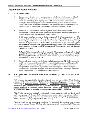 Kościół Chrześcijański „Wieczernik” – Poznawanie znaków czasu – Mike Bickle Poznawanie znaków czasu I. WPROWADZENIE A. Czy możemy wiedzieć na pewno, że żyjemy w pokoleniu, w którym powróci Pan? W jaki sposób możemy to wiedzieć? Pismo zawiera tak wiele informacji na ten temat, ponieważ Bóg chce, abyśmy znali dokładnie czas i znaki oraz warunki otaczające powtórne przyjście Jezusa. Moim zdaniem jesteśmy w początkowych etapach pokolenia, w którym powróci Pan. Nie wiem czy ostatnie 7 proroczych lat rozpocznie się za 5 lat czy za 50 (prawdopodobnie będzie to bliżej 50 niż 5). B. Rozmowa na Górze Oliwnej (Mt 24) daje nam znaki i warunki z wielkimi szczegółami. Dlaczego miałby On nam dawać te szczegóły, a następnie twierdzić, że nikt nie może poznać nawet powodu Jego przyjścia? 1 Gdy Jezus szedł po wyjściu ze świątyni, podeszli do Niego uczniowie, aby Mu pokazać budowle świątyni. 2 Lecz On rzekł do nich: Widzicie to wszystko? Zaprawdę, powiadam wam, nie zostanie tu kamień na kamieniu, który by nie był zwalony. 3 A gdy siedział na Górze Oliwnej, podeszli do Niego uczniowie i pytali na osobności: Powiedz nam, kiedy to nastąpi i jaki będzie znak Twego przyjścia i końca świata? 4 Na to Jezus im odpowiedział: Strzeżcie się, żeby was kto nie zwiódł. (Mt 24:1-4) 7 Zapytali Go: Nauczycielu, kiedy to nastąpi? I jaki będzie znak, gdy się to dziać zacznie? 8 Jezus odpowiedział: Strzeżcie się, żeby was nie zwiedziono. Wielu bowiem przyjdzie pod moim imieniem i będą mówić: Ja jestem oraz: Nadszedł czas. Nie chodźcie za nimi. (Łk 21:7-8) C. II. Po tym, jak Jezus prorokował, że świątynia będzie zniszczona (Mt 24:2), uczniowie zadali Mu dwa pytania. Pierwsze, kiedy świątynia będzie zniszczona? Drugie, jaki będzie znak Powtórnego Przyjścia i końca świata? Problem w tym fragmencie polega na tym, że Jezus daje odpowiedzi, które odnoszą się do dwóch różnych okresów czasu. Pierwsza, świątynia została zniszczona w roku 70 i druga, odnosząca się do końca świata, który nastąpi około 2000 lat później. POCZĄTEK BÓLÓW PORODOWYCH: 12 TRENDÓW (MT 24:4-8; MK 13:5-8; ŁK 21:7-18) 4 Na to Jezus im odpowiedział: Strzeżcie się, żeby was kto nie zwiódł. 5 Wielu bowiem przyjdzie pod moim imieniem i będą mówić: Ja jestem Mesjaszem. I wielu w błąd wprowadzą. 6 Będziecie słyszeć o wojnach i o pogłoskach wojennych; uważajcie, nie trwóżcie się tym. To musi się stać, ale to jeszcze nie koniec! 7 Powstanie bowiem naród przeciw narodowi i królestwo przeciw królestwu. Będzie głód i zaraza, a miejscami trzęsienia ziemi. 8 Lecz to wszystko jest dopiero początkiem boleści. (Mt 24:4-8) 7 Kiedy więc usłyszycie o wojnach i pogłoskach wojennych, nie trwożcie się! To się musi stać, ale to jeszcze nie koniec. 8 Powstanie bowiem naród przeciw narodowi i królestwo przeciw królestwu; będą miejscami trzęsienia ziemi, będą klęski głodu [i zamieszania – Biblia Gdańska]. To jest początek boleści. (Mk 13:7-8) 9 I nie trwożcie się, gdy posłyszycie o wojnach i przewrotach. To najpierw musi się stać, ale nie zaraz nastąpi koniec. 11 Będą silne trzęsienia ziemi, a miejscami głód i zaraza; www.wieczernik.pl, [email protected] Strona - 1 - tel./fax: +48 41 3317610 Kościół Chrześcijański „Wieczernik” – Poznawanie znaków czasu – Mike Bickle ukażą się straszne zjawiska i wielkie znaki na niebie. 12 Lecz PRZED tym wszystkim podniosą na was ręce i będą was prześladować... 16 A wydawać was będą nawet rodzice i bracia, krewni i przyjaciele i niektórych z was o śmierć przyprawią. 18 Ale włos z głowy wam nie zginie. (Łk 21:9-18) A. Jezus mówił o szczególnym okresie czasu, zwanym “początkiem bólów porodowych”. Greckie słowo “bóle porodowe” przetłumaczone jest jako “boleści”. Może to być porównane do narastającego bolesnego przeżycia, jakiego doświadcza kobieta podczas porodu dziecka. Skutkiem tego bolesnego przeżycia jest nowy porządek świata, zrodzony w Millenium. B. Początek bólów porodowych odnosi się do 12 znaczących ogólnoświatowych trendów, które mają być rozpoznane jako prorocze znaki mające pomóc Kościołowi przygotować się do wzrastającej presji. Zawierają one fałszywych mesjaszów, wojny, konflikty etniczne, wojnę ekonomiczną, głód, zarazy, trzęsienia ziemi, zamieszanie, przewroty, straszne zjawiska, wielkie znaki na niebie, i prześladowania (Mt 24:4-8; Mk 13:5-8, Łk 21:7-18). Mateusz podaje 7 głównych trendów, Marek dodaje “zamieszania” a Łukasz opisuje jeszcze 4 “przewroty, straszne zjawiska, wielkie znaki na niebie i prześladowania.” C. Kiedy porównamy Mt 24 z 1Tes 5:2-3 widzimy 3 różne prorocze okresy czasu odnoszące się do ostatniego 7-letniego okresu tego wieku. Pierwszy, początek bólów porodowych (Mt 24:8). Drugi, światowy okres fałszywego pokoju i bezpieczeństwa (wzrastające bóle porodowe; 1Tes 5:2-3; Dn 9:27). Trzeci, Wielki Ucisk (ciężkie bóle porodowe; Mt 24:21; Jr 30:5-7). Ostatni 7 letni okres zawiera 2 części, z których każda trwa 3½ roku. Ostatnie 7 lat zaczyna się, kiedy Antychryst zawrze przymierze, które będzie “gwarantowało” Izraelowi polityczne, ekonomiczne i duchowe prosperowanie wraz z ochroną. Okres Ucisku zacznie się, kiedy Antychryst ustanowi fałszywy pokój, który będzie trwał około 3½ roku. Ten fałszywy pokój pozornie zmieni świat na lepszy. Kiedy bowiem będą mówić: Pokój i bezpieczeństwo - tak niespodzianie przyjdzie na nich zagłada, jak bóle (Wielki Ucisk) na brzemienną, i nie ujdą. (1Tes 5:3) Będzie bowiem wówczas wielki ucisk, jakiego nie było od początku świata aż dotąd i nigdy nie będzie. (Mt 24:21) D. Pokolenie w Piśmie trwa od 40 do 80 lat (Lb 32:13; Ps 90:10). Na przykład, jest blisko 1000 lat dla 14 pokoleń od Abrahama do Dawida (średnio ponad 70 lat na każde pokolenie).