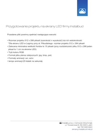 Przygotowanie projektu na ekrany LED firmy Instalbud Przes³ane pliki powinny spe³niaæ nastêpuj¹ce warunki • Rozmiar projektu 512 x 288 pikseli (szerokoœæ x wysokoœæ) lub ich wielokrotnoœæ *Dla ekranu LED w Legnicy przy al. Pi³sudskiego rozmiar projektu 512 x 384 pikseli • Zalecana minimalna wielkoœæ fontów to 15 pikseli (przy rozdzielczoœci pliku 512 x 288 jeden piksel to 1 cm na ekranie LED) • Tryb koloru RGB • Format pliku plansz statycznych: jpg, bmp, psd, • Formaty animacji: avi, wmv • tempo animacji:25 klatek na sekundê Instalbud s.c. Cichocki Wochniak ul. Towarowa 8, 59-300 Lubin tel: 781 930 840 ekrany.instalbud.net.pl