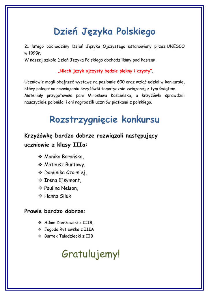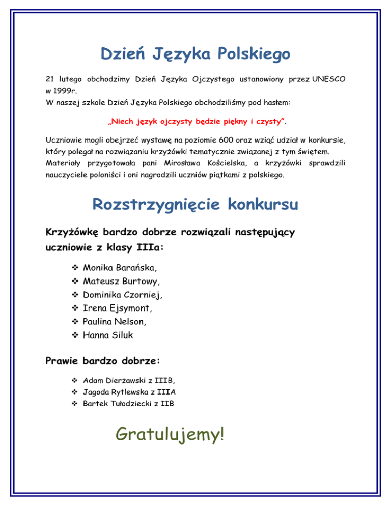 Dzień Języka Polskiego 21 lutego obchodzimy Dzień Języka Ojczystego ustanowiony przez UNESCO w 1999r. W naszej szkole Dzień Języka Polskiego obchodziliśmy pod hasłem: „Niech język ojczysty będzie piękny i czysty”. Uczniowie mogli obejrzeć wystawę na poziomie 600 oraz wziąć udział w konkursie, który polegał na rozwiązaniu krzyżówki tematycznie związanej z tym świętem. Materiały przygotowała pani Mirosława Kościelska, a krzyżówki sprawdzili nauczyciele poloniści i oni nagrodzili uczniów piątkami z polskiego. Rozstrzygnięcie konkursu Krzyżówkę bardzo dobrze rozwiązali następujący uczniowie z klasy IIIa: Monika Barańska, Mateusz Burtowy, Dominika Czorniej, Irena Ejsymont, Paulina Nelson, Hanna Siluk Prawie bardzo dobrze: Adam Dierżawski z IIIB, Jagoda Rytlewska z IIIA Bartek Tułodziecki z IIB Gratulujemy!
