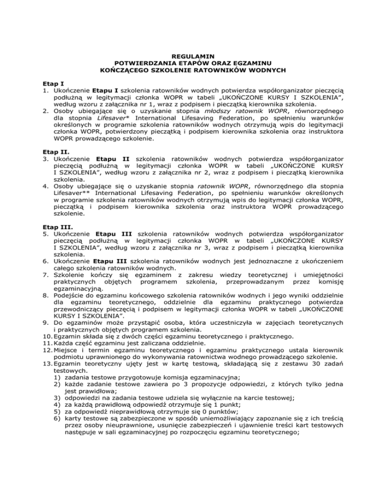 REGULAMIN POTWIERDZANIA ETAPÓW ORAZ EGZAMINU KOŃCZĄCEGO SZKOLENIE RATOWNIKÓW WODNYCH Etap I 1. Ukończenie Etapu I szkolenia ratowników wodnych potwierdza współorganizator pieczęcią podłużną w legitymacji członka WOPR w tabeli „UKOŃCZONE KURSY I SZKOLENIA”, według wzoru z załącznika nr 1, wraz z podpisem i pieczątką kierownika szkolenia. 2. Osoby ubiegające się o uzyskanie stopnia młodszy ratownik WOPR, równorzędnego dla stopnia Lifesaver* International Lifesaving Federation, po spełnieniu warunków określonych w programie szkolenia ratowników wodnych otrzymują wpis do legitymacji członka WOPR, potwierdzony pieczątką i podpisem kierownika szkolenia oraz instruktora WOPR prowadzącego szkolenie. Etap II. 3. Ukończenie Etapu II szkolenia ratowników wodnych potwierdza współorganizator pieczęcią podłużną w legitymacji członka WOPR w tabeli „UKOŃCZONE KURSY I SZKOLENIA”, według wzoru z załącznika nr 2, wraz z podpisem i pieczątką kierownika szkolenia. 4. Osoby ubiegające się o uzyskanie stopnia ratownik WOPR, równorzędnego dla stopnia Lifesaver** International Lifesaving Federation, po spełnieniu warunków określonych w programie szkolenia ratowników wodnych otrzymują wpis do legitymacji członka WOPR, pieczątką i podpisem kierownika szkolenia oraz instruktora WOPR prowadzącego szkolenie. Etap III. 5. Ukończenie Etapu III szkolenia ratowników wodnych potwierdza współorganizator pieczęcią podłużną w legitymacji członka WOPR w tabeli „UKOŃCZONE KURSY I SZKOLENIA”, według wzoru z załącznika nr 3, wraz z podpisem i pieczątką kierownika szkolenia. 6. Ukończenie Etapu III szkolenia ratowników wodnych jest jednoznaczne z ukończeniem całego szkolenia ratowników wodnych. 7. Szkolenie kończy się egzaminem z zakresu wiedzy teoretycznej i umiejętności praktycznych objętych programem szkolenia, przeprowadzanym przez komisję egzaminacyjną. 8. Podejście do egzaminu końcowego szkolenia ratowników wodnych i jego wyniki oddzielnie dla egzaminu teoretycznego, oddzielnie dla egzaminu praktycznego potwierdza przewodniczący pieczęcią i podpisem w legitymacji członka WOPR w tabeli „UKOŃCZONE KURSY I SZKOLENIA”. 9. Do egzaminów może przystąpić osoba, która uczestniczyła w zajęciach teoretycznych i praktycznych objętych programem szkolenia. 10. Egzamin składa się z dwóch części egzaminu teoretycznego i praktycznego. 11. Każda część egzaminu jest zaliczana oddzielnie. 12. Miejsce i termin egzaminu teoretycznego i egzaminu praktycznego ustala kierownik podmiotu uprawnionego do wykonywania ratownictwa wodnego prowadzącego szkolenie. 13. Egzamin teoretyczny ujęty jest w kartę testową, składającą się z zestawu 30 zadań testowych. 1) zadania testowe przygotowuje komisja egzaminacyjna; 2) każde zadanie testowe zawiera po 3 propozycje odpowiedzi, z których tylko jedna jest prawidłowa; 3) odpowiedzi na zadania testowe udziela się wyłącznie na karcie testowej; 4) za każdą prawidłową odpowiedź otrzymuje się 1 punkt; 5) za odpowiedź nieprawidłową otrzymuje się 0 punktów; 6) karty testowe są zabezpieczone w sposób uniemożliwiający zapoznanie się z ich treścią przez osoby nieuprawnione, usunięcie zabezpieczeń i ujawnienie treści kart testowych następuje w sali egzaminacyjnej po rozpoczęciu egzaminu teoretycznego; 7) w trakcie egzaminu teoretycznego jest zabronione wynoszenie lub usuwanie w inny sposób karty testowej z sali egzaminacyjnej; 8) podstawą do zaliczenia egzaminu teoretycznego jest udzielenie prawidłowych odpowiedzi na co najmniej 80% zadań testowych zawartych w karcie testowej. 14. Do egzaminu praktycznego przystępuje się po uzyskaniu pozytywnego wyniku z egzaminu teoretycznego. 15. Egzamin praktyczny kończący szkolenie ratownika wodnego obejmuje wykonanie przez osobę zdającą siedmiu zadań polegających na: 1) przepłynięciu sposobem dowolnym po skoku startowym 400 m w czasie nie dłuższym niż 8 min; 2) przepłynięciu dystansu 25 m pod lustrem wody z wydobyciem dwóch przedmiotów leżących w odległości od 2 m do 2,5 m po obu stronach linii płynięcia; 3) przepłynięciu sposobem ratowniczym (z głową nad powierzchnią wody) dystansu 50 m w czasie poniżej 55 s; 4) przepłynięciu w czasie nie dłuższym niż 2 min 40 s ratowniczą łodzią wiosłową lub kajakiem za pomocą dwóch wioseł dystansu 75 m w linii prostej do boi (pławy), na dopłynięciu do niej rufą i na powrocie do miejsca startu za pomocą jednego wiosła; 5) przeprowadzeniu symulowanej akcji ratowniczej, polegającej na przepłynięciu dystansu co najmniej 20 m, wydobyciu manekina położonego na dnie i na holowaniu go w pasie ratowniczym do brzegu na dystansie 20 m; 6) holowaniu tonącego bez przerwy i na zatrzymaniu na dystansie 150 m, z zastosowaniem trzech sposobów holowania – każdy na dystansie 50 m; 7) wyciągnięciu na brzeg o wysokości co najmniej 30 cm od lustra wody lub na pokład łodzi osoby poszkodowanej i na ułożeniu jej w pozycji umożliwiającej udzielanie kwalifikowanej pierwszej pomocy. 16. Zadania ust. 15 pkt 1 – 3 przeprowadza się na pływalni, pkt 4 przeprowadza się na wodach otwartych, pkt 5 – 7 przeprowadza się na wodach otwartych lub na pływalni. 17. Podstawą do zaliczenia egzaminu praktycznego jest zaliczenie wszystkich zadań. 18. W przypadku gdy osoba zdająca nie zaliczy egzaminu teoretycznego lub nie przystąpi do niego z ważnych przyczyn losowych, może ponownie przystąpić do egzaminu teoretycznego w następnym terminie wyznaczonym przez kierownika podmiotu uprawnionego do wykonywania ratownictwa wodnego prowadzącego szkolenie. 19. W razie niezaliczenia egzaminu praktycznego lub nieprzystąpienia do niego z ważnych przyczyn losowych można ponownie przystąpić do egzaminu praktycznego bez konieczności ponownego przystępowania do egzaminu teoretycznego. 20. W przypadkach, o których mowa w punkcie 18 i 19 można prz