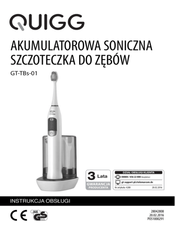 AKUMULATOROWA SONICZNA SZCZOTECZKA DO ZĘBÓW GT-TBs-01 3 Lata GWARANCJA PRODUCENTA DZIAŁ OBSŁUGI KLIENTA 00800 / 456 22 000 (bezpłatny) [email protected] Nr artykułu: 4280 20.02.2016 INSTRUKCJA OBSŁUGI 28042808 20.02.2016 PO51000291 SPIS TREŚCI SYMBOLIKA Symbolika 2 Zasady bezpieczeństwa 3 Oznaczenia części / Zawartość opakowania 7 Wymienne nasadki szczoteczki do zębów 8 Przed pierwszym użyciem 8 Obsługa 10 Wymienne końcówki szczoteczki do zębów 13 Zakłócenia i sposób ich usuwania 13 Dane techniczne 13 Deklaracja zgodności 14 Utylizacja 14 2 Sygnalizuje zagrożenie o średnim poziomie ryzyka, które jeżeli nie zostanie uniknięte, może doprowadzić do śmierci lub ciężkich obrażeń. OSTRZEŻENIE! WSKAZANIE! Nieprzestrzeganie może doprowadzić do szkód materialnych. INFORMACJA! Sygnalizuje wskazówki i objaśnienia. Oznaczenie WEEE Urządzenia nie wolno wyrzucać razem z odpadami domowymi. Odbiór baterii Baterii i akumulatorów nie wolno wyrzucać do domowego śmietnika. Produkty oznaczone tym symbolem spełniają wymagania wszystkich odnośnych przepisów unijnych Europejskiego Obszaru Gospodarczego. IP67 Ten artykuł jest pyłoszczelny i zabezpieczony przed skutkami krótkotrwałego zanurzenia w wodzie. ZASADY BEZPIECZEŃSTWA Przeczytaj w całości niniejszą instrukcję użytkowania przed rozpoczęciem użytkowania urządzenia i zachowaj ją, aby w razie potrzeby móc do niej zajrzeć później. Przekazując artykuł innym osobom, przekaż im także niniejszą instrukcję obsługi. Przeznaczenie Urządzenie służy do czyszczenia zębów i jest przeznaczone wyłącznie do użytku domowego. Nie nadaje się do zastosowań zarobkowych. Urządzenie może być używane tylko z akcesoriami dostarczonymi w komplecie i z odpowiednio dopasowanymi końcówkami. Niebezpieczeństwo dla dzieci i innych osób. To urządzenie może być używane przez dzieci oraz osoby z ograniczoną sprawnością psychiczną, zmysłową lub umysłową lub nie posiadające doświadczenia i/lub wiedzy, jeżeli będą one przy tym nadzorowane przez osobę odpowiedzialną za ich bezpieczeństwo lub zostaną pouczone o zasadach bezpiecznego używania urządzenia oraz zrozumieją związane z tym zagrożenia. Czyszczenie i konserwacja przewidziana dla użytkownika nie mogą być wykonywane przez dzieci, chyba że będą one przy tym nadzorowane. 3 Dopilnuj, aby dzieci nie miały dostępu do materiałów opakowaniowych. Połknięcie tych materiałów grozi uduszeniem. Dopilnuj, aby dzieci nie nakładały sobie worków opakowaniowych na głowę. Urządzenia nie wolno dawać dzieciom do zabawy. Zagrożenia związane z energią elektryczną Niebezpieczeństwo porażenia elektrycznego! W urządzeniu występuje niebezpieczne napięcie elektryczne. Obchodzenie się z płynami w ramach użytkowania urządzeń elektrycznych wymaga maksymalnej koncentracji! Częstą przyczyną wypadków w gospodarstwie domowym jest nieuwaga przy wykonywaniu rutynowych czynności. Zwróć uwagę, aby podczas podłączania lub wyciągania wtyczki sieciowej Twoje ręce były zawsze suche. Ładowarka nie może być narażona na kontakt z kapiącą lub pryskającą wodą. OSTRZEŻENIE! 4 Nigdy nie zanurzaj ładowarki w wodzie ani w innych cieczach. Niebezpieczeństwo porażenia elektrycznego! Dlatego nie używaj ładowarki w bezpośrednim sąsiedztwie źródeł wilgoci, np. umywalki, wanny lub natrysku. Nie używaj urządzenia na wolnym powietrzu i nie narażaj na działanie czynników atmosferycznych: deszczu, śniegu lub mrozu. Podłączaj ładowarkę tylko do prawidłowo zainstalowanego gniazda sieciowego z zestykiem ochronnym, którego napięcie jest zgodne z danymi technicznymi. W razie zastosowania rozgałęziacza lub przedłużacza, muszą one być zgodne z wymaganiami bezpieczeństwa. Nie można przekroczyć maksymalnego podanego natężenia prądu. Dopilnuj, aby zapewniony był dobry dostęp do gniazda tak, aby w razie potrzeby można było szybko wyciągnąć wtyczkę. Nie używaj urządzenia: – gdy jest uszkodzony, – gdy uszkodzony jest kabel zasila- jący lub wtyczka sieciowa, – po upadku. Przed każdym użyciem zawsze odwijaj całą długość kabla zasilającego. Dopilnuj, aby kabel zasilający nie mógł zostać przytrzaśnięty lub zgnieciony ani uszkodzony przez ostre krawędzie lub gorące przedmioty. Zawsze wyciągaj wtyczkę z gniazda sieciowego: – gdy ładowarka nie jest używana, – po zakończeniu ładowania, – przed czyszczeniem lub odstawieniem urządzenia, – w razie wystąpienia wyraźnego zakłócenia w czasie pracy, – w czasie burzy. Zawsze ciągnij za wtyczkę sieciową a nie za kabel zasilający. Nie zmieniaj urządzenia ani kabla zasilającego. Wykonanie napraw powierzaj zawsze warsztatowi specjalistycznemu. Przestrzegaj także warunków gwarancji. Kabla zasilającego ładowarki nie wolno wymieniać. W razie uszkodzenia urządzenie należy poddać należytej utylizacji. Moduł ręczny wolno ładować tylko za pomocą dostarczonej w komplecie ładowarki. Urządzenia nie wolno podłączać do programatora zegarowego lub osobnego systemu zdalnego sterowania, jak np. wyłącznik zmierzchowy lub gniazdo radiowe. Niebezpieczeństwo obrażeń spowodowanych innymi przyczynami. Ułóż kabel sieciowy tak, aby nie potykać się o niego. Wymieniaj niezwłocznie zużyte lub uszkodzone końcówki, aby uniknąć podrażnień lub skaleczeń w ustach lub okolicach zębów. 5 Uwaga - szkody materialne Ustaw urządzenie na równej, żaroodpornej i odpornej na rozpryski powierzchni Zwracaj uwagę na wystarczająco dużą odległość od silnych źródeł ciepła, jak płyty grzejne, rury grzejne itd. Unikaj nadmiernego nagromadzenia ciepła i ustawiaj urządzenie tak, aby ciepło powstające w trakcie jego użytkowania mogło być skutecznie odprowadzane z obudowy. Nie kładź na urządzenie żadnych przedmiotów, np. ścierek lub gazet. Niebezpieczeństwo pożaru! Na spodzie urządzenia znajduje
