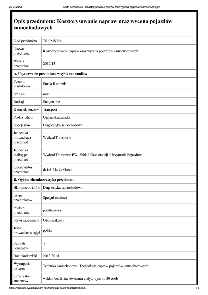 25.09.2013 Karta przedmiotu - Kosztorysowanie napraw oraz wycena pojazdów samochodowych Opis przedmiotu: Kosztorysowanie napraw oraz wycena pojazdów samochodowych Kod przedmiotu TR.SMS224 Nazwa przedmiotu Kosztorysowanie napraw oraz wycena pojazdów samochodowych Wersja przedmiotu 2012/13 A. Usytuowanie przedmiotu w systemie studiów Poziom Kształcenia Studia II stopnia Stopień mgr Rodzaj Stacjonarne Kierunek studiów Transport Profil studiów Ogólnoakademicki Specjalność Diagnostyka samochodowa Jednostka prowadząca przedmiot Wydział Transportu Jednostka realizująca przedmiot Wydział Transportu PW, Zakład Eksploatacji i Utrzymania Pojazdów Koordynator przedmiotu dr inż. Marek Guzek B. Ogólna charakterystyka przedmiotu Blok przedmiotów Diagnostyka samochodowa Grupa przedmiotów Specjalnościowe Poziom przedmiotu podstawowy Status przedmiotu Obowiązkowy Język polski prowadzenia zajęć Semestr nominalny 2 Rok akademicki 2013/2014 Wymagania wstępne Technika samochodowa. Technologia napraw pojazdów samochodowych Limit liczby studentów wykład bez limitu, ćwiczenia audytoryjne do 30 osób https://ects.coi.pw.edu.pl/adminprzedmiot/print/idPrzedmiot/763822 1/4 25.09.2013 Karta przedmiotu - Kosztorysowanie napraw oraz wycena pojazdów samochodowych C. Efekty kształcenia i sposób prowadzenia zajęć Cel przedmiotu Zapoznanie studenta z metodami i narzędziami wyceny napraw pojazdów samochodowych oraz metodami wyceny pojazdów i ich pozostałości, stosowanymi przez rzeczoznawców techniki samochodowej, biegłych sądowych, pracowników firm ubezpieczeniowych i zakładów naprawczych Metody oceny Wykład, ćwiczenia audytoryjne - 2 kolokwia. Efekty kształcenia Patrz tabela 1 Forma zajęć dydaktycznych i ich wymiar tygodniowy Wykład 1 Ćwiczenia 1 Laboratoria 0 Projekty Treści kształcenia 0 Treść wykładu: Charakterystyka parku samochodowego w Polsce i Europie. Podmioty zainteresowane kosztorysowaniem – zleceniodawcy, wykonawcy napraw, firmy ubezpieczeniowe, strony postępowań prawnych. Rodzaje kosztorysów i ich przeznaczenie. Podstawowe pojęcia i definicje: wartości rynkowej, wartości bazowej, wartości pozostałości, rynkowego ubytku wartości. Metodyka określania wartości rynkowych pojazdów według instrukcji Stowarzyszenia Rzeczoznawców Techniki Samochodowej i Ruchu Drogowego. System wyceny Info-Ekspert. Zasady wyznaczania i stosowania korekt wartości wynikających z daty pierwszej rejestracji, wyposażenia dodatkowego, przebiegu, stanu pojazdu, szczególnego charakteru użytkowania, wcześniejszych napraw powypadkowych, liczby właścicieli i niewłaściwego serwisowania pojazdu. Zasady stosowania korekt z tytułu składania pojazdu w warunkach innych niż u producenta oraz korekt dotyczących napraw koniecznych. Metody określania wartości pojazdów uszkodzonych. Sposoby określania wartości pojazdów nietypowych. Ogólne zagadnienia związane z zakresem kosztorysowania napraw pojazdów. Warunki i parametry niezbędne przy wykonywaniu kosztorysów. Informacja o organizacji systemu warsztatów naprawczych, stosowanych metodach naprawczych, wyposażeniu technologicznym i możliwościach wykonawczych. Narzędzia stosowane przy kosztorysowaniu napraw. Audatex jako podstawowe narzędzie rzeczoznawcze przy oględzinach pojazdów uszkodzonych i kosztorysowaniu napraw. Informacja o sposobie wykorzystania Audatex do poznania konstrukcji pojazdów, zastosowanych materiałach i metodach naprawczych. Audatex jako narzędzie umożliwiające jednoznaczne wyliczenie kosztów naprawy oraz weryfikujące wiedzę rzeczoznawczą w zakresie technologii napraw pojazdów. Możliwość weryfikacji kosztorysów wykonanych w systemie Audatex w obcych językach i porozumiewania się zainteresowanych o różnym poziomie dostępu do wiedzy rzeczoznawczej. Podstawowe informacje z zakresu ubezpieczeń komunikacyjnych i sposobów likwidacji szkód. Treść ćwiczeń audytoryjnych: Praktyczne wykorzystanie komputerowego systemu Info-Ekspert w wycenie wartości pojazdów samochodowych z uwzględnieniem stanu technicznego oraz korekt wartości. Przykładowe określenie wartości pojazdów w stanie uszkodzonym. Praktyczne wykorzystanie systemu Audatex do poznania konstrukcji pojazdów, zastosowanych materiałów i metod naprawczych. Przykłady wykorzystania składników Audatex. Wyliczenia kosztów naprawy oraz weryfikujące wiedzę rzeczoznawczą w zakresie technologii napraw pojazdów. Audatex jako narzędzie wymuszające poprawną identyfikację pojazdu i jego kompletację. Rodzaje operacji naprawczych i ich właściwości w Systemie Audatex. Rodzaje części zamiennych, i sposoby korygowania ich wartości. Rodzaje lakierowania, przykłady ich zastosowań i korygowania kosztorysów w tym zakresie. Funkcje systemu Audatex umożliwiające komunikację pomiędzy zainteresowanymi uczestnikami procesów napraw pojazdów. Sposoby weryfikacji kosztorysów. Metody sprawdzenia efektów kształcenia Patrz tabela 1 Egzamin nie 1) Wskazane przez prowadzącego przedmiot numery periodyku SRTSiRD „Rzeczoznawca samochodowy”. ISSN 1425-4786. 2) Pojazdy samochodowe .Wartości rynkowe. Wydawnictwo INFOEKSPERT. 3) Pojazdy samochodowe – Wkładka techniczna. Wydawnictwo INFO-EKSPERT. 4) https://ects.coi.pw.edu.pl/adminprzedmiot/print/idPrzedmiot/763822 2/4 25.09.2013 Karta przedmiotu - Kosztorysowanie napraw oraz wycena pojazdów samochodowych EKSPERT. 3) Pojazdy samochodowe – Wkładka techniczna. Wydawnictwo INFO-EKSPERT. 4) SUPER Schwacke. Wydawnictwo Eurotax Schwacke. 5) Krajowe czasopisma motoryzacyjne: „Giełda Samochodowa”, „Auto Biznes Ogłoszenia”, „AUTO Bazar”, „TRUCK”, „Moto EXPRESS”, „Miesięcznik Ubezpieczeniowy”. 6) Strona internetowa firmy INFO-EKSPERT – www.info-ekspert.pl 7) Literatura dostarczona przez prowadzącego przedmiot. Literatura Witryna www przedmiotu www.wt.pw.edu.pl D. Nakład pracy studenta Liczba punktów ECTS 2 Liczba godzin pracy stude