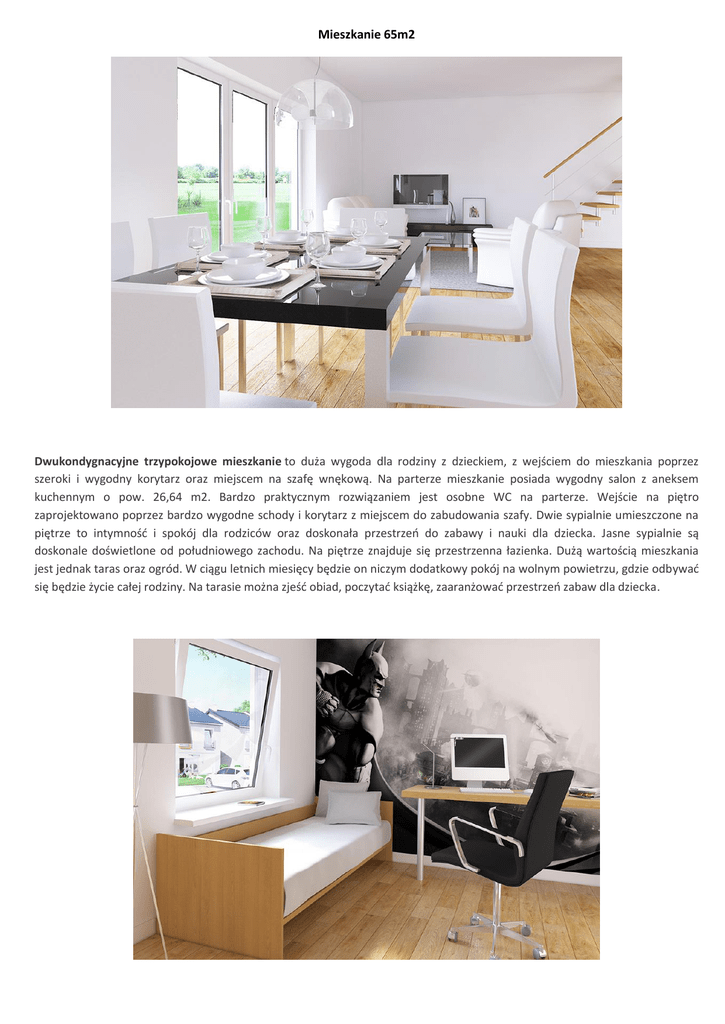 Mieszkanie 65m2 Dwukondygnacyjne trzypokojowe mieszkanie to duża wygoda dla rodziny z dzieckiem, z wejściem do mieszkania poprzez szeroki i wygodny korytarz oraz miejscem na szafę wnękową. Na parterze mieszkanie posiada wygodny salon z aneksem kuchennym o pow. 26,64 m2. Bardzo praktycznym rozwiązaniem jest osobne WC na parterze. Wejście na piętro zaprojektowano poprzez bardzo wygodne schody i korytarz z miejscem do zabudowania szafy. Dwie sypialnie umieszczone na piętrze to intymność i spokój dla rodziców oraz doskonała przestrzeń do zabawy i nauki dla dziecka. Jasne sypialnie są doskonale doświetlone od południowego zachodu. Na piętrze znajduje się przestrzenna łazienka. Dużą wartością mieszkania jest jednak taras oraz ogród. W ciągu letnich miesięcy będzie on niczym dodatkowy pokój na wolnym powietrzu, gdzie odbywać się będzie życie całej rodziny. Na tarasie można zjeść obiad, poczytać książkę, zaaranżować przestrzeń zabaw dla dziecka. Wizualizacja parteru Wizualizacja piętra