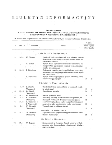 B I U L E T Y N I N F O R M A C Y J N Y SPRAWOZDANIE Z D ZIAŁALN OŚ C I POLSKIEG O TOWARZYSTWA MECHANIKI TEORETYCZN EJ I STOSOWAN EJ W CZWARTYM KWARTALE 1971 r. W okresie tym zorganizowano 19 zebrań i sesji naukowych, na których wygłoszono 26 referatów. Liczba Lp. D ata Prelegent Temat uczest- dyskuników tantów . O d d z i a ł w B y d g o s z c z y ł i 24,11 W. Weiner H. H olka 20.12 J. Steinbom B. Siolkowski Zależ ność cech materiał owych przy zginaniu epoksydowego tworzywa zbrojonego włóknem szklanym od • szerokoś ci kształ tki '::''. . Wpływ drgań wybranych elementów obrabiarki na chropowatość powierzchni toczenia wykań czają ceg o stopów aluminiowych Zmienność moduł u sprę ż ystośi cliniowej epoksydowego tworzywa zbrojonego włóknem szklanym w próbie rozcią gania " Wpływ rozstawu podpór na granice statecznej pracy wał ów wysię gnikowych • • <.... II 28 O d d z i a ł w C z ę s t o c h o w i e 3. 4.10 4. 29.10 5. 6. 10.11 1.12 7. 17.12 8. 9.11 9. 25.11 S. Ziemba (Warszawa) Z. Olesiak (Warszawa) W. Lenkiewicz Z. Marciniak (Warszawa) E. Olszewski i S. Waczyń sk i W. N owacki (Warszawa) Cz. Woź niak (Warszawa) Tarcie i zuż ycie a niezawodność w procesach obróbki plastycznej Zagadnienia szczelin N atura procesów tarcia Problemy lokalnej utraty statecznoś ci powł ok plastycznych poddanych dwuosiowemu rozcią ganiu Mechanizm planetarno- kulisowy o jednym zmiennym parametrze jako transformator ruchu obrotowego Termodyfuzja w ciał ach stał ych 17.11 W. Bogusz 38 11 10 50 O d d z i a ł w G l i w i c a c h D yskretna teoria sprę ż ystośi i jej zastosowania w c mechanice konstrukcji O d d z i a ł w K r a k o w i e 0. 19 26 : Sprawozdanie z Kongresu Teorii Maszyn w D ubrówniku oraz Sprawozdanie z konferencji Mechaniki w Berlinie . • 29 BIULETYN INFORMACYJNY 344 Z. Engel S. Szefer M. Chrzanowski 11. 2.12 12. .13.12 S. Bottcher (Berlin) J. Szmelter (Warszawa) Sprawozdanie z VII Konferencji D ynamiki Maszyn w G liwicach Sprawozdanie z Sympozjum nieklasycznych zagadnień teorii sprę ż ystośi c w Kijowie Peł zanie rury gruboś ciennej z uwzglę dnieniem równoczesnego narastania uszkodzeń Obcią ż enie dynamiczne i ich zmiany w czasie oraz wpływ na ż ywotność napę dów hutniczych Zastosowanie metody elementów skoń czonych w mechanice teoretycznej 15 38 33 O d d z i a ł w P o z n a n i u 13. 14. 29.11 13.12 15. 28.10 16. 18.12 D ział anie karbu w ś wietle analizy wymiarowej Zagadnienia niesymetrycznej teorii konsolidacji O d d z i a ł w S z c z e c i n i e Krytyczny stan równowagi ś ciskanego prę ta J. D orobczyń ski wstę pnie sprę ż onego O niesymetrycznej teorii sprę ż ystośi c W. N owacki (Warszawa) J. Kubik Z . Sobczyń sk a 18 14 4 5 17 7 36 6 O d d z i a ł w W a r s z a w i e 17. 6.12 Wprowadzenie do dyskretnej teorii sprę ż ystośi c N iektóre twierdzenia dyskretnej teorii sprę ż ystośi c Dyskretne powł oki sprę ż yste Cz. Woź niak W. Kufel M. Kleiber 40 O d d z i a ł we W r o c ł a w i u 18. 19. 29.11 6.12 E. Brzuchowski Z. Mazurkiewicz Znane i nieznane własnoś ci eksponenty Historia mechaniki teoretycznej i stosowanej w Polsce 11 33 Sympozja O d d z i a ł w Ł o d z i zorganizował wspólnie z Instytutem Mechaniki Stosowanej Politechniki Łódzkiej I I Sympozjum na temat «Statecznoś ci konstrukcji* z udział em 90 osób (w tym 40 spoza oś rodka ł ódzkiego). W dyskusji zabrał y gł os 52 osoby. Wygł oszono 22 nastę pują ce referaty podzielone na trzy grupy tematyczne oraz wydano streszczenia referatów. I. Statecznoś ć prę tów i ukł adów prę towych 1. W. G utkowski J. Bauer 2. E. Switoń sk i 3. B. H usiar 4. J. Murzewski, J. Siepak 5. J. Juszkiewicz 6. H . Kopecki, J. Zacharzewski Stateczność regularnych konstrukcji prę towych Stateczność prę tów cienkoś ciennych o profilu odwrotnym i zmiennym przekroju O pewnym przypadku statecznoś ci pasma rusztowego Zwichrzenie powł okowego dzwigara naprę ż onego przy obcią ż eniach losowych Zwichrzenie stalowych belek cią gł ych Energia dysponowana jako kryterium do okreś lania czasu krytycznego prę ta ś ciskanego z materiał u o wł asnoś ciach Teologicznych BIULETYN INFORMACYJNY 345 II. Statecznoś ć pł yt 7. R. Dą browski 8. L. Adamiec 9. W. Walczak 10. M, Trombski 11. Z. Waszczyszyn 12. M. Kmiecik Stany podkrytyczne w cienkich ś rodnikach elementów metalowych Metoda energetyczna w zastosowaniu do okreś lania obcią ż ńe krytycznych pł yt poddanych dział aniu sił skupionych Wpływ wstę pnych ugię ć na pracę płyty prostoką tnej zginanej w swej pł aszczyź nie Praca pł yt pierś cieniowych ortotropowych po utracie statecznoś ci Wyboczenie dwuwarstwowych płyt kołowych poza zakresem sprę ż ysty m N oś ność graniczna osiowo ś ciskanych wzdłuż nie uż ebrowanych płyt okrę towych III. Statecznoś ć powł ok 13. S. Łukasiewicz 14. K. Sobiesiak 15. T. Gał kiewicz 16. St. Spryszyń sk i 17. W. Szyć 18. R. Dą browski, S. Wachowiak 19. W. Zwoliń sk i 20. S. Janiak 21. D . Bugajny 22. J. Zielnica Ś ciskan a osiowo powł oka walcowa przy bardzo duż ych ugię ciach Analityczna ocena wpływu niedokł adnoś ci wykonania powł ok walcowych dł ugich i ś redniej dł ugoś ci na górne ciś nienie krytyczne w uję ciu nieliniowym Pewne zagadnienia statecznoś ci powł ok walcowych poddanych skrę caniu Stateczność dynamiczna powł ok walcowych poddanych skrę caniu O pewnym dynamicznym zagadnieniu statecznoś ci trójwarstwowej otwartej powł oki walcowej N aprę ż enia w cienkich ś rodnikach zakrzywionych Stateczność dynamiczna powł ok w kształ cie czaszy kulistej o małej wyniosł oś ci poddanej ciś nieniu normalnemu Badania doś wiadczalne nad statecznoś cią powł oki stoż kowej N ieliniowe zagadnienia statecznoś ci trójwarstwowej powł oki stoż kowej wszechstronnie ś ciskanej Zastosowanie teorii plastycznego pł ynię cia do analizy statecznoś ci powłoki stoż kowej 