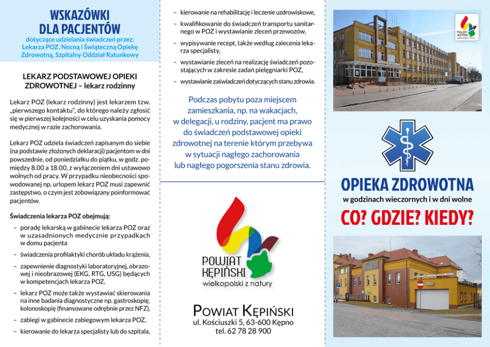 WSKAZÓWKI DLA PACJENTÓW dotyczące udzielania świadczeń przez: Lekarza POZ, Nocną i Świąteczną Opiekę Zdrowotną, Szpitalny Oddział Ratunkowy LEKARZ PODSTAWOWEJ OPIEKI ZDROWOTNEJ – lekarz rodzinny Lekarz POZ (lekarz rodzinny) jest lekarzem tzw. „pierwszego kontaktu”, do którego należy zgłosić się w pierwszej kolejności w celu uzyskania pomocy medycznej w razie zachorowania. Lekarz POZ udziela świadczeń zapisanym do siebie (na podstawie złożonych deklaracji) pacjentom w dni powszednie, od poniedziałku do piątku, w godz. pomiędzy 8.00 a 18.00, z wyłączeniem dni ustawowo wolnych od pracy. W przypadku nieobecności spowodowanej np. urlopem lekarz POZ musi zapewnić zastępstwo, o czym jest zobowiązany poinformować pacjentów. –– kierowanie na rehabilitację i leczenie uzdrowiskowe, –– kwalifikowanie do świadczeń transportu sanitarnego w POZ i wystawianie zleceń przewozów, –– wypisywanie recept, także według zalecenia lekarza specjalisty, –– wystawianie zleceń na realizację świadczeń pozostających w zakresie zadań pielęgniarki POZ, –– wystawianie zaświadczeń dotyczących stanu zdrowia. Podczas pobytu poza miejscem zamieszkania, np. na wakacjach, w delegacji, u rodziny, pacjent ma prawo do świadczeń podstawowej opieki zdrowotnej na terenie którym przebywa w sytuacji nagłego zachorowania lub nagłego pogorszenia stanu zdrowia. opieka zdrowotna w godzinach wieczornych i w dni wolne CO? GDZIE? KIEDY? Świadczenia lekarza POZ obejmują: –– poradę lekarską w gabinecie lekarza POZ oraz w uzasadnionych medycznie przypadkach w domu pacjenta –– świadczenia profilaktyki chorób układu krążenia, –– zapewnienie diagnostyki laboratoryjnej, obrazowej i nieobrazowej (EKG, RTG, USG) będących w kompetencjach lekarza POZ, –– lekarz POZ może także wystawiać skierowania na inne badania diagnostyczne np. gastroskopię, kolonoskopię (finansowane odrębnie przez NFZ), –– zabiegi w gabinecie zabiegowym lekarza POZ, –– kierowanie do lekarza specjalisty lub do szpitala, Powiat Kępiński ul. Kościuszki 5, 63‑600 Kępno tel. 62 78 28 900 NOCNA I ŚWIĄTECZNA OPIEKA ZDROWOTNA Świadczenia udzielane są w razie nagłego zachorowania lub nagłego pogorszenia stanu zdrowia w dni powszednie, od poniedziałku do piątku, w godz. od 18.00 do 8 rano dnia następnego, oraz przez całą dobę w soboty, niedziele i święta. Do nocnej i świątecznej opieki zdrowotnej mogą zgłaszać się pacjenci wyłącznie w przypadkach nagłego zachorowania, lub nagłego pogorszenia stanu zdrowia: –– gdy zastosowane środki domowe lub leki dostępne bez recepty nie przyniosły spodziewanej poprawy, –– gdy zachodzi obawa, że oczekiwanie na otwarcie przychodni może znacząco niekorzystnie wpłynąć na stan zdrowia. Przykładowe sytuacje uzasadniające skorzystanie ze świadczeń nocnej i świątecznej opieki zdrowotnej w nocy i dni wolne od pracy: • zaostrzenie dolegliwości znanej choroby przewlekłej (np. kolejny atak astmy oskrzelowej z umiarkowaną dusznością) • infekcja górnych dróg oddechowych z wysoką gorączką, szczególnie u małych dzieci i osób w podeszłym wieku • bóle brzucha, nieustępujące mimo stosowania leków rozkurczowych, • bóle głowy, nieustępujące mimo stosowania leków przeciwbólowych, • biegunka lub wymioty, szczególnie u dzieci lub osób w podeszłym wieku, • nagłe bóle kręgosłupa, stawów, kończyn, itp. • zaburzenia psychiczne (z wyjątkiem agresji lub dokonanej próby samobójczej – wtedy należy wezwać zespół ratownictwa medycznego tel. 112). W ramach nocnej i świątecznej opieki zdrowotnej nie można uzyskać np. wizyty kontrolnej w związku z wcześniej rozpoczętym leczeniem, recepty na stosowane stale leki w związku ze schorzeniem przewlekłym, rutynowego zaświadczenia o stanie zdrowia, skierowania do specjalisty. Wymienione świadczenia są udzielane przez lekarza POZ (lekarz rodzinny pacjenta) od poniedziałku do piątku w godz. od 8.00 do 18.00. ADRES: BUDYNEK A SZPITALA W KĘPNIE – WEJŚCIE GŁÓWNE OD ULICY SZPITALNEJ SZPITALNY ODDZIAŁ RATUNKOWY SOR Do Szpitalnego Oddziału Ratunkowego powinni zgłaszać się pacjenci w nagłym zagrożeniu zdrowotnym, które może być spowodowane: –– ciężkim urazem, a w konsekwencji ciężkimi, rozległymi, mnogimi obrażeniami ciała doznanymi np. w wypadku komunikacyjnym, w wypadku w szkole, w sporcie, w domu, upadku wysokości itp. • napad drgawek, • nagłe zaburzenia widzenia, słuchu, czucia mowy, • nagły ból brzucha, uporczywe/masywne wymioty, • krwawienia z przewodu pokarmowego, • nagłe silne krwawienia z dróg rodnych, • nagła wysoka gorączka (powyżej 39,0°C) z zaburzeniami świadomości W przypadku wystąpienia powyższych problemów pacjent również ma prawo wezwania karetki pogotowia – tel. 112. W szczególności w sytuacji wystąpienia objawów kardiologicznych (np. nagły ból w klatce piersiowej) wezwanie karetki zapewni bezpośrednie przewiezienie pacjenta na oddział kardiologiczny. Do Szpitalnego Oddziału Ratunkowego nie powinni –– nagłym szkodliwym wpływem środowiska – takim jak: niska/wysoka temperatura, ogień/pożar, wyładowania atmosferyczne, prąd elektryczny, podtopienie, pogryzienie/ukąszenie/użądlenie, ekspresja alergenów, promieniowanie jonizujące, skażenie, epidemia itp. zgłaszać się pacjenci celem uzyskania: –– ostrym zatruciem – w tym najczęściej: lekami, środkami chemicznymi, gazami, używkami, pokarmami itp. –– wypisania recepty, –– nagłym zachorowaniem z zaburzeniem funkcji życiowych, takich jak: –– zmiany opatrunków, • nagły ból w klatce piersiowej, • nagłe zaburzenia rytmu serca, • nagła duszność, • nagły silny ból głowy, • nagła utrata przytomności/zaburzenia świadomości, –– porady ogólnolekarskiej, –– porady specjalistycznej, –– uzyskania pomocy socjalnej, –– uzys