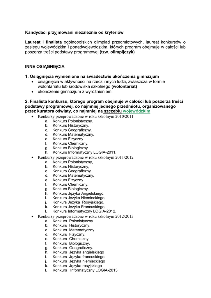 Kandydaci przyjmowani niezależnie od kryteriów Laureat i finalista ogólnopolskich olimpiad przedmiotowych, laureat konkursów o zasięgu wojewódzkim i ponadwojewódzkim, których program obejmuje w całości lub poszerza treści podstawy programowej (tzw. olimpijczyk) INNE OSIĄGNIĘCIA 1. Osiągnięcia wymienione na świadectwie ukończenia gimnazjum osiągnięcia w aktywności na rzecz innych ludzi, zwłaszcza w formie wolontariatu lub środowiska szkolnego (wolontariat) ukończenie gimnazjum z wyróżnieniem. 2. Finalista konkursu, którego program obejmuje w całości lub poszerza treści podstawy programowej, co najmniej jednego przedmiotu, organizowanego przez kuratora oświaty, co najmniej na szczeblu wojewódzkim Konkursy przeprowadzone w roku szkolnym 2010/2011 a. b. c. d. e. f. g. h. Konkurs Polonistyczny. Konkurs Historyczny. Konkurs Geograficzny. Konkurs Matematyczny. Konkurs Fizyczny. Konkurs Chemiczny. Konkurs Biologiczny. Konkurs Informatyczny LOGIA-2011. Konkursy przeprowadzone w roku szkolnym 2011/2012 a. b. c d. e. f. g. h. i. j. k. l. Konkurs Polonistyczny, Konkurs Historyczny, Konkurs Geograficzny. Konkurs Matematyczny, Konkurs Fizyczny. Konkurs Chemiczny. Konkurs Biologiczny. Konkurs Języka Angielskiego, Konkurs Języka Niemieckiego, Konkurs Języka Rosyjskiego, Konkurs Języka Francuskiego, Konkurs Informatyczny LOGIA-2012. Konkursy przeprowadzone w roku szkolnym 2012/2013 a. b. c. d. e. f. g. h. i. j. k. l. Konkurs Konkurs Konkurs Konkurs Konkurs Konkurs Konkurs Konkurs Konkurs Konkurs Konkurs Konkurs Polonistyczny. Historyczny. Matematyczny. Fizyczny. Chemiczny. Biologiczny. Geograficzny. Języka angielskiego Języka francuskiego Języka niemieckiego Języka rosyjskiego Informatyczny LOGIA-2013 m. Konkurs wiedzy o społeczeństwie (Wiedzy Obywatelskiej i Ekonomicznej). 3. Laureat, finalista innych konkursów organizowanych przez kuratora oświaty Konkursy tematyczne przeprowadzone w roku szkolnym 2010/2011 a. b. c. d. e. Konkurs Wiedzy Obywatelskiej i Ekonomicznej. Gimnazjalny Konkurs Wiedzy Biblijnej „HIERONIMUS” Ogólnopolski Konkurs Papieski Ogólnopolski Konkurs języka niemieckiego Ogólnopolski Konkurs Historyczny pod patronatem Ministra Edukacji ,Narodowej, Ministra Obrony Narodowej, Kierownika Urzędu ds. Kombatantów i Osób Represjonowanych „Losy żołnierza i dzieje oręża polskiego f. Konkurs Prymasa Tysiąclecia g. Konkurs z historii Polski „ W kalejdoskopie pamięci Polska i Polacy h. w latach 1939 – 1989. Autorytety w czasach trudnych Konkursy interdyscyplinarne zorganizowane przez MKO w roku 2010/2011 a. Konkurs Kultury Klasycznej. b. Konkurs Filozoficzny „W drodze ku mądrości”. Konkursy tematyczne przeprowadzone w roku szkolnym 2011/2012 a. Konkurs Wiedzy Obywatelskiej i Ekonomicznej. b. Gimnazjalny Konkurs Wiedzy Biblijnej „HIERONIMUS”. c. Konkurs pod patronatem Ministra Edukacji Narodowej, Ministra Obrony Narodowej, Kierownika Urzędu ds. Kombatantów i Osób Represjonowanych „Losy żołnierza i dzieje oręża polskiego d. Mazowiecki Konkurs Papieski „Papież Słowianin”, e. Konkurs Prymasa Tysiąclecia. Konkursy interdyscyplinarne zorganizowane przez MKO w roku szkolnym 2011/2012. a. Konkurs Kultury Klasycznej. b. Konkurs Filozoficzny „ W drodze ku mądrości” c. Wokół odkryć naukowych polskiej noblistki Marii Skłodowskiej - Curie Konkursy tematyczne przeprowadzone w roku szkolnym 2012/2013: a. Konkurs Wiedzy Obywatelskiej i Ekonomicznej. b. Gimnazjalny Konkurs Wiedzy Biblijnej „HIERONIMUS” c. Ogólnopolski Konkurs Papieski „ Jan Paweł II – droga poety i artysty ” d. Konkurs Prymasa Tysiąclecia „Być jak …? Nowych ludzi plemię” e. Konkurs pod patronatem Ministra Edukacji Narodowej, Ministra Obrony Narodowej, Kierownika Urzędu ds. Kombatantów i Osób Represjonowanych „Losy żołnierza i dzieje oręża polskiego f. Ogólnopolska Olimpiada „Myśli Jana Pawła II” ( Kurator Podlaski porozumienie) Konkursy interdyscyplinarne zorganizowane przez MKO w roku szkolnym 2012/2013 a. VIII Konkurs Kultury Klasycznej. b. Konkurs Filozoficzny „ W drodze ku mądrości”. c. „Bądź sobą – szukaj własnej drogi - Janusz Korczak”. 4. Finalista Olimpiady dla Gimnazjalistów: lata 2010/2011, 2011/2012, 2012/2013 1.Olimpiada Matematyczna Gimnazjalistów 2. Olimpiada Informatyczna Gimnazjalistów 3. Olimpiada Języka Angielskiego dla Gimnazjalistów Finalista konkursu przedmiotowego, laureat lub finalista innego konkursu organizowanego przez kuratora oświaty innego niż mazowiecki. 5. OSIĄGNIĘCIA SPORTOWE Uzyskanie wysokiego miejsca – nagrodzonego lub uhonorowanego zwycięskim tytułem - w zawodach sportowych organizowanych przez kuratora oświaty albo przez inne podmioty działające na terenie szkół, co najmniej na szczeblu wojewódzkim lub ogólnopolskim: 1. Akrobatyka sportowa 2. Badminton 3. Biathlon, Biathlon letni 4. Bieg na orientację, Bieg przełajowy 5. Boks 6. Bowling sportowy 7. Brydż. Sportowy 8. Gimnastyka artystyczna, Gimnastyka sportowa 9. Golf 10. Jeździectwo 11. Judo 12. Kajakarstwo 13. Karate tradycyjne, Karate WKF 14. Kolarstwo szosowe, Kolarstwo torowe 15. Kręglarstwo 16. Lekkoatletyka 17. Łucznictwo 18. Łyżwiarstwo figurowe, Łyżwiarstwo szybkie, 19. Łyżwiarstwo szybkie - short track 20. Modelarstwo kosmiczne, Modelarstwo lotnicze 21. Narciarstwo alpejskie, Narciarstwo klasyczne - biegi, skoki, kombinacja norweska 22. Pięciobój nowoczesny 23. Pływanie, Pływanie synchroniczne 24. Podnoszenie ciężarów 25. Saneczkarstwo 26. Skoki do wody 27. Snowboard 28. Sport kartingowy 29. Strzelectwo sportowe 30. Szachy 31. Szermierka 32. Sport psich zaprzęgów 33. Taekwondo ITF, Taekwondo W AF 34. Taniec sportowy 35. Tenis, Tenis stołowy 36. Triatlon 37. Wioślarstwo 38. Wspinaczka sportowa 39. Zapasy - styl klasyczny, Zapasy - styl wolny 40. Żeglarstwo, Żeglarstwo lodowe 1. Baseball 2. Hokej na lodzie 3. Hokej na trawie 4. Kajak polo 5. Koszykówka, Piłk