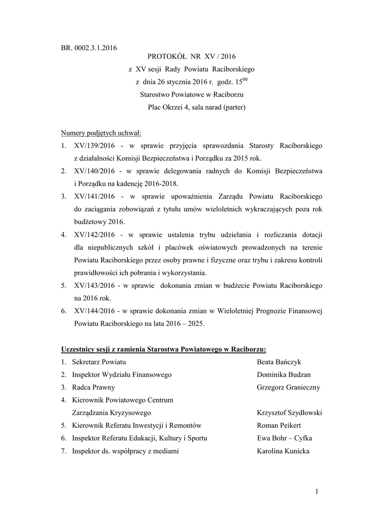 BR. 0002.3.1.2016 PROTOKÓŁ NR XV / 2016 z XV sesji Rady Powiatu Raciborskiego z dnia 26 stycznia 2016 r. godz. 1500 Starostwo Powiatowe w Raciborzu Plac Okrzei 4, sala narad (parter) Numery podjętych uchwał: 1. XV/139/2016 - w sprawie przyjęcia sprawozdania Starosty Raciborskiego z działalności Komisji Bezpieczeństwa i Porządku za 2015 rok. 2. XV/140/2016 - w sprawie delegowania radnych do Komisji Bezpieczeństwa i Porządku na kadencję 2016-2018. 3. XV/141/2016 - w sprawie upoważnienia Zarządu Powiatu Raciborskiego do zaciągania zobowiązań z tytułu umów wieloletnich wykraczających poza rok budżetowy 2016. 4. XV/142/2016 - w sprawie ustalenia trybu udzielania i rozliczania dotacji dla niepublicznych szkół i placówek oświatowych prowadzonych na terenie Powiatu Raciborskiego przez osoby prawne i fizyczne oraz trybu i zakresu kontroli prawidłowości ich pobrania i wykorzystania. 5. XV/143/2016 - w sprawie dokonania zmian w budżecie Powiatu Raciborskiego na 2016 rok. 6. XV/144/2016 - w sprawie dokonania zmian w Wieloletniej Prognozie Finansowej Powiatu Raciborskiego na lata 2016 – 2025. Uczestnicy sesji z ramienia Starostwa Powiatowego w Raciborzu: 1. Sekretarz Powiatu Beata Bańczyk 2. Inspektor Wydziału Finansowego Dominika Budzan 3. Radca Prawny Grzegorz Granieczny 4. Kierownik Powiatowego Centrum Zarządzania Kryzysowego Krzysztof Szydłowski 5. Kierownik Referatu Inwestycji i Remontów Roman Peikert 6. Inspektor Referatu Edukacji, Kultury i Sportu Ewa Bohr – Cyfka 7. Inspektor ds. współpracy z mediami Karolina Kunicka 1 Porządek obrad: 1. Otwarcie sesji i stwierdzenie prawomocności obrad. 2. Informacja o porządku obrad. 3. Przyjęcie protokołu z XIV sesji Rady Powiatu Raciborskiego. 4. Wybór Komisji Uchwał i Wniosków. 5. Sprawozdania z pracy komisji stałych Rady Powiatu Raciborskiego. 6. Informacja Starosty o pracach Zarządu Powiatu między sesjami, w tym realizacja uchwał i wniosków Rady Powiatu. 7. Podjęcie uchwały Rady Powiatu Raciborskiego w sprawie przyjęcia sprawozdania Starosty Raciborskiego z działalności Komisji Bezpieczeństwa i Porządku za 2015 rok. 8. Podjęcie uchwały Rady Powiatu Raciborskiego w sprawie delegowania radnych do Komisji Bezpieczeństwa i Porządku na kadencję 2016-2018. 9. Podjęcie uchwały Rady Powiatu Raciborskiego w sprawie upoważnienia Zarządu Powiatu Raciborskiego do zaciągania zobowiązań z tytułu umów wieloletnich wykraczających poza rok budżetowy 2016. 10. Podjęcie uchwały Rady Powiatu Raciborskiego w sprawie ustalenia trybu udzielania i rozliczania dotacji dla niepublicznych szkół i placówek oświatowych prowadzonych na terenie Powiatu Raciborskiego przez osoby prawne i fizyczne oraz trybu i zakresu kontroli prawidłowości ich pobrania i wykorzystania. 11. Interpelacje i zapytania radnych. 12. Odpowiedzi na interpelacje i zapytania radnych. 13. Wystąpienie Komisji Uchwał i Wniosków. 14. Wolne wnioski i informacje. 15. Zakończenie sesji. Streszczenie przebiegu obrad: Ad1. Otwarcie sesji i stwierdzenie prawomocności obrad. Przewodniczący Rady Powiatu Raciborskiego Adam Wajda o godz. 15:00 otworzył obrady XV sesji Rady Powiatu Raciborskiego. Na podstawie listy obecności stwierdził, iż na sali obecnych było 22 radnych, co stanowiło quorum do prowadzenia obrad i podejmowania prawomocnych uchwał. 2 Przewodniczący rady A. Wajda przywitał radnych, przedstawicieli mediów oraz zaproszonych gości. Lista obecności radnych stanowi załącznik nr 1, usprawiedliwienie radnego Łukasza Kocura z sesji rady stanowi załącznik nr 2, zaś lista zaproszonych gości stanowi załącznik nr 3. Zgodnie z zapisem § 31 Statutu Powiatu Raciborskiego, przyjętego Uchwałą Nr XXIII/238/2012 Rady Powiatu Raciborskiego z dnia 30 października 2012 r. w sprawie uchwalenia Statutu Powiatu Raciborskiego (z późn. zm.), zawiadomienie o terminie i porządku obrad sesji Rady Powiatu Raciborskiego w dniu 26 stycznia 2016 r. zostało podane do publicznej wiadomości. W/w zawiadomienie stanowi załącznik nr 4 do niniejszego protokołu. Ad2. Informacja o porządku obrad. Przewodniczący rady A. Wajda odczytał pismo: 1. OR. II. 0022.3.1.2016 z dnia 26.01.2016 r. w sprawie wprowadzenia na sesję: 1. nowej wersji projektu uchwały w sprawie dokonania zmian w budżecie Powiatu Raciborskiego na 2016 rok. Projekt uchwały został przyjęty bez uwag. 2. nowej wersji projektu uchwały w sprawie dokonania zmian w Wieloletniej Prognozie Finansowej Powiatu Raciborskiego na lata 2016 – 2025. Projekt uchwały został przyjęty bez uwag. Przewodniczący rady A. Wajda zapytał, czy są inne propozycje do porządku obrad dzisiejszej sesji? W związku z brakiem zgłoszeń, przewodniczący rady A. Wajda poprosił o przegłosowanie porządku obrad sesji w proponowanej wersji? Porządek obrad został przyjęty 22 głosami za. Ad3. Przyjęcie protokołu z XIV sesji Rady Powiatu Raciborskiego. Przewodniczący rady A. Wajda przekazał, iż protokół z XIV sesji został wyłożony do wglądu w Biurze Rady. W związku z tym zapytał, czy są uwagi do protokołu? 3 W związku z brakiem uwag, przewodniczący rady A. Wajda poprosił o przegłosowanie protokołu. Protokół został przyjęty 21 głosami za, 1 głosem wstrzymującym się i 0 głosami przeciw. Ad4. Wybór Komisji Uchwał i Wniosków. Przewodniczący rady A. Wajda zaproponował do składu Komisji Uchwał i Wniosków następujących radnych: Artura Wierzbickiego, Katarzynę Dutkiewicz i Adriana Plurę. Przewodniczący rady A. Wajda zapytał każdego z radnych, czy wyrażają zgodę udziału w pracach Komisji. W/w radni wyrazili zgodę. Przewodniczący rady A. Wajda poddał pod głosowanie zaproponowany skład Komisji Uchwał i Wniosków Skład Komisji Uchwał i Wniosków został przyjęty 20 głosami za i 2 głosami wstrzymującymi się. Przewodniczący rady A. Wajda poprosił Komisję Uchwał i Wniosków o wybór ze swego grona przewodniczącego. Na stanowisko Prze