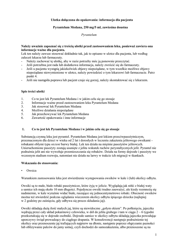 Ulotka dołączona do opakowania: informacja dla pacjenta Pyrantelum Medana, 250 mg/5 ml, zawiesina doustna Pyrantelum Należy uważnie zapoznać się z treścią ulotki przed zastosowaniem leku, ponieważ zawiera ona informacje ważne dla pacjenta. Lek ten należy zawsze stosować dokładnie tak, jak to opisano w ulotce dla pacjenta, lub według zaleceń lekarza lub farmaceuty. - Należy zachować tę ulotkę, aby w razie potrzeby móc ją ponownie przeczytać. - Jeśli potrzebna jest rada lub dodatkowa informacja, należy zwrócić się do farmaceuty. - Jeśli u pacjenta wystąpią jakiekolwiek objawy niepożądane, w tym wszelkie możliwe objawy niepożądane niewymienione w ulotce, należy powiedzieć o tym lekarzowi lub farmaceucie. Patrz punkt 4. - Jeśli nie nastąpiła poprawa lub pacjent czuje się gorzej, należy skontaktować się z lekarzem. Spis treści ulotki 1. 2. 3. 4. 5. 6. Co to jest lek Pyrantelum Medana i w jakim celu się go stosuje Informacje ważne przed zastosowaniem leku Pyrantelum Medana Jak stosować lek Pyrantelum Medana Możliwe działania niepożądane Jak przechowywać lek Pyrantelum Medana Zawartość opakowania i inne informacje 1. Co to jest lek Pyrantelum Medana i w jakim celu się go stosuje Substancją czynną leku jest pyrantel. Pyrantelum Medana jest lekiem przeciwpasożytniczym, przeznaczonym dla dzieci w wieku od 2 lat i dorosłych w leczeniu zakażenia jelitowego owsikami robakami obłymi typu nicieni barwy białej. Lek ten działa na mięśnie pasożytów jelitowych. Unieruchomione pasożyty zostają usunięte z jelita wskutek ruchów perystaltycznych jelit. Pyrantel nie podrażnia jelit ani nie wywołuje przemieszczania się robaków. Działa na formy dojrzałe i pasożyty we wczesnym stadium rozwoju, natomiast nie działa na larwy w trakcie ich migracji w tkankach. Wskazania do stosowania: • Owsica Warunkiem zastosowania leku jest stwierdzenie występowania owsików w kale i (lub) okolicy odbytu. Owsiki są to małe, białe robaki pasożytnicze, które żyją w jelicie. Wyglądają jak nitki z białej waty a samice ich mają około 10 mm długości. Pojedyncze owsiki trudno zauważyć, ale kiedy rozmnożą się nadmiernie, w kale wyraźnie widać białe, ruszające się jednocentymetrowe robaki. Obecność owsików można też stwierdzić podczas oglądania wieczorem okolicy odbytu śpiącego dziecka (najlepiej w 2 godziny po zaśnięciu, gdy odbywa się proces składania jaj). Owsiki składają dużą ilość małych jaj, które są niewidoczne „gołym okiem”. Po połknięciu, jajeczka wędrują przez cały układ pokarmowy człowieka, w dół do jelita grubego i tam w ciągu 2 – 6 tygodni przekształcają się w dojrzałe osobniki. Dojrzałe samice w okolicy odbytu składają jajeczka powodując uporczywy świąd prowadzący do ciągłego drapania. W konsekwencji następuje podrażnienie tej okolicy oraz przenoszenie jaj trafiających najpierw na dłonie, następnie poprzez obgryzanie paznokci lub oblizywanie palców do jamy ustnej, czyli dochodzi do samozakażenia, albo przenoszone są na 1 pozostałe osoby w rodzinie poprzez kontakt bezpośredni lub pośredni np. ręczniki, pościel, zabawki, meble. Objawy wystąpienia owsicy obserwuje się głównie u dzieci. Choroba występuje jednak w każdym wieku, choć bardzo często dzieci są jej głównymi nosicielami (pasożytami można się zarazić np. w żłobkach, przedszkolach, piaskownicy). Jeśli dziecko ma owsiki bardzo łatwo dochodzi do zakażenia pozostałych osób w rodzinie wspólnie mieszkających. Owsica objawia się silnym uczuciem swędzenia w okolicy odbytu (nie występuje u wszystkich zakażonych), przeważnie w nocy co wywołuje często stany zapalne. U dzieci zarażonych owsikami może występować rozdrażnienie, nerwowość, bezsenność, moczenie nocne lub bóle brzucha i brak apetytu. U dziewczynek dochodzi nieraz do zapalenia sromu i pochwy, co objawia się swędzeniem, pieczeniem i białymi upławami. W takich przypadkach należy skontaktować się z lekarzem. Bardzo ważne jest utrzymanie odpowiedniej higieny, zwłaszcza osobistej w celu zapobiegania samozakażeniu lub przenoszeniu zakażenia na inne osoby. Wymienione poniżej zasady należy stosować przez min. 6 tygodni po zakończeniu leczenia. Zapobieganie owsicy to przede wszystkim: • • • • • • • • • dokładne i częste mycie rąk przed każdym przygotowaniem lub spożyciem posiłku, po wyjściu z toalety, po dotykaniu okolicy odbytu dokładne mycie jarzyn i owoców przed spożyciem obcinanie krótko paznokci u dzieci oraz zakazywanie obgryzania paznokci lub oblizywania palców częsta, regularna zmiana bielizny (w tym bielizny osobistej oraz pościeli) pranie oraz prasowanie bielizny osobistej i pościeli w wysokich temperaturach częste sprzątanie pomieszczeń w domu zwłaszcza sypialni i łazienki (jaja owsików w warunkach domowych mogą przeżyć do kilku tygodni, zwłaszcza przy zachowaniu odpowiedniej wilgotności i ciepłoty) w przypadku dzieci unikanie zabaw w brudnej piaskownicy codzienna poranna higiena okolic odbytu zakładanie piżamy, bielizny a u małych dzieci pieluchy przed snem. Ważne jest, aby w przypadku zakażenia pasożytami, wzmożonej higieny osobistej przestrzegała cała rodzina chorego. Biorąc pod uwagę częste zbiorowe występowanie owsicy, leczenie należy prowadzić jednocześnie u wszystkich mieszkających wspólnie osób i powinno być ono powtórzone. W przypadku podejrzenia ponownego zakażenia należy skontaktować się z lekarzem. 2. Informacje ważne przed zastosowaniem leku Pyrantelum Medana Kiedy nie stosować leku Pyrantelum Medana • Jeśli pacjent ma uczulenie na pyrantel lub którykolwiek z pozostałych składników tego leku (wymienionych w punkcie 6). • Jeśli pacjent przyjmuje piperazynę. • Jeśli pacjent jest w trakcie leczenia miastenii (choroba mięśni szkieletowych). Ostrzeżenia i środki ostrożności Przed rozpoczęciem stoso
