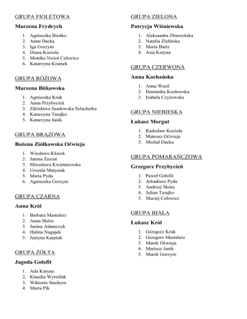 GRUPA FIOLETOWA GRUPA ZIELONA Marzena Frydrych Patrycja Wiśniewska 1. 2. 3. 4. 5. 6. Agnieszka Bieńko Anna Dacka Iga Gorzym Diana Kuzioła Monika Nizioł Celewicz Katarzyna Kramek GRUPA RÓŻOWA Marzena Bitkowska 1. 2. 3. 4. 5. Agnieszka Kruk Anna Przybycień Zdzisława Szadowska Szlachetka Katarzyna Tarajko Katarzyna Janik GRUPA BRĄZOWA Bożena Ziółkowska Oćwieja 1. 2. 3. 4. 5. 6. Wiesława Klocek Janina Żeszut Mirosława Kwietniewska Urszula Matysiak Maria Pyda Agnieszka Gorzym GRUPA CZARNA 1. 2. 3. 4. Aleksandra Zburzyńska Natalia Zielińska Marta Bartz Asia Kutyna GRUPA CZERWONA Anna Kochańska 1. Anna Wasil 2. Dominika Kozłowska 3. Izabela Czyżewska GRUPA NIEBIESKA Łukasz Morgut 1. Radosław Kuzioła 2. Mateusz Oćwieja 3. Michał Dacka GRUPA POMARAŃCZOWA Grzegorz Przybycień 1. 2. 3. 4. 5. Paweł Gołofit Arkadiusz Pyda Andrzej Skóra Julian Tarajko Maciej Celewicz Anna Król 1. 2. 3. 4. 5. Barbara Mastalerz Anna Skóra Janina Adamczyk Halina Nagajek Justyna Karpiuk GRUPA ŻÓŁTA Jagoda Gołofit 1. 2. 3. 4. Ada Kutyna Klaudia Wyroślak Wiktoria Stachyra Marta Pik GRUPA BIAŁA Łukasz Król 1. 2. 3. 4. 5. Grzegorz Kruk Grzegorz Mastalerz Marek Oćwieja Mariusz Janik Marek Gorzym