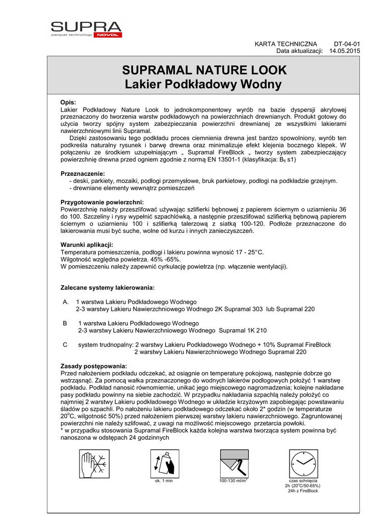 KARTA TECHNICZNA DT-04-01 Data aktualizacji: 14.05.2015 SUPRAMAL NATURE LOOK Lakier Podkładowy Wodny Opis: Lakier Podkładowy Nature Look to jednokomponentowy wyrób na bazie dyspersji akrylowej przeznaczony do tworzenia warstw podkładowych na powierzchniach drewnianych. Produkt gotowy do użycia tworzy spójny system zabezpieczania powierzchni drewnianej ze wszystkimi lakierami nawierzchniowymi linii Supramal. Dzięki zastosowaniu tego podkładu proces ciemnienia drewna jest bardzo spowolniony, wyrób ten podkreśla naturalny rysunek i barwę drewna oraz minimalizuje efekt klejenia bocznego klepek. W połączeniu ze środkiem uzupełniającym „ Supramal FireBlock „ tworzy system zabezpieczający powierzchnię drewna przed ogniem zgodnie z normą EN 13501-1 (klasyfikacja: Bfl s1) Przeznaczenie: - deski, parkiety, mozaiki, podłogi przemysłowe, bruk parkietowy, podłogi na podkładzie grzejnym. - drewniane elementy wewnątrz pomieszczeń Przygotowanie powierzchni: Powierzchnię należy przeszlifować używając szlifierki bębnowej z papierem ściernym o uziarnieniu 36 do 100. Szczeliny i rysy wypełnić szpachlówką, a następnie przeszlifować szlifierką bębnową papierem ściernym o uziarnieniu 100 i szlifierką talerzową z siatką 100-120. Podłoże przeznaczone do lakierowania musi być suche, wolne od kurzu i innych zanieczyszczeń. Warunki aplikacji: Temperatura pomieszczenia, podłogi i lakieru powinna wynosić 17 - 25° C. Wilgotność względna powietrza. 45% -65%. W pomieszczeniu należy zapewnić cyrkulację powietrza (np. włączenie wentylacji). Zalecane systemy lakierowania: A. 1 warstwa Lakieru Podkładowego Wodnego 2-3 warstwy Lakieru Nawierzchniowego Wodnego 2K Supramal 303 lub Supramal 220 B 1 warstwa Lakieru Podkładowego Wodnego 2-3 warstwy Lakieru Nawierzchniowego Wodnego Supramal 1K 210 C system trudnopalny: 2 warstwy Lakieru Podkładowego Wodnego + 10% Supramal FireBlock 2 warstwy Lakieru Nawierzchniowego Wodnego Supramal 220 Zasady postępowania: Przed nałożeniem podkładu odczekać, aż osiągnie on temperaturę pokojową, następnie dobrze go wstrząsnąć. Za pomocą wałka przeznaczonego do wodnych lakierów podłogowych położyć 1 warstwę podkładu. Podkład nanosić równomiernie, unikać jego miejscowego nagromadzenia; kolejne nakładane pasy podkładu powinny na siebie zachodzić. W przypadku nakładania szpachlą należy położyć co najmniej 2 warstwy Lakieru podkładowego Wodnego w układzie krzyżowym zapobiegając powstawaniu śladów po szpachli. Po nałożeniu lakieru podkładowego odczekać około 2* godzin (w temperaturze o 20 C, wilgotność 50%) przed nałożeniem pierwszej warstwy lakieru nawierzchniowego. Zagruntowanej powierzchni nie należy szlifować, z uwagi na możliwość miejscowego przetarcia powłoki. * w przypadku stosowania Supramal FireBlock każda kolejna warstwa tworząca system powinna być nanoszona w odstępach 24 godzinnych ok. 1 min 100-130 ml/m 2 czas schnięcia o 2h (20 C/50-65%) 24h z FireBlock Strona 1/2 KARTA TECHNICZNA DT-04-01 Data aktualizacji: 14.05.2015 Czas schnięcia: Około 2 godzin w temperaturze pokojowej (20°C) i wi lgotności powietrza ok. 50%. Około 24 godzin przy zastosowaniu Supramal FireBlock. Kolor: - w opakowaniu: mleczno biały - po aplikacji: bezbarwny, przezroczysty Zapach: - Delikatny, słabo wyczuwalny Wydajność: Przy użyciu wałka (1 warstwa): Zużycie 2 100-130 ml/m Wydajność z litra 2 8-10 m Zawartość lotnych związków organicznych: VOC II/A/i limit* = 140g/l VOC < 105g/l *dla mieszaniny gotowej do aplikacji zgodnie z Dyrektywą UE 2004/42/CE Sposoby aplikacji: Wałek do wodnych lakierów podłogowych. Nie zaleca się wylewania lakieru bezpośrednio na drewno (stosować wiadra lub kuwety do lakierów). Czyszczenie narzędzi: Czyścić wodą bezpośrednio po użyciu. Okres i warunki przechowywania: 12 miesięcy od daty produkcji w temperaturze powyżej 5°C. Przepisy BHP: Podane w Karcie Charakterystyki dla danego wyrobu. Opakowanie: Kanister 5L wykonany z tworzywa sztucznego. Pojemnik 1L wykonany z tworzywa sztucznego. Inne informacje: Efektywność naszych systemów jest wynikiem badań laboratoryjnych oraz wieloletniego doświadczenia. Dane zawarte w niniejszym materiale są zgodne z aktualnym stanem wiedzy o naszych produktach i możliwościach ich stosowania. Gwarantujemy wysoką jakość pod warunkiem, że są spełnione nasze instrukcje i że praca jest wykonana zgodnie z zasadami dobrego rzemiosła. Konieczne jest wykonanie próbnego zastosowania produktu ze względu na potencjalnie różne zachowanie się wyrobu z różnymi materiałami. Nie ponosimy odpowiedzialności jeżeli na końcowy rezultat pracy miały wpływ czynniki znajdujące się poza naszą kontrolą. Strona 2/2