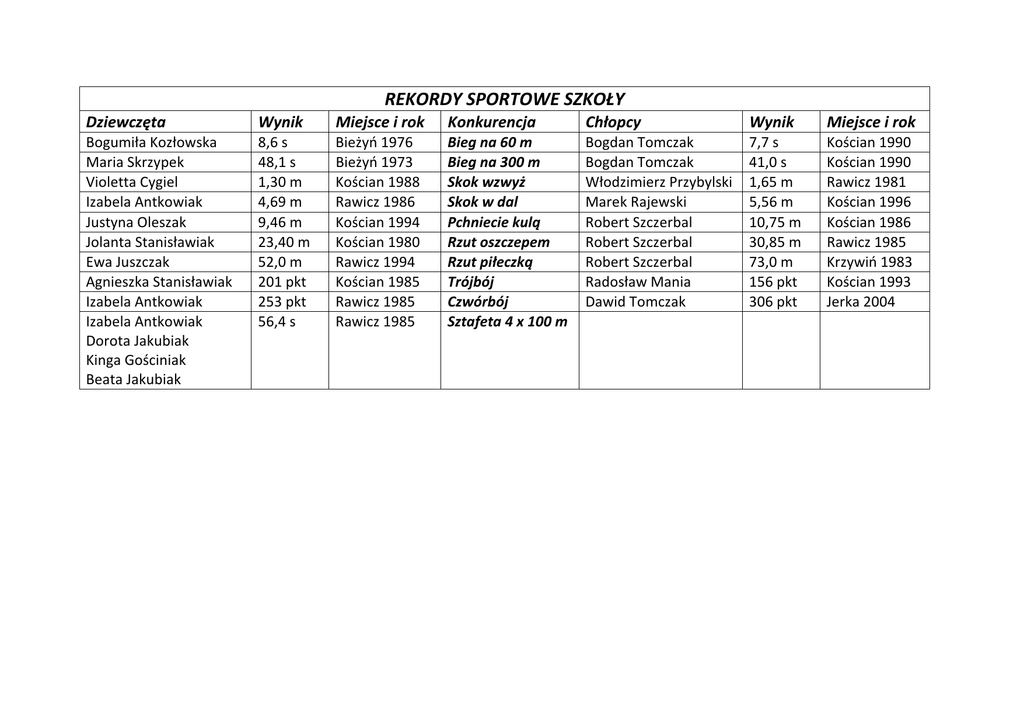 REKORDY SPORTOWE SZKOŁY Dziewczęta Wynik Miejsce i rok Konkurencja Chłopcy Wynik Miejsce i rok Bogumiła Kozłowska Maria Skrzypek Violetta Cygiel Izabela Antkowiak Justyna Oleszak Jolanta Stanisławiak Ewa Juszczak Agnieszka Stanisławiak Izabela Antkowiak Izabela Antkowiak Dorota Jakubiak Kinga Gościniak Beata Jakubiak 8,6 s 48,1 s 1,30 m 4,69 m 9,46 m 23,40 m 52,0 m 201 pkt 253 pkt 56,4 s Bieżyń 1976 Bieżyń 1973 Kościan 1988 Rawicz 1986 Kościan 1994 Kościan 1980 Rawicz 1994 Kościan 1985 Rawicz 1985 Rawicz 1985 Bieg na 60 m Bieg na 300 m Skok wzwyż Skok w dal Pchniecie kulą Rzut oszczepem Rzut piłeczką Trójbój Czwórbój Sztafeta 4 x 100 m Bogdan Tomczak Bogdan Tomczak Włodzimierz Przybylski Marek Rajewski Robert Szczerbal Robert Szczerbal Robert Szczerbal Radosław Mania Dawid Tomczak 7,7 s 41,0 s 1,65 m 5,56 m 10,75 m 30,85 m 73,0 m 156 pkt 306 pkt Kościan 1990 Kościan 1990 Rawicz 1981 Kościan 1996 Kościan 1986 Rawicz 1985 Krzywiń 1983 Kościan 1993 Jerka 2004