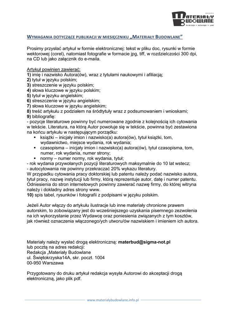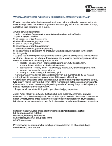 WYMAGANIA DOTYCZĄCE PUBLIKACJI W MIESIĘCZNIKU „MATERIAŁY BUDOWLANE” Prosimy przysłać artykuł w formie elektronicznej: tekst w pliku doc, rysunki w formie wektorowej (corel), natomiast fotografie w formacie jpg, tiff, w rozdzielczości 300 dpi, na CD lub jako załącznik do e-maila. Artykuł powinien zawierać: 1) imię i nazwisko Autora(ów), wraz z tytułami naukowymi i afiliacją; 2) tytuł w języku polskim; 3) streszczenie w języku polskim; 4) słowa kluczowe w języku polskim; 5) tytuł w języku angielskim; 6) streszczenie w języku angielskim; 7) słowa kluczowe w języku angielskim; 8) treść artykułu z podziałem na śródtytuły wraz z podsumowaniem i wnioskami; 9) bibliografię: - pozycje literaturowe powinny być numerowane zgodnie z kolejnością ich cytowania w tekście. Literatura, na którą Autor powołuje się w tekście, powinna być zestawiona na końcu artykułu w następującym porządku: książki – inicjały imion i nazwisko(a) autora(ów), tytuł książki, tom, wydawnictwo, miejsce wydania, rok wydania; czasopisma – inicjały imion i nazwisko(a) autora(ów), tytuł czasopisma, tom, numer, rok wydania, numer strony; normy – numer normy, rok wydania, tytuł; - rok wydania przywołanych pozycji literaturowych maksymalnie do 10 lat wstecz; - autocytowania nie powinny przekraczać 20% wykazu literatury. W przypadku cytowania pracy doktorskiej lub patentu należy podać nazwisko autora, tytuł pracy, nazwę instytucji lub firmy, którą reprezentuje autor, datę i numer patentu. Odniesienia do stron internetowych powinny zawierać nazwę firmy, do której witryna należy i dokładny adres strony www. 10) spis tabel, rysunków i fotografii z podpisami w języku polskim. Jeżeli Autor włączy do artykułu ilustracje lub inne materiały chronione prawem autorskim, to zobowiązany jest do wcześniejszego uzyskania pisemnego zezwolenia na ich wykorzystanie przez Wydawcę oraz poniesienia związanych z tym kosztów, jak również oznaczenia włączonego/ych utworu/ów nazwiskiem i imieniem ich autora. Materiały należy wysłać drogą elektroniczną: [email protected] lub pocztą na adres redakcji: Redakcja „Materiały Budowlane ul. Świętokrzyska14A, skr. poczt. 1004 00-950 Warszawa Przygotowany do druku artykuł redakcja wysyła Autorowi do akceptacji drogą elektroniczną, jako plik pdf. www.materialybudowlane.info.pl