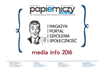 media info 2016 DYREKTOR REDAKCJI: Beata Łuczyńska @: [email protected] tel. +48 22 32 01 500 REDAKCJA: Jolanta Tokarczyk @: [email protected] tel. +48 22 32 01 500 REKLAMA: Katarzyna Ankikiel @: [email protected] tel. +48 606 275 424 PRENUMERATA: Małgorzata Szczepanek @: [email protected] tel. +48 22 32 01 511 papierniczyswiat.pl O MAGAZYNIE • Papierniczy Świat to wiodący magazyn dla profesjonalistów z branży: papierniczej, biurowej, szkolnej, artykułów kreatywnych i specjalistycznych oraz upominkowej i dekoracyjnej. • To idealna platforma nawiązywania owocnej współpracy, pozyskania partnerów biznesowych oraz nowych klientów w Polsce i za granicą. • Każde wydanie to duża porcja informacji o trendach, hitach sprzedaży. Nasi eksperci analizują co się dzieje na rynku, podpowiadają jak prowadzić biznes, aby przynosił zyski. HARMONOGRAM NR DATA PUBLIKACJI TERMIN ZAMÓWIEŃ TERMIN NADSYŁANIA MATERIAŁÓW 1/16 26.01.2016 11.01.2016 18.01.2016 • Art. na biurko • Zszywacze, dziurkacze, rozszywacze • Art. eksploatacyjne 2/16 10.03.2016 26.02.2016 03.03.2016 • Akcesoria komputerowe i urządzeń mobilnych • Art. stemplarskie • Dekoracje i upominki • Druki akcydensowe • Środki czystości 3/16 15.04.2016 31.03.2016 04.04.2016 • Art. biurowe • Automatyka biurowa • DODATEK: Back-to-School 4/16 10.06.2016 30.05.2016 24.05.2016 • Art. dla uczniów i studentów • Nowoczesna szkoła CZYTELNICY Magazyn adresowany jest do: • kupców z sieci detalicznych • hurtowni • biuroserwisów • sklepów papierniczych, z art. upominkowycmi i dekoracyjnymi oraz wielobranżowe • sklepów dla plastyków • księgarni • sklepów wyspoażenia biur • sklepów e-commerce DYSTRYBUCJA Papierniczy Świat jest dystrybuowany poprzez następujace kanaly: • prenumerata i sprzedaż egzemplarzowa • dystrybucja promocyjna poprzez hurtownie papiernicze • bezpłatna dystrybucja na targach w kraju i za granicą • bezpłatna dystrybucja na imprezach branżowych i kontraktacjach • imienna promocyjna wysyłka do profesjonalistów TEMATY GŁÓWNE 5/16 29.07.2016 21.07.2016 18.07.2016 • • • • • Art. piśmiennicze Art. pod nadruk Materiały POS Art. kreatywne Automatyka biurowa dla segemntu SoHo Art. specjalistyczne dla plastyków Organizacja czasu Drukarki Produkty do czyszczenia biur Art. BHP 6/16 09.09.2016 29.08.2016 01.09.2016 • • • • • INFORMACJE TECHNICZNE 7/16 14.10.2016 30.09.2016 01.10.2016 Częstotliwość: 8 razy w roku Nakład: 4500 egz. Format: 230x300 mm Portal: papierniczyswiat.pl Społeczność: www.facebook.com/PapierniczySwiat • Papier do druku i biura • Upominki i dekoracje - Boże Narodzenie • Art. konferencyjne i do prezentacji 8/16 09.12.2016 28.11.2016 02.12.2016 • • • • • Przechowywanie i archiwizacja Opakowania i korespondencja Papeteria i karty okolicznościowe Urządzenia multifunkcyjne Upominki i dekoracje - Walentynki papierniczyswiat.pl I okladka 12.10.2015 07:02 Strona I CENY I FORMATY 7/2015 (186) Październik • ISSN 1426-1456 • indeks 346446 • cena 10 ZŁ (w tym 8% VAT) 1/1 230x300 mm 4750 zł 1/2 113x300 mm 230x150 mm 3300 zł 2 x 1/2 460x150 mm 6200 zł 1/3 83x300 mm 230x100 mm 146x150 mm 2650 zł 1/4 60x300 mm 230x75 mm 113x150 mm 1850 zł Artykuł sponsorowany from 2500 zl Moduł (90 x 100 mm) 1000 zł I Okładka (210x300 mm) 9500 zł II Okładka 6500 zł III Okładka 5700 zł IV Okładka 7000 zł INSERTY WYCENA INDYWIDUALNA opcje niestandardowe WYCENA INDYWIDUALNA Platforma sprzedażowa przyszłością branży – rozmowa z Tomaszem Świgostem, prezesem IPBBS Rystor to moje życie! – rozmowa z Ryszardem Stachowiczem PORTAL: PAPIERNICZYSWIAT.PL; MAILINGI XL-banner 956x100 px 60 zł Fullsize 620x100 px 55 zł Button 322x100 px 55 zł Opcje niestandardowe Wpis do moderowanej bazy danych na www.papierniczyswiat.pl Advertorial Mailing ZAPYTAJ NASZ DZIAŁ REKLAMY 100 zł/rok od 50 zł/tydzień 120 zł/ 1000 adresów Powyższe ceny nie zawierają podatku VAT - 23%. W przypadku cen za banery cena została obliczona w oparciu o model CPM (za 1000 odsłon), na życzenie możliwe kalkulacje w innych modelach rozliczeniowych