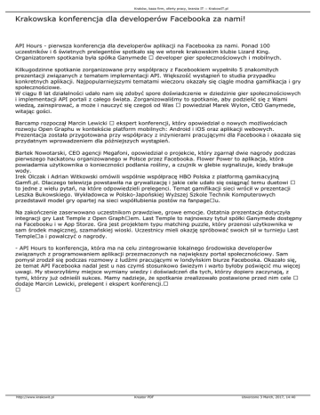 Kraków, baza firm, oferty pracy, branża IT :: KrakowIT.pl Krakowska konferencja dla developerów Facebooka za nami! API Hours - pierwsza konferencja dla developerów aplikacji na Facebooka za nami. Ponad 100 uczestników i 6 świetnych prelegentów spotkało się we wtorek krakowskim klubie Lizard King. Organizatorem spotkania była spółka Ganymede developer gier społecznościowych i mobilnych. Kilkugodzinne spotkanie zorganizowane przy współpracy z Facebookiem wypełniło 5 znakomitych prezentacji związanych z tematem implementacji API. Większość wystąpień to studia przypadku konkretnych aplikacji. Najpopularniejszymi tematami wieczoru okazały się ciągle modna gamifikacja i gry społecznościowe. W ciągu 8 lat działalności udało nam się zdobyć spore doświadczenie w dziedzinie gier społecznościowych i implementacji API portali z całego świata. Zorganizowaliśmy to spotkanie, aby podzielić się z Wami wiedzą, zainspirować, a może i nauczyć się czegoś od Was powiedział Marek Wylon, CEO Ganymede, witając gości. Barcamp rozpoczął Marcin Lewicki ekspert konferencji, który opowiedział o nowych możliwościach rozwoju Open Graphu w kontekście platform mobilnych: Android i iOS oraz aplikacji webowych. Prezentacja została przygotowana przy współpracy z inżynierami pracującymi dla Facebooka i okazała się przydatnym wprowadzeniem dla późniejszych wystąpień. Bartek Nowotarski, CEO agencji Megafoni, opowiedział o projekcie, który zgarnął dwie nagrody podczas pierwszego hackatonu organizowanego w Polsce przez Facebooka. Flower Power to aplikacja, która powiadamia użytkownika o konieczności podlania rośliny, a czujnik w glebie sygnalizuje, kiedy brakuje wody. Irek Olczak i Adrian Witkowski omówili wspólnie współpracę HBO Polska z platformą gamikacyjną Gamfi.pl. Dlaczego telewizja powstawiła na grywalizację i jakie cele udało się osiągnąć temu duetowi to jedne z wielu pytań, na które odpowiedzieli prelegenci. Temat gamifikacji sieci wrócił w prezentacji Leszka Bukowskiego. Wykładowca w Polsko-Japońskiej Wyższej Szkole Technik Komputerowych przedstawił model gry opartej na sieci współlubienia postów na fanpageu. Na zakończenie zaserwowano uczestnikom prawdziwe, growe emocje. Ostatnia prezentacja dotyczyła integracji gry Last Temple z Open Graphem. Last Temple to najnowszy tytuł spółki Ganymede dostępny na Facebooku i w App Storze. Gra jest projektem typu matching puzzle, który przenosi użytkownika w sam środek magicznej, szamańskiej wioski. Uczestnicy mieli okazję spróbować swoich sił w turnieju Last Templea i powalczyć o nagrody. - API Hours to konferencja, która ma na celu zintegrowanie lokalnego środowiska developerów związanych z programowaniem aplikacji przeznaczonych na największy portal społecznościowy. Sam pomysł zrodził się podczas rozmowy z ludźmi pracującymi w londyńskim biurze Facebooka. Okazało się, że temat API Facebooka nadal jest u nas czymś stosunkowo świeżym i warto byłoby poświęcić mu więcej uwagi. My stworzyliśmy miejsce wymiany wiedzy i doświadczeń dla tych, którzy dopiero zaczynają, z tymi, którzy już odnieśli sukces. Mamy nadzieje, że spotkanie zrealizowało postawione przed nim cele dodaje Marcin Lewicki, prelegent i ekspert konferencji. http://www.krakowit.pl Kreator PDF Utworzono 3 March, 2017, 14:40