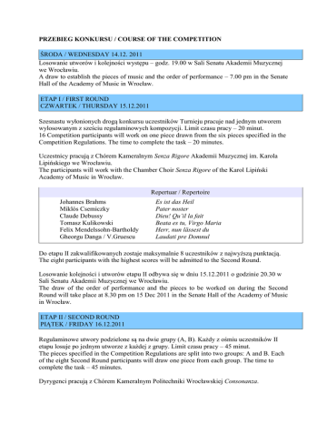 PRZEBIEG KONKURSU / COURSE OF THE COMPETITION ŚRODA / WEDNESDAY 14.12. 2011 Losowanie utworów i kolejności występu – godz. 19.00 w Sali Senatu Akademii Muzycznej we Wrocławiu. A draw to establish the pieces of music and the order of performance – 7.00 pm in the Senate Hall of the Academy of Music in Wrocław. ETAP I / FIRST ROUND CZWARTEK / THURSDAY 15.12.2011 Szesnastu wyłonionych drogą konkursu uczestników Turnieju pracuje nad jednym utworem wylosowanym z sześciu regulaminowych kompozycji. Limit czasu pracy – 20 minut. 16 Competition participants will work on one piece drawn from the six pieces specified in the Competition Regulations. The time to complete the task – 20 minutes. Uczestnicy pracują z Chórem Kameralnym Senza Rigore Akademii Muzycznej im. Karola Lipińskiego we Wrocławiu. The participants will work with the Chamber Choir Senza Rigore of the Karol Lipiński Academy of Music in Wrocław. Repertuar / Repertoire Johannes Brahms Miklós Csemiczky Claude Debussy Tomasz Kulikowski Felix Mendelssohn-Bartholdy Gheorgu Danga / V.Gruescu Es ist das Heil Pater noster Dieu! Qu’il la fait Beata es tu, Virgo Maria Herr, nun lässest du Laudati pre Domnul Do etapu II zakwalifikowanych zostaje maksymalnie 8 uczestników z najwyższą punktacją. The eight participants with the highest scores will be admitted to the Second Round. Losowanie kolejności i utworów etapu II odbywa się w dniu 15.12.2011 o godzinie 20.30 w Sali Senatu Akademii Muzycznej we Wrocławiu. The draw of the order of performance and the pieces to be worked on during the Second Round will take place at 8.30 pm on 15 Dec 2011 in the Senate Hall of the Academy of Music in Wrocław. ETAP II / SECOND ROUND PIĄTEK / FRIDAY 16.12.2011 Regulaminowe utwory podzielone są na dwie grupy (A, B). Każdy z ośmiu uczestników II etapu losuje po jednym utworze z każdej z grupy. Limit czasu pracy – 45 minut. The pieces specified in the Competition Regulations are split into two groups: A and B. Each of the eight Second Round participants will draw one piece from each group. The time to complete the task – 45 minutes. Dyrygenci pracują z Chórem Kameralnym Politechniki Wrocławskiej Consonanza. The participants will work with the Chamber Choir Consonanza of Wrocław University of Technology. Repertuar / Repertoire A Claudio Monteverdi Claudio Monteverdi Claudio Monteverdi A un giro sol de' belli occhi lucenti Volgea l’anima mia soavemente Voi pur da me partite, anima dura B Bartłomiej Pękiel Bartłomiej Pękiel Wacław z Szamotuł Missa pulcherrima: Gloria Missa pulcherrima: Sanctus, Benedictus In te Domine speravi Do etapu III zakwalifikowanych zostaje maksymalnie 4 uczestników posiadających najwyższą punktację stanowiącą sumę punktów z etapów pierwszego i drugiego. The Third Round will have a maximum of four participants with the highest scores, which will be computed by adding the First Round and Second Round scores. Losowanie kolejności i utworów etapu III odbywa się w dniu 16.12.2011 o godzinie 19.30 w Sali Senatu Akademii Muzycznej we Wrocławiu. The draw of the order of performance and the pieces to be worked on during the Third Round will take place at 7.30 pm on 16 Dec 2011 in the Senate Hall of the Academy of Music in Wrocław. ETAP III / THIRD ROUND SOBOTA / SATURDAY 17.12.2011 Regulaminowe utwory podzielone są na trzy grupy (A, B, C). Każdy z czterech finalistów losuje po jednym utworze z każdej z grupy. Limit czasu pracy – 60 minut. The pieces specified in the Competition Regulations are split into three groups: A, B and C. Each of the four Third Round participants will draw one piece from each group. The time to complete the task – 60 minutes. Uczestnicy pracują z Chórem Feichtinum Akademii Muzycznej. The Competition participants with work with the Choir Feichtinum of the Music Academy. Repertuar / Repertoire A Karol Szymanowski Karol Szymanowski Bzicem kunia Panie muzykancie B Marek Jasiński Romuald Twardowski Cantus finalis Preludio e toccata C Andrzej Koszewski Paweł Łukaszewski Danza z cyklu / from the series Canzone e Danza O radix Jesse Laureaci Turnieju występują na uroczystym koncercie finałowym w Sali Muzycznej Oratorium Marianum Uniwersytetu Wrocławskiego w dniu 17.12.2011 o godzinie 20.00. The Competition prizewinners will perform at an official finalists’ concert in the Music Hall Oratorium Marianum of Wrocław University at 8.00 pm on 17 Dec 2011. Na koncercie ma miejsce uroczyste wręczenie nagród i dyplomów oraz oficjalne zakończenie Turnieju. At the concert the prizewinners will receive their awards and diplomas and the Competition will be officially ended.