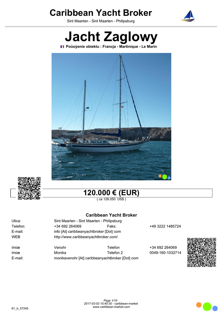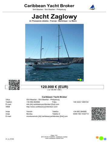 Caribbean Yacht Broker Sint Maarten - Sint Maarten - Philipsburg Jacht Zaglowy Poùoýenie obiektu : Francja - Martinique - Le Marin 120.000 € (EUR) ( ca 126.050 US$ ) Caribbean Yacht Broker Ulica: Telefon: E-mail: WEB Sint Maarten - Sint Maarten - Philipsburg +34 692 264069 Faks: info [At] caribbeanyachtbroker [Dot] com http://www.caribbeanyachtbroker.com/ Imiæ Imiæ E-mail: Venohr Telefon Monika Telefon 2 monikavenohr [At] caribbeanyachtbroker [Dot] com 61_b_57245 Page 1/10 2017-03-03 15:40:30 - caribbean-market www.caribbean-market.com +49 3222 1485724 +34 692 264069 0049-160-1032714 Caribbean Yacht Broker Sint Maarten - Sint Maarten - Philipsburg Typ ùodzi Numer kodu Typ ùodzi Producent: Model Designer Stan Materiaù Olinowanie Rok Kolor Dùugoúã LOA Dùugoúã LWL Wysokoúã pomieszczeñ Waga 61_b_57245 Jacht Zaglowy Stratimer Endurance 44 Peter IBOLD potrzebne CSF Kecz 1980 biaùy 13,20 m ( 43,3 ft ) Numer kodu Zgùoú 15.000,0 kg ( 33.069 lbs ) Waga (Ballast) Ksztaùt kadùuba Kokpit Naprawianych roku Kontrola Szerokoúã Szkic Francja Jednokadùubowy Centrum kokpicie Kolarstwo 3,85 m ( 12,6 ft ) 2,00 m ( 6,6 ft ) Dane na temat silnika - Napædy Silnik gùówny Prowadziã Wydajnoúã Rok Propeller Proste NANNIÂ Model Paliwo: 85,0 HP( 63 KW ) Godziny otwarcia Prædkoúã maksymalna Tankdaten Iloúã paliwa Woda Kanalizacja 61_b_57245 400 L( 106 Gal ) 1.200 L( 317 Gal ) Page 2/10 2017-03-03 15:40:30 - caribbean-market www.caribbean-market.com Turbo Caribbean Yacht Broker Sint Maarten - Sint Maarten - Philipsburg Sprzæt Okræty Instruments Zaloguj Compass GPS Anemometr Scoreboard Sonar Radar Ploter NavText Fax Pogoda VHF Radio SSB Pactor El Autopilot Wiatr Kontroli Fishfinder AIS Komputer Wyposaýenie techniczne Odtwarzacz CD Radio Telewizja Ùàcznoúã satelitarna Systemu 12 V DC Systemu 24 V DC Ùadowarka Solar Cells Wiatr Generator Wave Generator Generator 110-220 V Invertor 110-220 V Moc Shore Ogrzewanie Klimatyzacja Druckwasseranlage Systemu ciepùej wody Gazowniæ Watermaker Ster strumieniowy Divecompressor Bilgepump elektrycznie Bilgepump Maunel 61_b_57245 Urzadzenie & podzial Boat Equipment 2 Kabiny 4 Koje 1 Toalety Zùy Wùaúciciele kabiny Spiýarnia Zatopiã Kuchenka gazowa Kuchenka elektryczna Piec Benzyna Piekarnik gazowy Piekarnik Elektryczny Lodówka Zamraýarka Kuchenka mikrofalowa Zmywarka Pralnia 2 Anchor Winda kotwiczna Teak Kàpieliska Ladder Prysznic rufowy Rack Equipment Trap Daivits Davit Ùódki Ùódki m. AB Bukszpryt Trim Tabs Wyposaýenie wnætrz Flybridge 2. Helm na lot Boat Trailer Bezpieczeñstwo Inne dodatki Kamizelki ratunkowe Liferaft EPRIB Szperacze System Gaúnice Page 3/10 2017-03-03 15:40:30 - caribbean-market www.caribbean-market.com Szyber dach Hafenpersenning Latajàcy most Ganzpersenning Cieñ niedz Fly Markiza na rufie pokùad Bimini Sprayhood Caribbean Yacht Broker Sint Maarten - Sint Maarten - Philipsburg 61_b_57245 Page 4/10 2017-03-03 15:40:30 - caribbean-market www.caribbean-market.com Caribbean Yacht Broker Sint Maarten - Sint Maarten - Philipsburg Stratimer Endurance 44 Stratimer Endurance 44 61_b_57245 Page 5/10 2017-03-03 15:40:30 - caribbean-market www.caribbean-market.com Caribbean Yacht Broker Sint Maarten - Sint Maarten - Philipsburg Stratimer Endurance 44 Stratimer Endurance 44 61_b_57245 Page 6/10 2017-03-03 15:40:30 - caribbean-market www.caribbean-market.com Caribbean Yacht Broker Sint Maarten - Sint Maarten - Philipsburg Stratimer Endurance 44 Stratimer Endurance 44 61_b_57245 Page 7/10 2017-03-03 15:40:30 - caribbean-market www.caribbean-market.com Caribbean Yacht Broker Sint Maarten - Sint Maarten - Philipsburg Salon - Stratimer Endurance 44 Salon - Stratimer Endurance 44 61_b_57245 Page 8/10 2017-03-03 15:40:30 - caribbean-market www.caribbean-market.com Caribbean Yacht Broker Sint Maarten - Sint Maarten - Philipsburg Navigation - Stratimer Endurance 44 Gallay - Stratimer Endurance 44 61_b_57245 Page 9/10 2017-03-03 15:40:30 - caribbean-market www.caribbean-market.com Caribbean Yacht Broker Sint Maarten - Sint Maarten - Philipsburg Bunks - Stratimer Endurance 44 61_b_57245 Page 10/10 2017-03-03 15:40:30 - caribbean-market www.caribbean-market.com